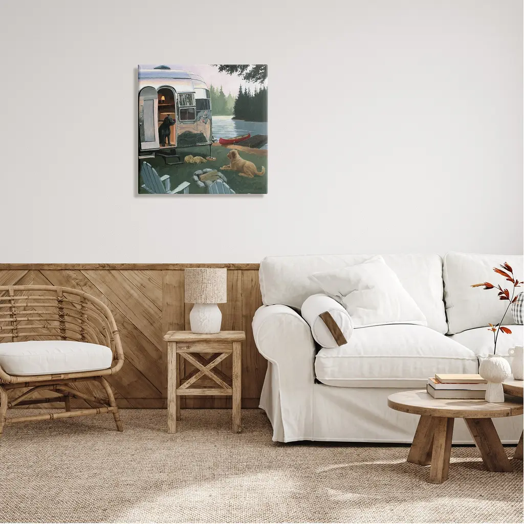 We create our stretched canvas to the highest standards. Using only the highest quality inks and canvas on Mimaki printers, we hand-cut and stretch each piece over a 1.5-inch thick wooden frame for hanging. As a result, the art comes ready to hang on the sturdy ledge with no installation required. Stupell Wall Art is made in the USA.Features: Dimensions: 17 x 1.5 x 17 InchesStretched Canvas Sizes Include Standard: 17 x 1.5 x 17 Large: 24 x 1.5 x 24 X-Large: 30 x 1.5 x 30 Oversized: 36 x 1.5 x 36Wall Art is Ready to Hang with Hardware Free Hanging. No installation required. For Easy Set Up Lean or Layer Artwork on Shelf or Against Wall.Our stretched canvas is created with the highest standards. We use only the highest quality inks and canvas on our in house Mimaki printers, and then hand cut and stretch each piece over a 1.5 inch thick wooden frame for hanging. Made In USA.Artwork Relates To: Boat, Canoe, Transportation, Vehicle, Animal, Canine, Dog, Mammal, Pet, Camping, Nature, Landscape, WoodlandDesign by James Wiens