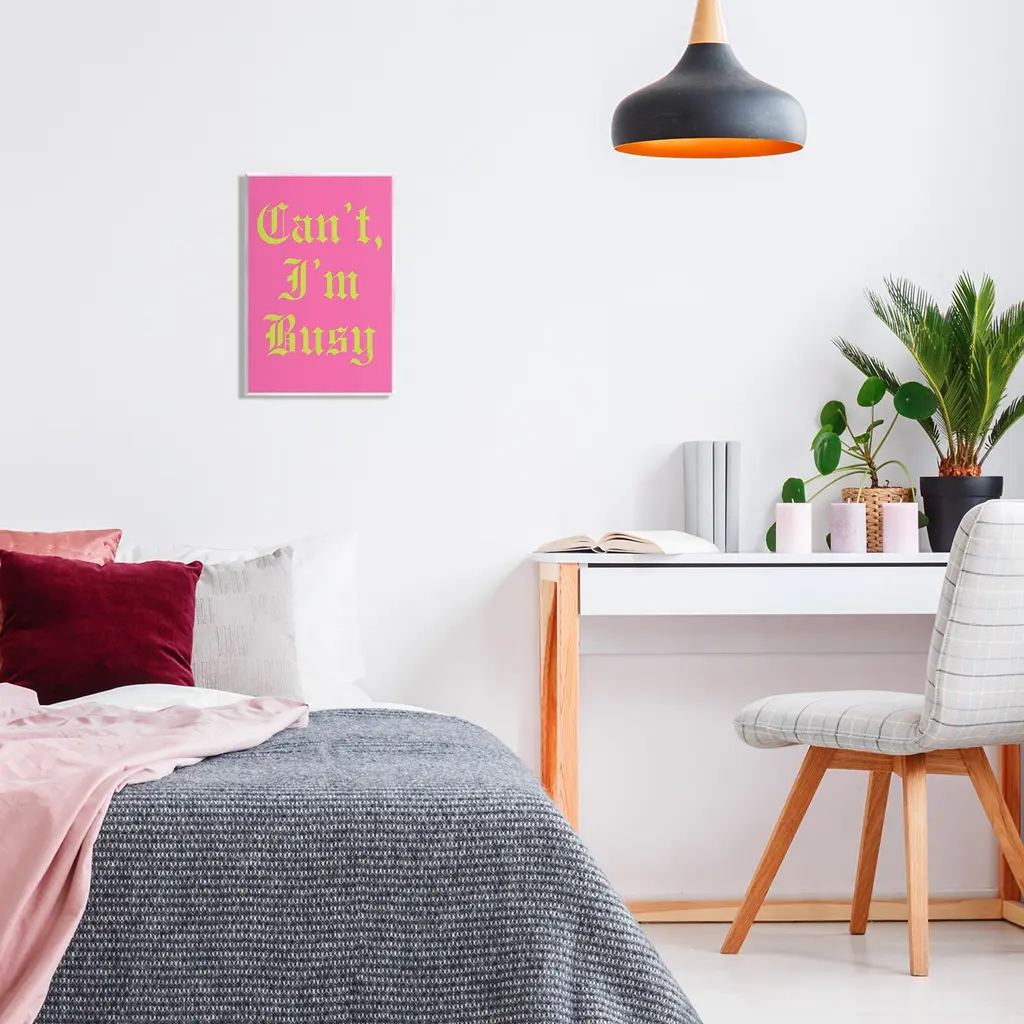 Our wall plaques start as high-quality lithograph prints mounted on durable 0.5-inch thick MDF wood. Each piece is hand finished and comes with a fresh layer of white foil on the sides to give it a crisp, clean look. Plaques arrive ready to hang without installation and come with removable plastic corners to keep them from damage in transit. Wall Art is made in the USA.Features: Dimensions: 10 x 0.5 x 15 InchesWall Plaque Sizes Include Standard: 10 x 0.5 x 15 Oversized: 13 x 0.5 x 19Wall Art is Ready to Hang with Hardware Free Hanging. No installation required. For Easy Set Up Lean or Layer Artwork on Shelf or Against Wall.All of our wall plaques start off as high quality lithograph prints that are then mounted on durable 0.5 inch thick MDF wood. Each piece is hand finished and comes with a fresh layer of foil on the sides to give it a crisp clean look. Made In USA.Artwork Relates To: Phrase, Pink, Bold, Phrase, Can't I'm BusyDesign by House of Lulu