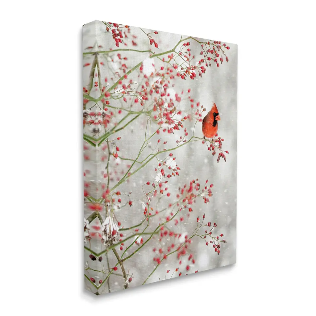 We create our stretched canvas to the highest standards. Using only the highest quality inks and canvas on Mimaki printers, we hand-cut and stretch each piece over a 1.5-inch thick wooden frame for hanging. As a result, the art comes ready to hang on the sturdy ledge with no installation required. Stupell Wall Art is made in the USA.Features: Dimensions: 16 x 1.5 x 20 InchesStretched Canvas Sizes Include Standard: 16 x 1.5 x 20 Large: 20 x 1.5 x 30 X-Large: 30 x 1.5 x 40 Oversized: 36 x 1.5 x 48Wall Art is Ready to Hang with Hardware Free Hanging. No installation required. For Easy Set Up Lean or Layer Artwork on Shelf or Against Wall.Our stretched canvas is created with the highest standards. We use only the highest quality inks and canvas on our in house Mimaki printers, and then hand cut and stretch each piece over a 1.5 inch thick wooden frame for hanging. Made In USA.Artwork Relates To: Plant, Animal, Bird, Cardinal, Nature, Snow, SeasonalDesign by Carrie Ann Grippo-Pike
