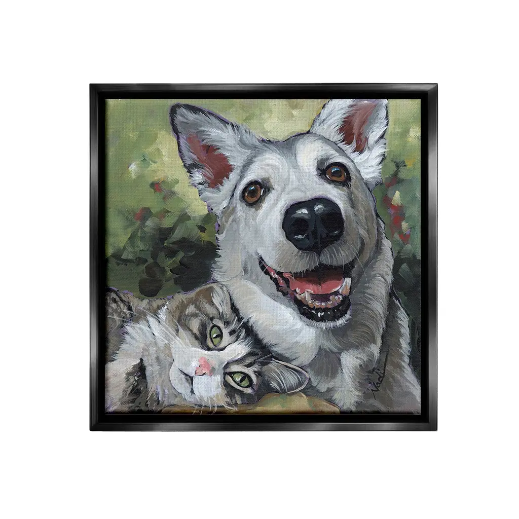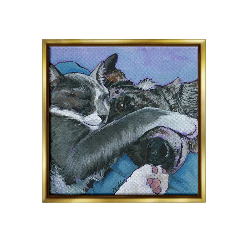 Elevate your home or office to the next level with Stupell Framed Floating Canvas Wall Art. Our premium hand-stretched canvas is mounted securely into a sturdy lightweight frame. The museum-style gap between the wrapped canvas and the box frame gives the illusion of floating artwork. Stupell Wall Art is made in the USA.Features: Dimensions: 18 x 1.7 x 18 Frame, 17 x 1.5 x 17 Canvas ArtFloating Frame Canvas Products are available in sizes 18"x18" and 25"x25". All Floating Frame Canvas Products have a 1.7" Depth.Wall Art is Ready to Hang with Hardware Free Hanging. No Installation required. For Easy Set Up Lean or Layer Artwork on Shelf or Against Wall. Artwork is Permently Fixed into the Frame.Our elevated 1.7" Thick Floating Frame is the perfect complement to our canvas style Wall Art. We use only the highest quality inks in house with industry leading printing solutions. Canvas is hand stretched over a durable wood foundation and then mounted securly into a Modern Box Frame. Made in the USA.Artwork Relates To: Animal, Dog, Pet, Cat, Cuddle, Sleeping, CozyDesign by Nadi Spencer
