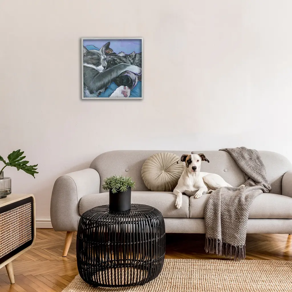 Add dimension to any room with our textured Framed Giclee Artwork. Our framed artwork is securely mounted into a 1.5-inch thick wood grain frame and ready to hang. Frames are available in three alluring styles: black, gray farmhouse and white. In addition, you should check out our oversized options if you want a statement piece. Stupell Wall Art is made in the USA.Features: Dimensions: 12 x 1.5 x 12 FramedFramed Giclee Product Sizes Include 12"x12", 17"x17", and 24"x24". Framed Giclee Products have a 1.5" Depth. Wall Art is Ready to Hang with Hardware Free Hanging. No installation required. For Easy Set Up Lean or Layer Artwork on Shelf or Against Wall.Our giclée prints are carefully mounted on a durable MDF backing, and then perfectly finished in a 1.5 inch thick woodgrain frame. Mounted frame colors include black, gray farmhouse and white. Made In USA.Artwork Relates To: Animal, Dog, Pet, Cat, Cuddle, Sleeping, CozyDesign by Nadi Spencer