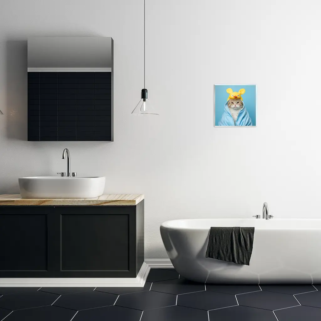 Our wall plaques start as high-quality lithograph prints mounted on durable 0.5-inch thick MDF wood. Each piece is hand finished and comes with a fresh layer of white foil on the sides to give it a crisp, clean look. Plaques arrive ready to hang without installation and come with removable plastic corners to keep them from damage in transit. Stupell Wall Art is made in the USA.Features: Dimensions: 12 x 0.5 x 12 InchesWall Art is Ready to Hang with Hardware Free Hanging. No installation required. For Easy Set Up Lean or Layer Artwork on Shelf or Against Wall.All of our wall plaques start off as high quality lithograph prints that are then mounted on durable 0.5 inch thick MDF wood. Each piece is hand finished and comes with a fresh layer of foil on the sides to give it a crisp clean look. Made In USA.Artwork Relates To: Tub, Bathing, Bathtub, Bathroom, Animal, Pet, CatDesign by RB
