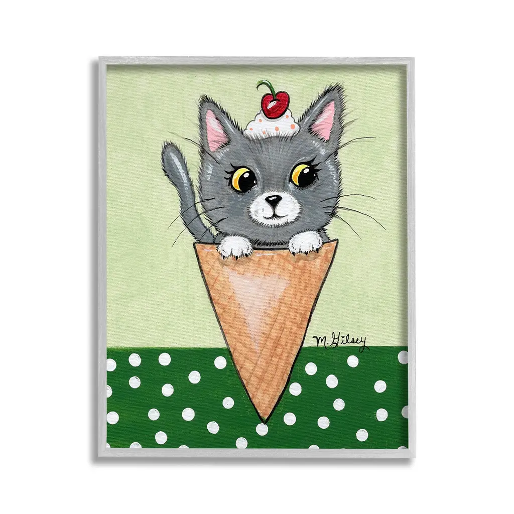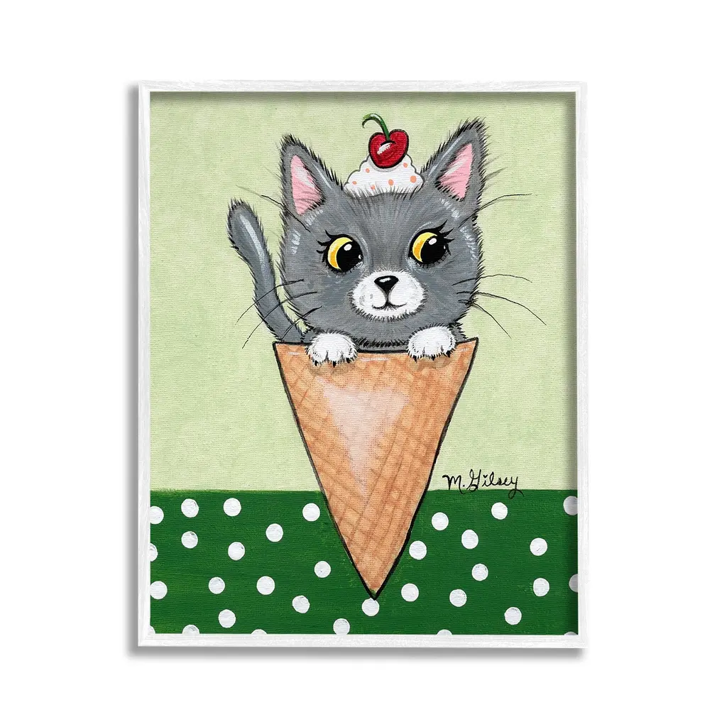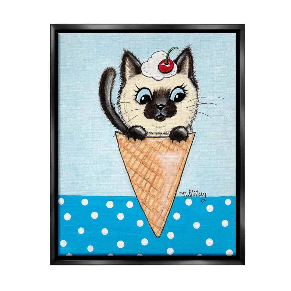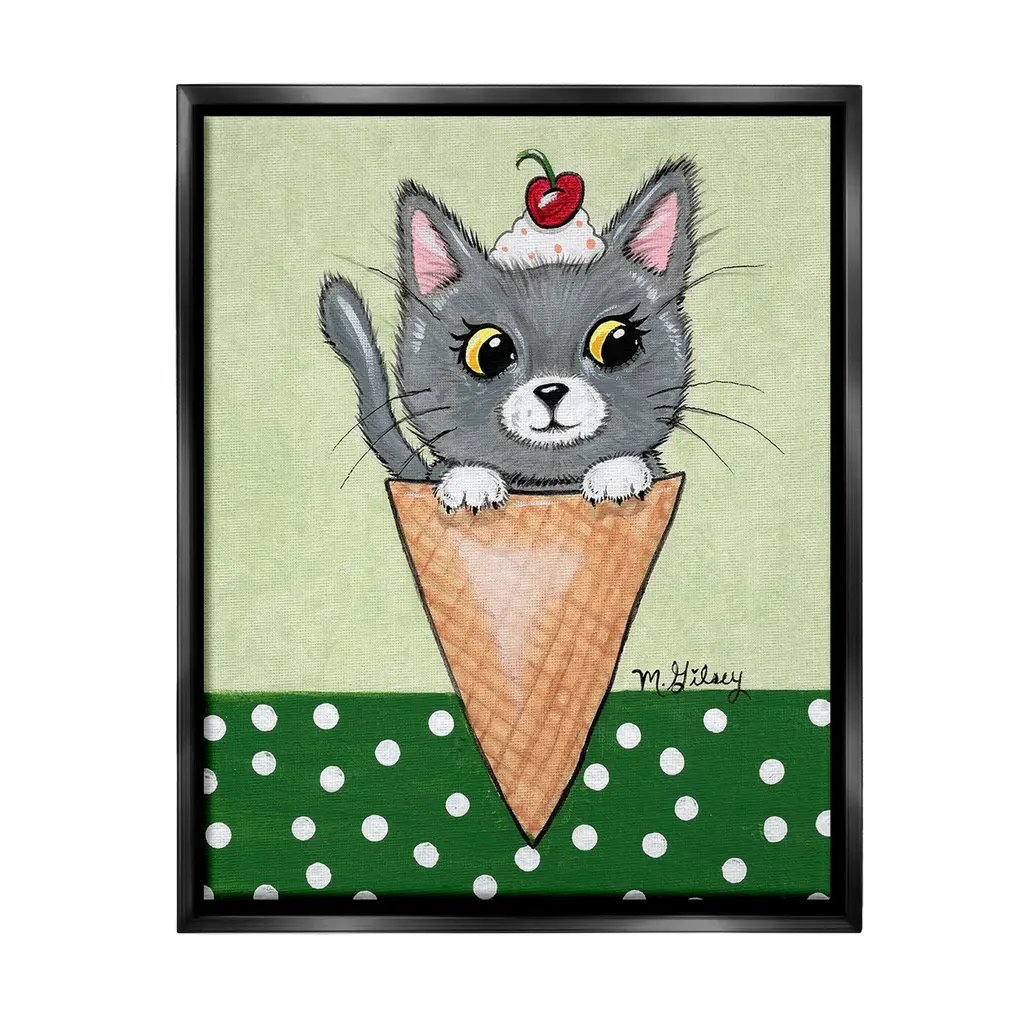 Elevate your home or office to the next level with Stupell Framed Floating Canvas Wall Art. Our premium hand-stretched canvas is mounted securely into a sturdy lightweight frame. The museum-style gap between the wrapped canvas and the box frame gives the illusion of floating artwork. Stupell Wall Art is made in the USA.Features: Dimensions: 17 x 1.7 x 21 Frame, 16 x 1.5 x 20 Canvas ArtFloating Frame Canvas Products are available in sizes 17"x21" and 25"x31". All Floating Frame Canvas Products have a 1.7" Depth.Wall Art is Ready to Hang with Hardware Free Hanging. No Installation required. For Easy Set Up Lean or Layer Artwork on Shelf or Against Wall. Artwork is Permently Fixed into the Frame.Our elevated 1.7" Thick Floating Frame is the perfect complement to our canvas style Wall Art. We use only the highest quality inks in house with industry leading printing solutions. Canvas is hand stretched over a durable wood foundation and then mounted securly into a Modern Box Frame. Made in the USA.Artwork Relates To: Dessert, Food, Ice Cream, Animal, Cat, Mammal, Pet, Sundae, Polka Dot, Pattern, KittenDesign by Michelle Gilsey