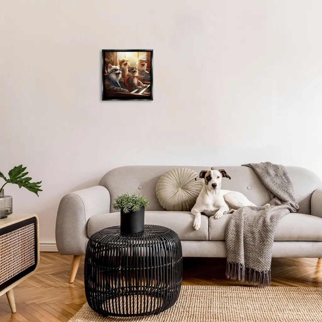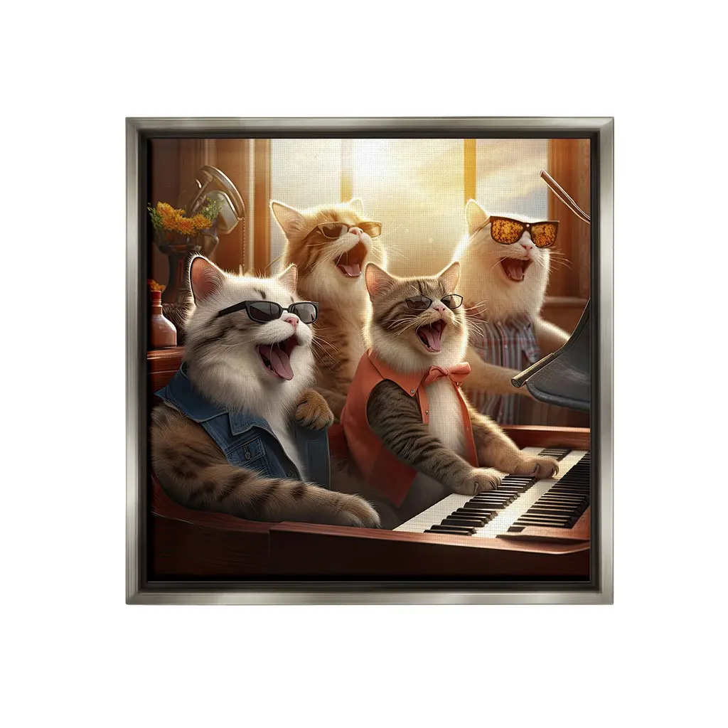 Elevate your home or office to the next level with Stupell Framed Floating Canvas Wall Art. Our premium hand-stretched canvas is mounted securely into a sturdy lightweight frame. The museum-style gap between the wrapped canvas and the box frame gives the illusion of floating artwork. Stupell Wall Art is made in the USA.Features: Dimensions: 18 x 1.7 x 18 Frame, 17 x 1.5 x 17 Canvas ArtFloating Frame Canvas Products are available in sizes 18"x18" and 25"x25". All Floating Frame Canvas Products have a 1.7" Depth.Wall Art is Ready to Hang with Hardware Free Hanging. No Installation required. For Easy Set Up Lean or Layer Artwork on Shelf or Against Wall. Artwork is Permently Fixed into the Frame.Our elevated 1.7" Thick Floating Frame is the perfect complement to our canvas style Wall Art. We use only the highest quality inks in house with industry leading printing solutions. Canvas is hand stretched over a durable wood foundation and then mounted securly into a Modern Box Frame. Made in the USA.Artwork Relates To: Animal, Cat, Mammal, Pet, Humor, Funny, Music, Musician, PianoDesign by Jim Baldwin