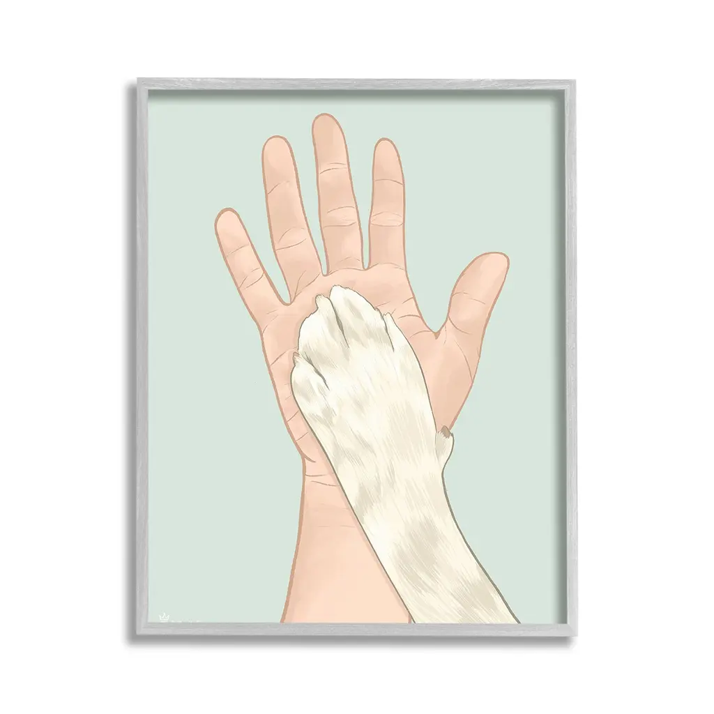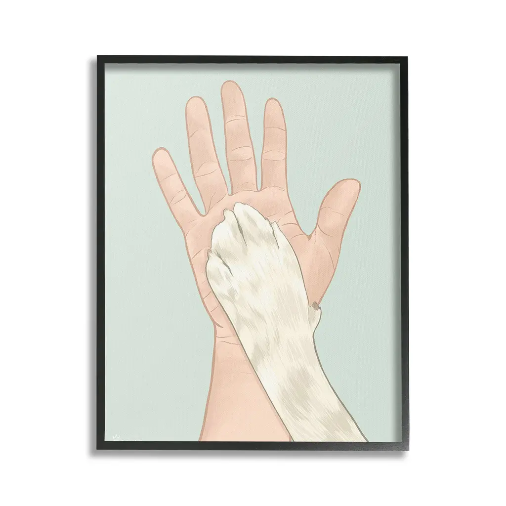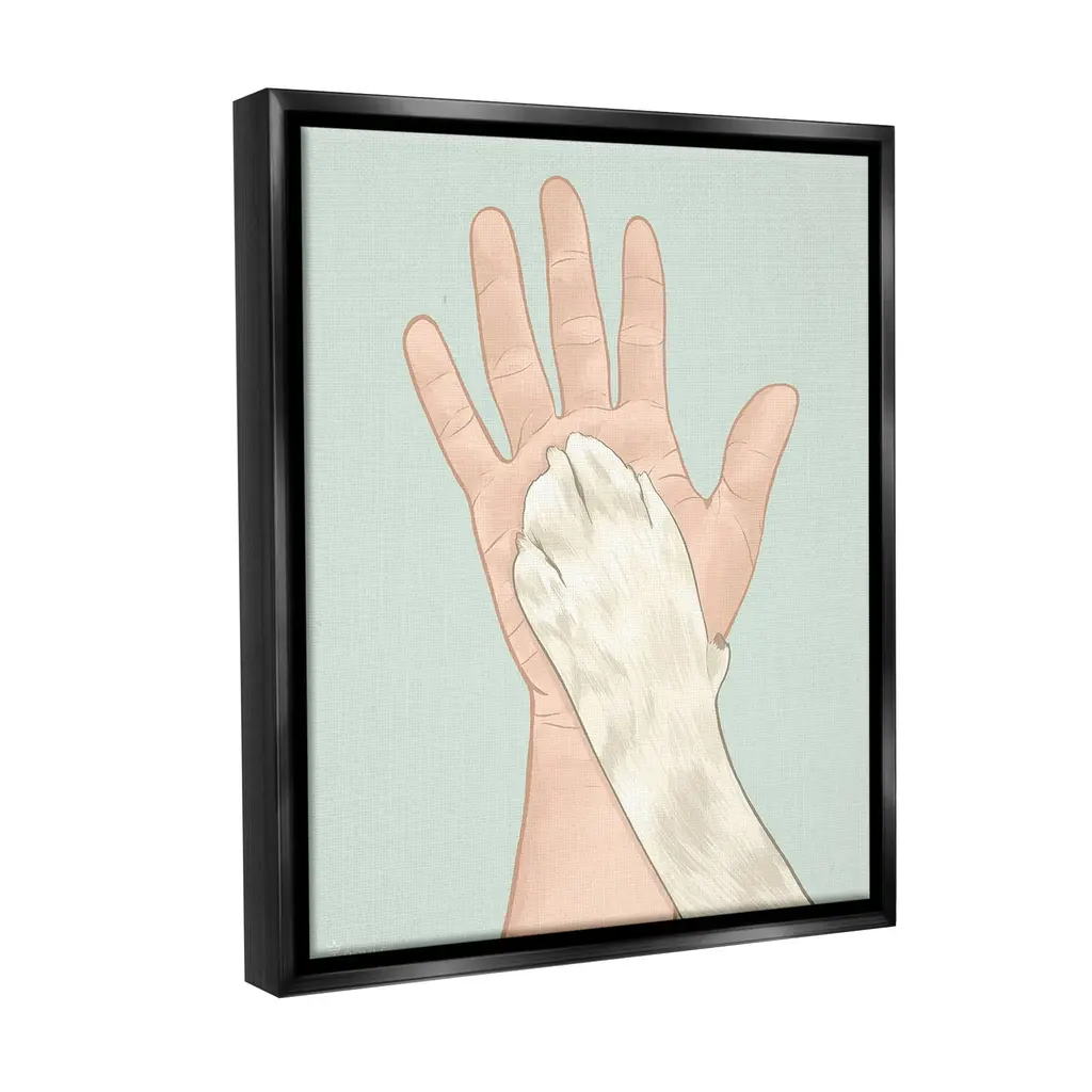Elevate your home or office to the next level with Stupell Framed Floating Canvas Wall Art. Our premium hand-stretched canvas is mounted securely into a sturdy lightweight frame. The museum-style gap between the wrapped canvas and the box frame gives the illusion of floating artwork. Stupell Wall Art is made in the USA.Features: Dimensions: 17 x 1.7 x 21 Frame, 16 x 1.5 x 20 Canvas ArtFloating Frame Canvas Products are available in sizes 17"x21" and 25"x31". All Floating Frame Canvas Products have a 1.7" Depth.Wall Art is Ready to Hang with Hardware Free Hanging. No Installation required. For Easy Set Up Lean or Layer Artwork on Shelf or Against Wall. Artwork is Permently Fixed into the Frame.Our elevated 1.7" Thick Floating Frame is the perfect complement to our canvas style Wall Art. We use only the highest quality inks in house with industry leading printing solutions. Canvas is hand stretched over a durable wood foundation and then mounted securly into a Modern Box Frame. Made in the USA.Artwork Relates To: Hand, Symbol, High Five, Cat, Paw, Pet, DogDesign by Tara Royle