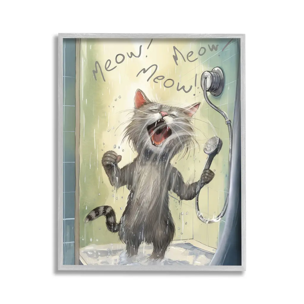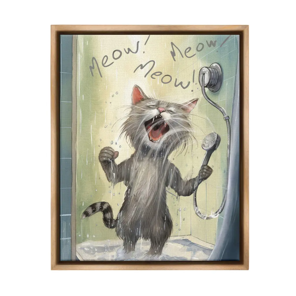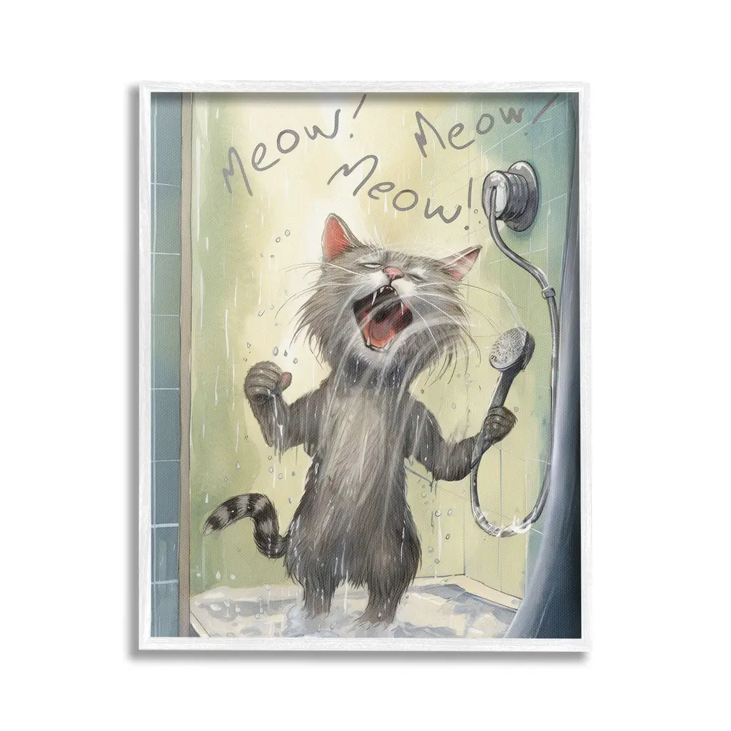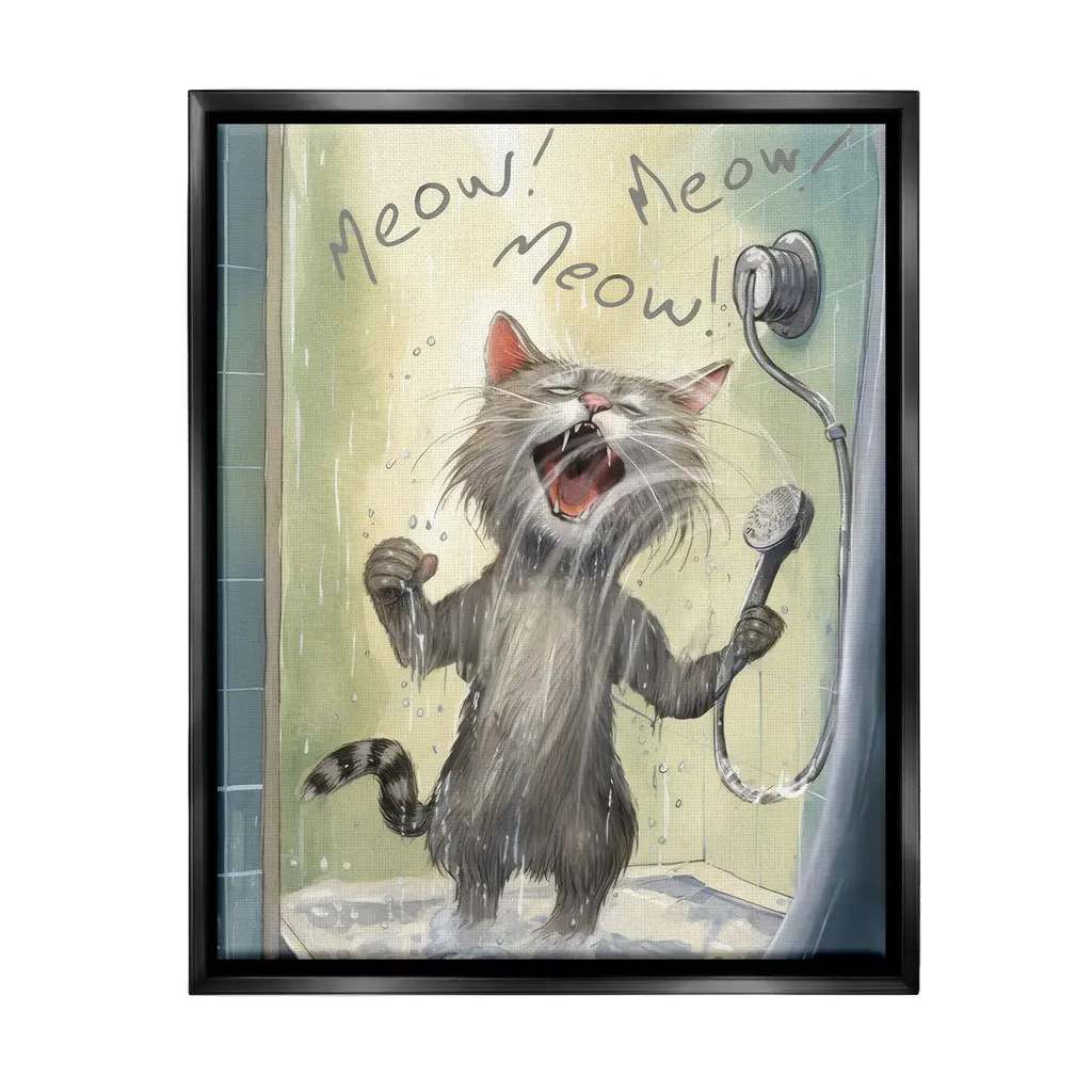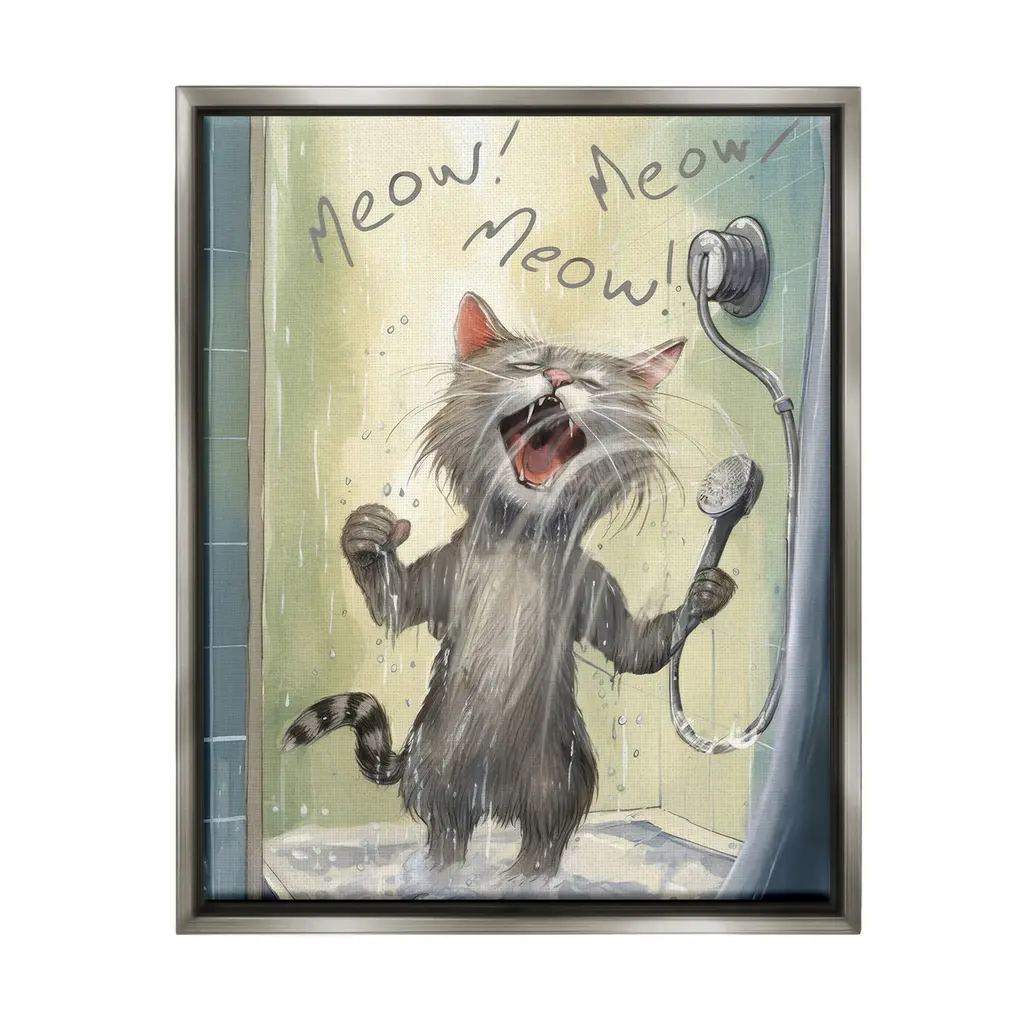 Elevate your home or office to the next level with Stupell Framed Floating Canvas Wall Art. Our premium hand-stretched canvas is mounted securely into a sturdy lightweight frame. The museum-style gap between the wrapped canvas and the box frame gives the illusion of floating artwork. Stupell Wall Art is made in the USA.Features: Dimensions: 17 x 1.7 x 21 Frame, 16 x 1.5 x 20 Canvas ArtFloating Frame Canvas Products are available in sizes 17"x21" and 25"x31". All Floating Frame Canvas Products have a 1.7" Depth.Wall Art is Ready to Hang with Hardware Free Hanging. No Installation required. For Easy Set Up Lean or Layer Artwork on Shelf or Against Wall. Artwork is Permently Fixed into the Frame.Our elevated 1.7" Thick Floating Frame is the perfect complement to our canvas style Wall Art. We use only the highest quality inks in house with industry leading printing solutions. Canvas is hand stretched over a durable wood foundation and then mounted securly into a Modern Box Frame. Made in the USA.Artwork Relates To: Bathroom, Shower, Singing, Animal, Pet, Cat, Kitten, Meow! Meow Meow!Design by PSL Art