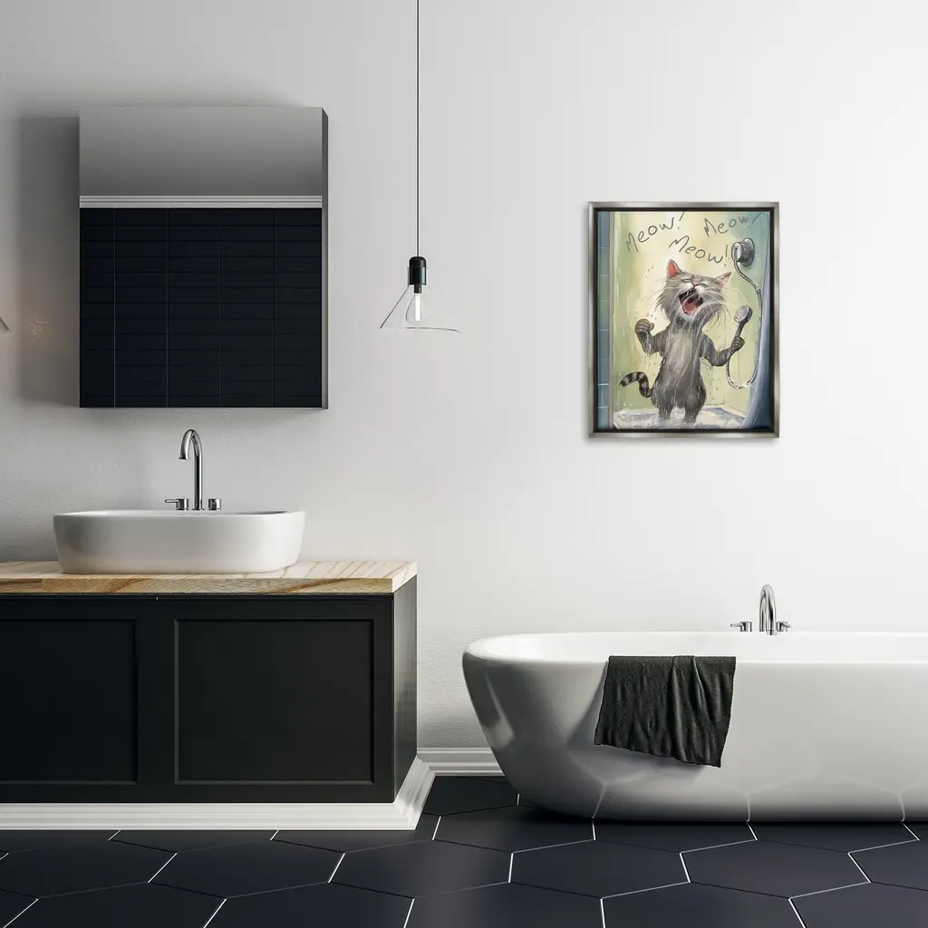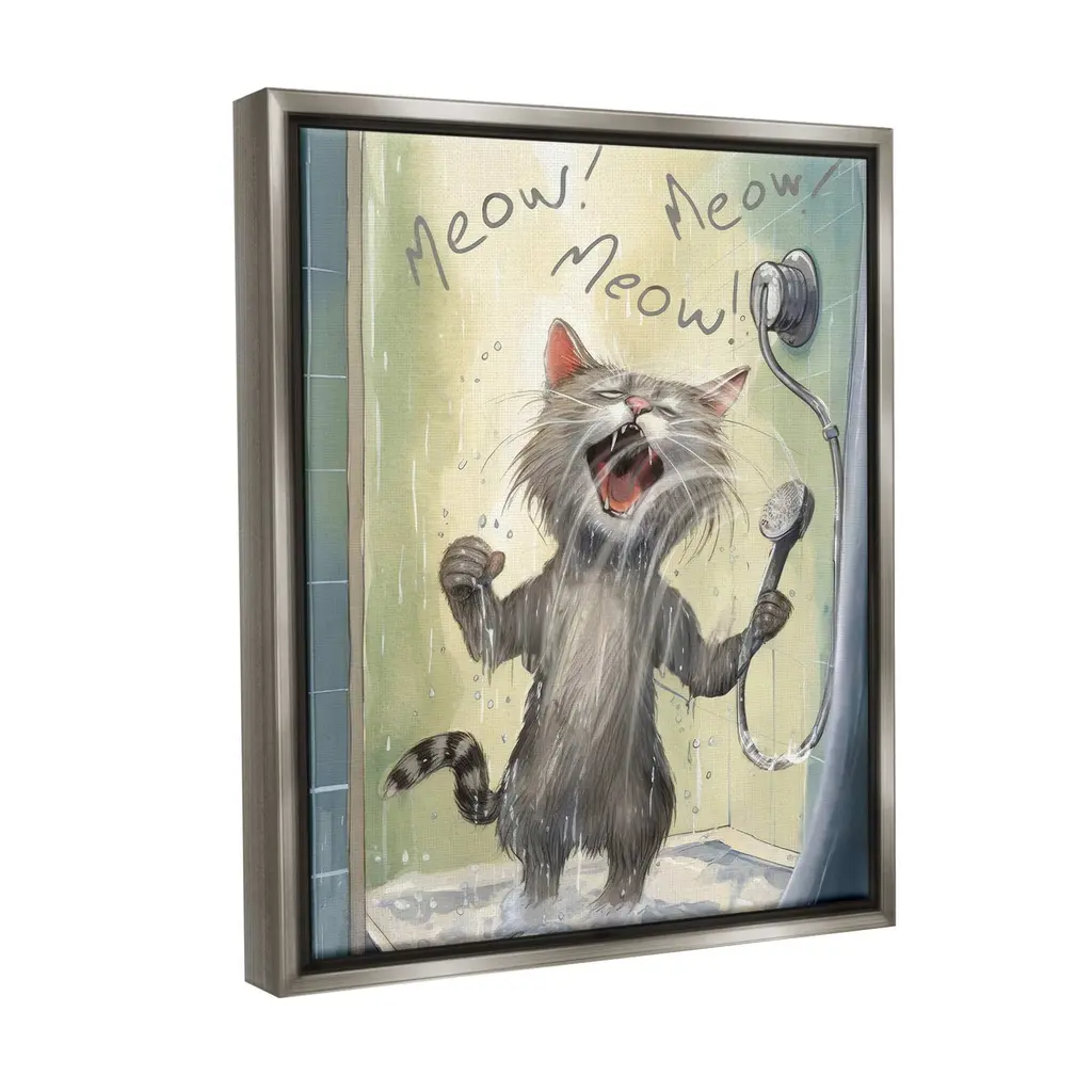 Elevate your home or office to the next level with Stupell Framed Floating Canvas Wall Art. Our premium hand-stretched canvas is mounted securely into a sturdy lightweight frame. The museum-style gap between the wrapped canvas and the box frame gives the illusion of floating artwork. Stupell Wall Art is made in the USA.Features: Dimensions: 17 x 1.7 x 21 Frame, 16 x 1.5 x 20 Canvas ArtFloating Frame Canvas Products are available in sizes 17"x21" and 25"x31". All Floating Frame Canvas Products have a 1.7" Depth.Wall Art is Ready to Hang with Hardware Free Hanging. No Installation required. For Easy Set Up Lean or Layer Artwork on Shelf or Against Wall. Artwork is Permently Fixed into the Frame.Our elevated 1.7" Thick Floating Frame is the perfect complement to our canvas style Wall Art. We use only the highest quality inks in house with industry leading printing solutions. Canvas is hand stretched over a durable wood foundation and then mounted securly into a Modern Box Frame. Made in the USA.Artwork Relates To: Bathroom, Shower, Singing, Animal, Pet, Cat, Kitten, Meow! Meow Meow!Design by PSL Art
