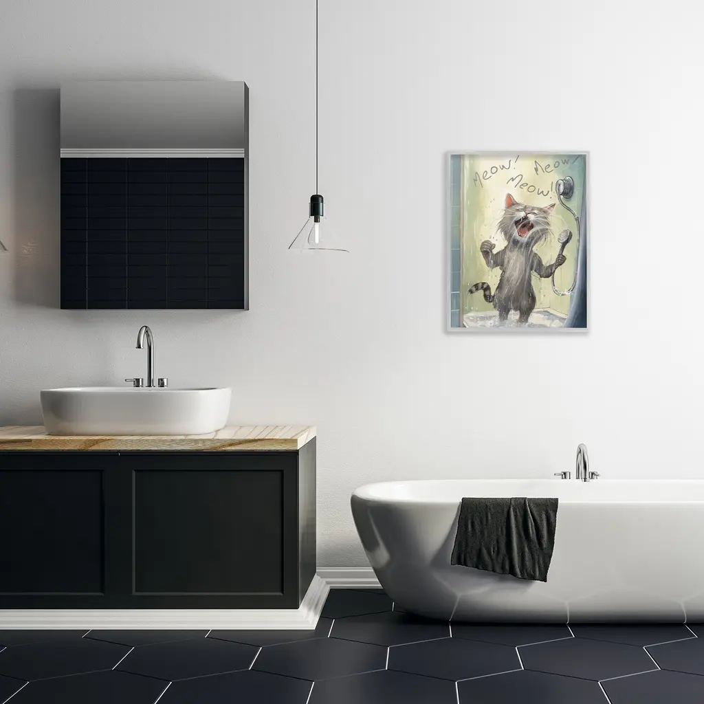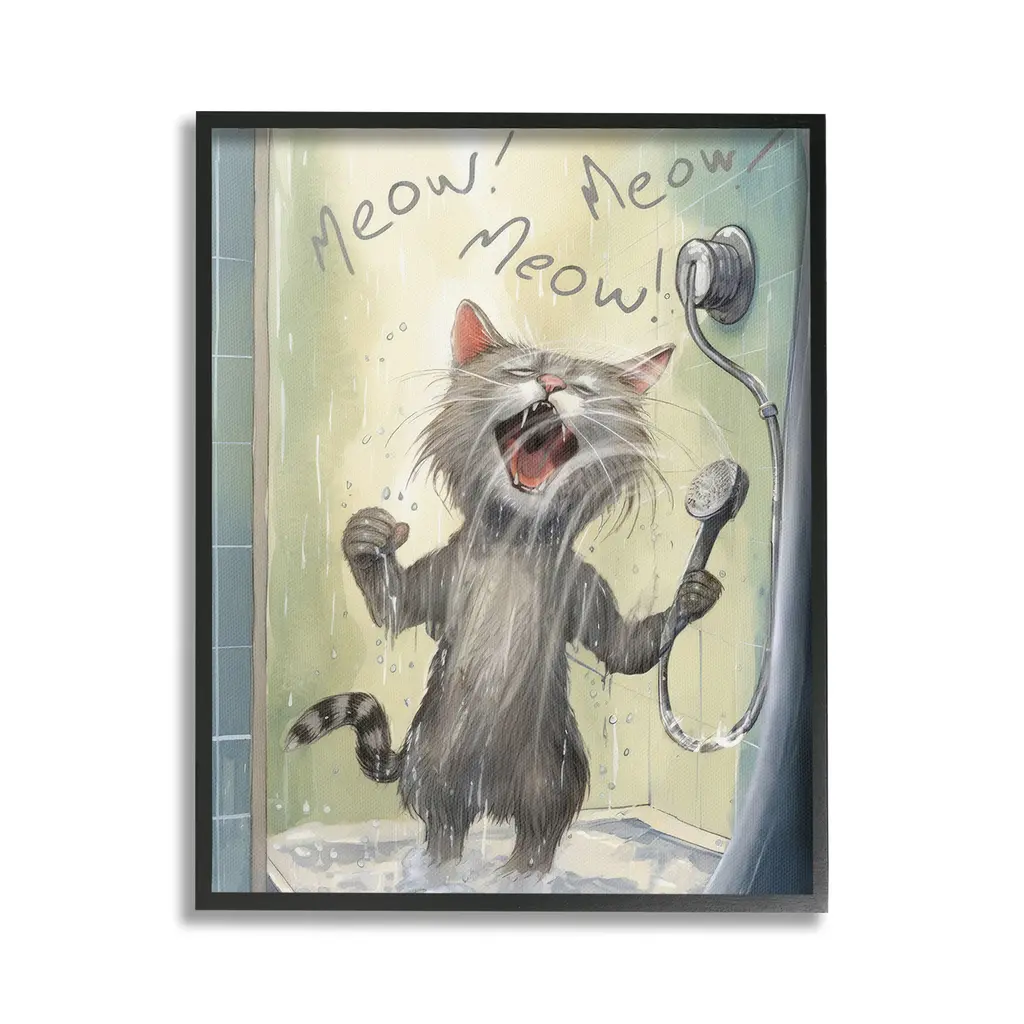 Add dimension to any room with our textured Framed Giclee Artwork. Our framed artwork is securely mounted into a 1.5-inch thick wood grain frame and ready to hang. Frames are available in three alluring styles: black, gray farmhouse and white. In addition, you should check out our oversized options if you want a statement piece. Stupell Wall Art is made in the USA.Features: Dimensions: 11 x 1.5 x 14 FramedFramed Giclee Products are available in the sizes 11"x14", 16"x20" or 24"x30". All Framed Giclee Products have a 1.5" Depth. Wall Art is Ready to Hang with Hardware Free Hanging. No installation required. For Easy Set Up Lean or Layer Artwork on Shelf or Against Wall.Our giclée prints are carefully mounted on a durable MDF backing, and then perfectly finished in a 1.5 inch thick woodgrain frame. Mounted frame colors include black, gray farmhouse and white. Made In USA.Artwork Relates To: Bathroom, Shower, Singing, Animal, Pet, Cat, Kitten, Meow! Meow Meow!Design by PSL Art
