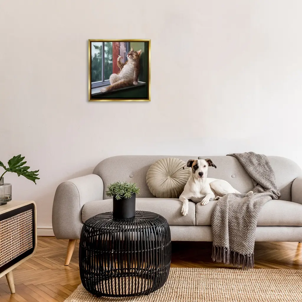 Stupell Cat Smoking Lounging In Window Framed Floater Canvas Wall Art Design By Lucia Heffernan - 25 X 25 - Gold