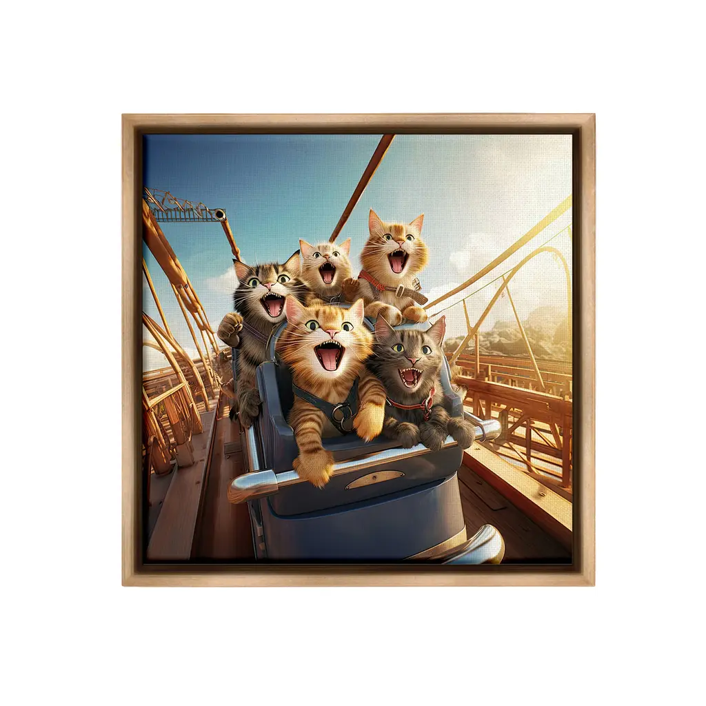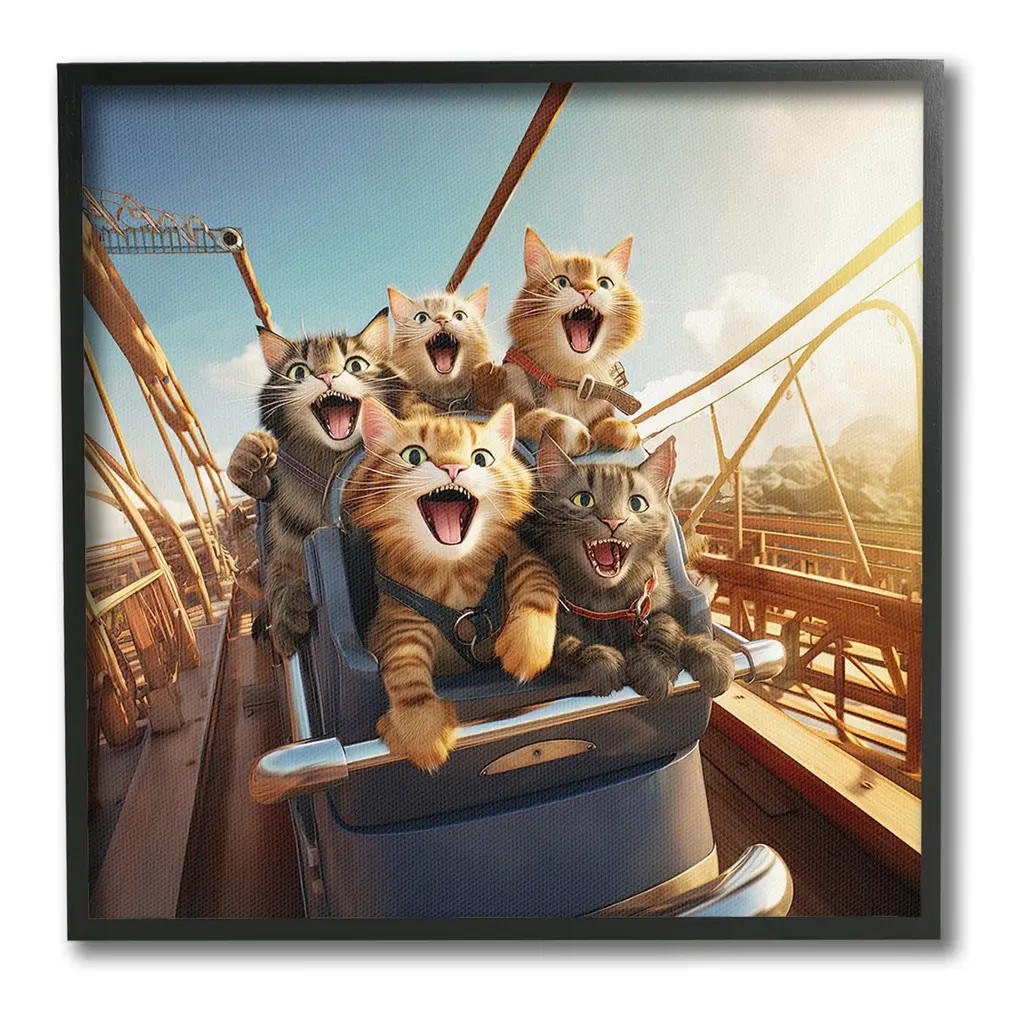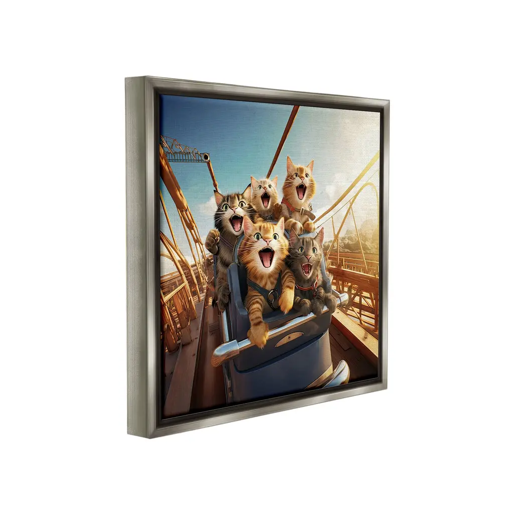 Elevate your home or office to the next level with Stupell Framed Floating Canvas Wall Art. Our premium hand-stretched canvas is mounted securely into a sturdy lightweight frame. The museum-style gap between the wrapped canvas and the box frame gives the illusion of floating artwork. Stupell Wall Art is made in the USA.Features: Dimensions: 18 x 1.7 x 18 Frame, 17 x 1.5 x 17 Canvas ArtFloating Frame Canvas Products are available in sizes 18"x18" and 25"x25". All Floating Frame Canvas Products have a 1.7" Depth.Wall Art is Ready to Hang with Hardware Free Hanging. No Installation required. For Easy Set Up Lean or Layer Artwork on Shelf or Against Wall. Artwork is Permently Fixed into the Frame.Our elevated 1.7" Thick Floating Frame is the perfect complement to our canvas style Wall Art. We use only the highest quality inks in house with industry leading printing solutions. Canvas is hand stretched over a durable wood foundation and then mounted securly into a Modern Box Frame. Made in the USA.Artwork Relates To: Animal, Cat, Mammal, Pet, Humor, Funny, Rollercoaster, Amusement ParkDesign by Jim Baldwin