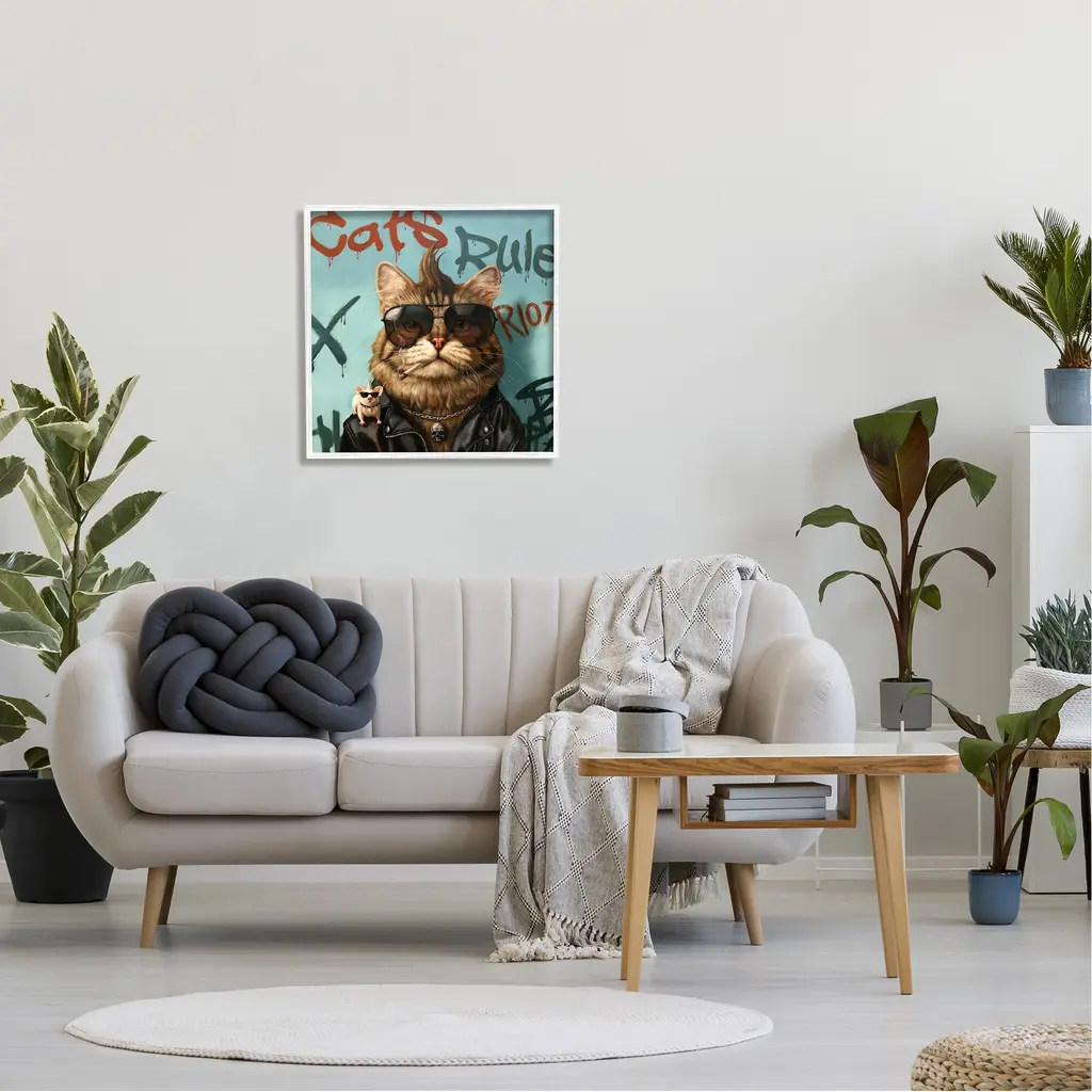 Add dimension to any room with our textured Framed Giclee Artwork. Our framed artwork is securely mounted into a 1.5-inch thick wood grain frame and ready to hang. Frames are available in three alluring styles: black, gray farmhouse and white. In addition, you should check out our oversized options if you want a statement piece. Stupell Wall Art is made in the USA.Features: Dimensions: 12 x 1.5 x 12 FramedFramed Giclee Sizes Include Standard: 12 x 1.5 x 12 Large: 17 x 1.5 x 17 Oversized: 24 x 1.5 x 24Wall Art is Ready to Hang - No Installation or Hardware Needed. For Easy Set Up Lean or Layer Artwork on Shelf or Against Wall.Our giclée prints are carefully mounted on a durable MDF backing, and then perfectly finished in a 1.5 inch thick woodgrain frame. Mounted frame colors include black, gray farmhouse and white. Made In USA.Artwork Relates To: Sunglasses, Painting, Animal, Mammal, Pet, Cat, Graffiti, City, Urban, GraffitiDesign by Lucia Heffernan