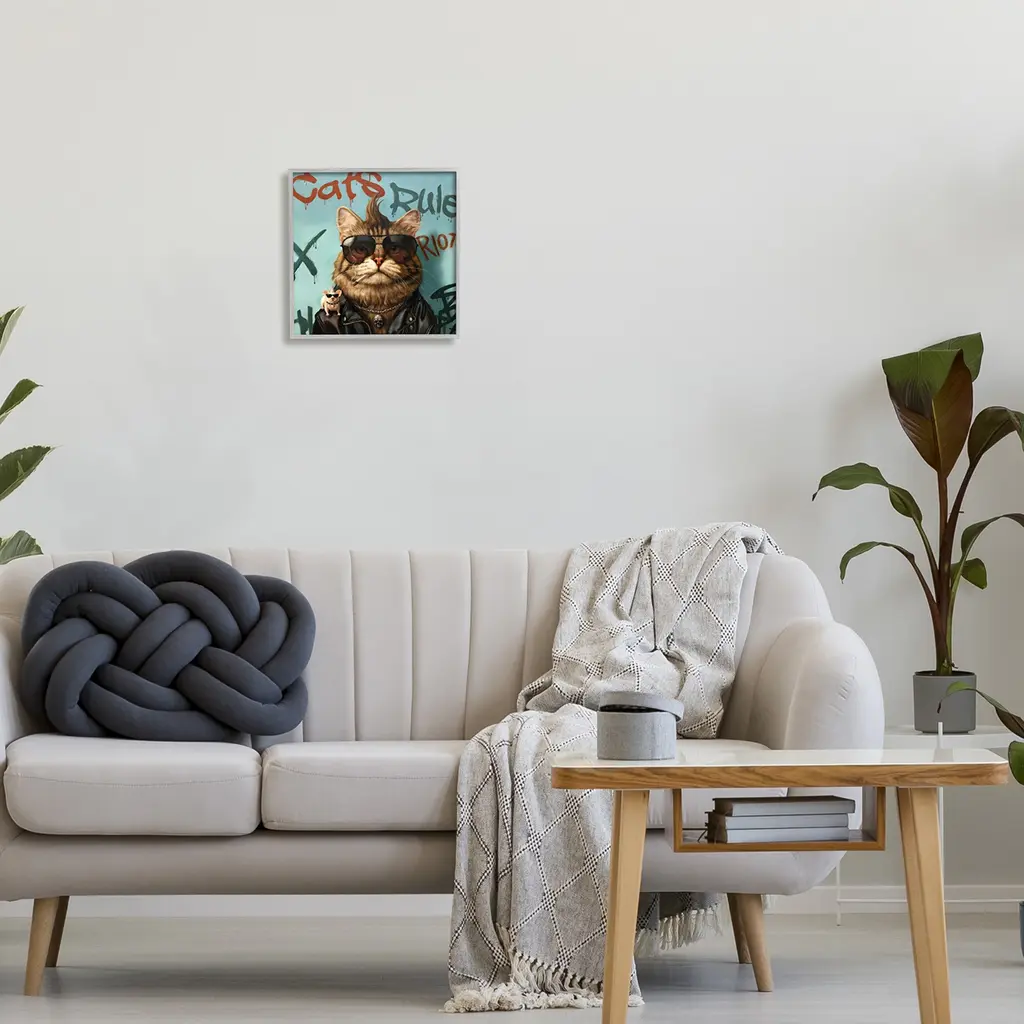 Add dimension to any room with our textured Framed Giclee Artwork. Our framed artwork is securely mounted into a 1.5-inch thick wood grain frame and ready to hang. Frames are available in three alluring styles: black, gray farmhouse and white. In addition, you should check out our oversized options if you want a statement piece. Stupell Wall Art is made in the USA.Features: Dimensions: 12 x 1.5 x 12 FramedFramed Giclee Sizes Include Standard: 12 x 1.5 x 12 Large: 17 x 1.5 x 17 Oversized: 24 x 1.5 x 24Wall Art is Ready to Hang - No Installation or Hardware Needed. For Easy Set Up Lean or Layer Artwork on Shelf or Against Wall.Our giclée prints are carefully mounted on a durable MDF backing, and then perfectly finished in a 1.5 inch thick woodgrain frame. Mounted frame colors include black, gray farmhouse and white. Made In USA.Artwork Relates To: Sunglasses, Painting, Animal, Mammal, Pet, Cat, Graffiti, City, Urban, GraffitiDesign by Lucia Heffernan