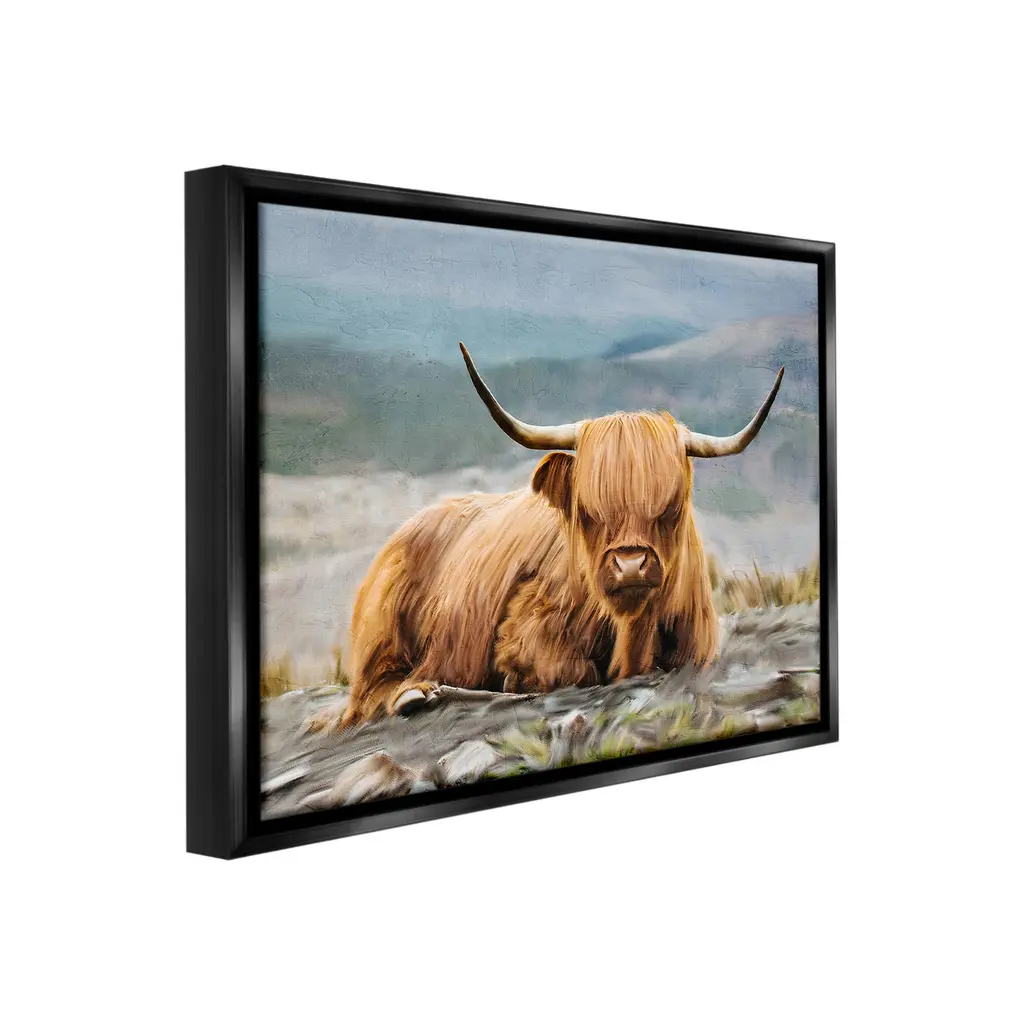 Elevate your home or office to the next level with Stupell Framed Floating Canvas Wall Art. Our premium hand-stretched canvas is mounted securely into a sturdy lightweight frame. The museum-style gap between the wrapped canvas and the box frame gives the illusion of floating artwork. Stupell Wall Art is made in the USA.Features: Dimensions: 21 x 1.7 x 17 Frame, 20 x 1.5 x 16 Canvas ArtFloating Frame Canvas Products are available in sizes 21"x17" and 31"x25". All Floating Frame Canvas Products have a 1.7" Depth.Wall Art is Ready to Hang with Hardware Free Hanging. No Installation required. For Easy Set Up Lean or Layer Artwork on Shelf or Against Wall. Artwork is Permently Fixed into the Frame.Our elevated 1.7" Thick Floating Frame is the perfect complement to our canvas style Wall Art. We use only the highest quality inks in house with industry leading printing solutions. Canvas is hand stretched over a durable wood foundation and then mounted securly into a Modern Box Frame. Made in the USA.Artwork Relates To: Animal, Bull, Mammal, Cattle, Wildlife, Longhorn, Cow, Nature, LandscapeDesign by Kim Allen
