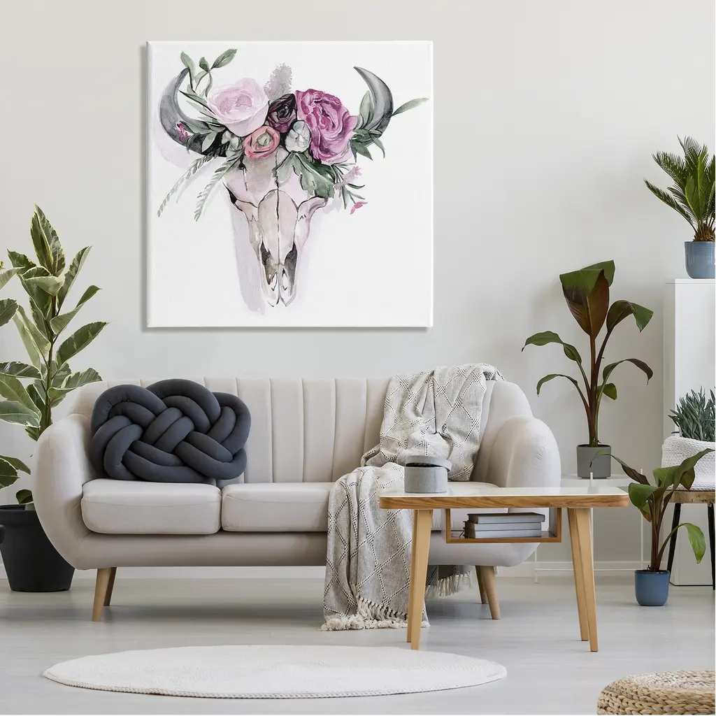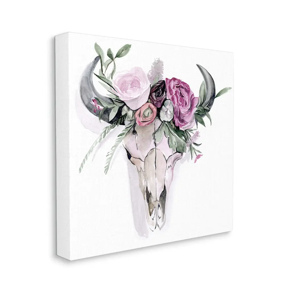 We create our stretched canvas to the highest standards. Using only the highest quality inks and canvas on Mimaki printers, we hand-cut and stretch each piece over a 1.5-inch thick wooden frame for hanging. As a result, the art comes ready to hang on the sturdy ledge with no installation required. Stupell Wall Art is made in the USA.Features: Dimensions: 17 x 1.5 x 17 InchesStretched Canvas Sizes Include Standard: 17 x 1.5 x 17 Large: 24 x 1.5 x 24 X-Large: 30 x 1.5 x 30 Oversized: 36 x 1.5 x 36Wall Art is Ready to Hang - No Installation or Hardware Needed. For Easy Set Up Lean or Layer Artwork on Shelf or Against Wall.Our stretched canvas is created with the highest standards. We use only the highest quality inks and canvas on our in house Mimaki printers, and then hand cut and stretch each piece over a 1.5 inch thick wooden frame for hanging. Made In USA.Artwork Relates To: Flower, Floral, Rose, Animal, Cattle, Cattle Skull, BohoDesign by Jennifer Paxton Parker