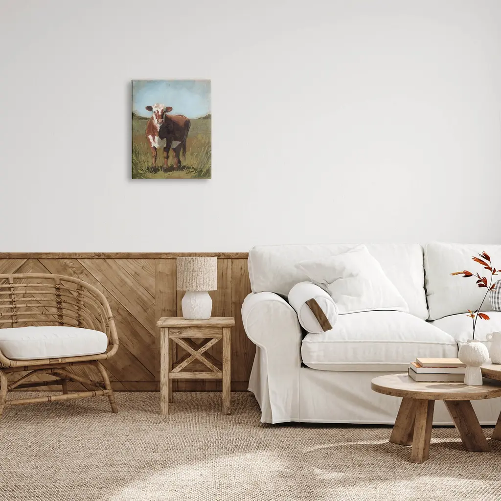 Proudly made in the USA, Our stretched canvas is created with the highest standards. We use only the highest quality inks and canvas on our in house Mimaki printers, and then hand cut and stretch each piece over a 1.5 inch thick wooden frame for hanging. The art comes ready to hang with no installation required.Features: Dimensions: 16 x 1.5 x 20 InchesStretched Canvas Sizes Include Standard: 16 x 1.5 x 20 Large: 20 x 1.5 x 30 X-Large: 30 x 1.5 x 40 Oversized: 36 x 1.5 x 48Wall Art is Ready to Hang - No Installation or Hardware Needed. For Easy Set Up Lean or Layer Artwork on Shelf or Against Wall.Our stretched canvas is created with the highest standards. We use only the highest quality inks and canvas on our in house Mimaki printers, and then hand cut and stretch each piece over a 1.5 inch thick wooden frame for hanging. Made In USA.Artwork Relates To: Cow, Cattle, Mammal, Animal, Calf, Outdoors, Countryside, Dairy Cow, RuralDesign by Sara Baker