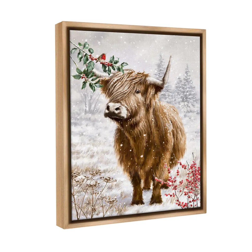 Elevate your home or office to the next level with Stupell Framed Floating Canvas Wall Art. Our premium hand-stretched canvas is mounted securely into a sturdy lightweight frame. The museum-style gap between the wrapped canvas and the box frame gives the illusion of floating artwork. Stupell Wall Art is made in the USA.Features: Dimensions: 17 x 1.7 x 21 Frame, 16 x 1.5 x 20 Canvas ArtFloating Frame Canvas Products are available in sizes 17"x21" and 25"x31". All Floating Frame Canvas Products have a 1.7" Depth.Wall Art is Ready to Hang with Hardware Free Hanging. No Installation required. For Easy Set Up Lean or Layer Artwork on Shelf or Against Wall. Artwork is Permently Fixed into the Frame.Our elevated 1.7" Thick Floating Frame is the perfect complement to our canvas style Wall Art. We use only the highest quality inks in house with industry leading printing solutions. Canvas is hand stretched over a durable wood foundation and then mounted securly into a Modern Box Frame. Made in the USA.Artwork Relates To: Animal, Cattle, Mammal, Cow, Winter, Holiday, Landscape, Snow, NatureDesign by Ian Saxton