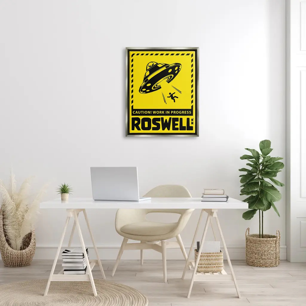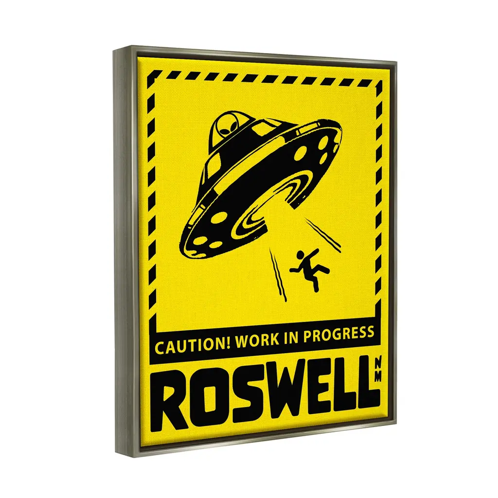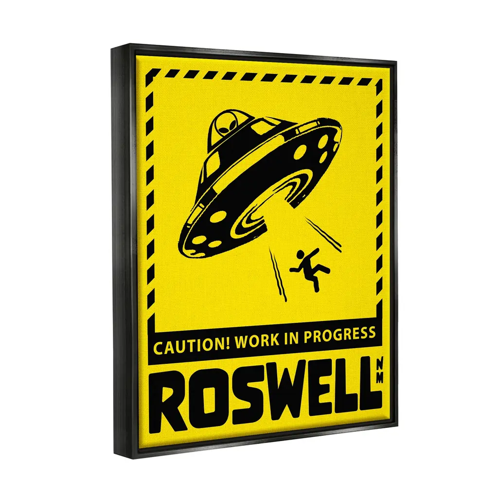 Elevate your home or office to the next level with Stupell Framed Floating Canvas Wall Art. Our premium hand-stretched canvas is mounted securely into a sturdy lightweight frame. The museum-style gap between the wrapped canvas and the box frame gives the illusion of floating artwork. Stupell Wall Art is made in the USA.Features: Dimensions: 17 x 1.7 x 21 Frame, 16 x 1.5 x 20 Canvas ArtFloating Frame Sizes Include Standard: 17 x 1.7 x 21 Oversized: 25 x 1.7 x 31Wall Art is Ready to Hang - No Installation or Hardware Needed. For Easy Set Up Lean or Layer Artwork on Shelf or Against Wall.Our elevated 1.7" Thick Floating Frame is the perfect complement to our canvas style Wall Art. We use only the highest quality inks in house with industry leading printing solutions. Canvas is hand stretched over a durable wood foundation and then mounted securly into a Modern Box Frame. Made in the USA.Artwork Relates To: Silhouette, UFO, Roswell New Mexico, Caution Work In ProgressDesign by Ziwei Li