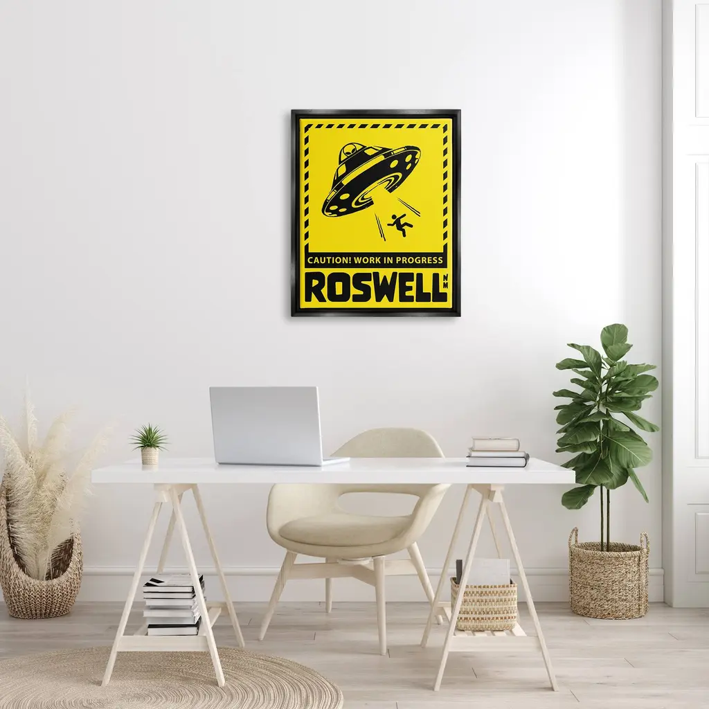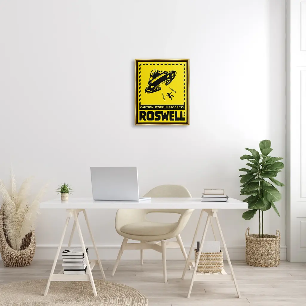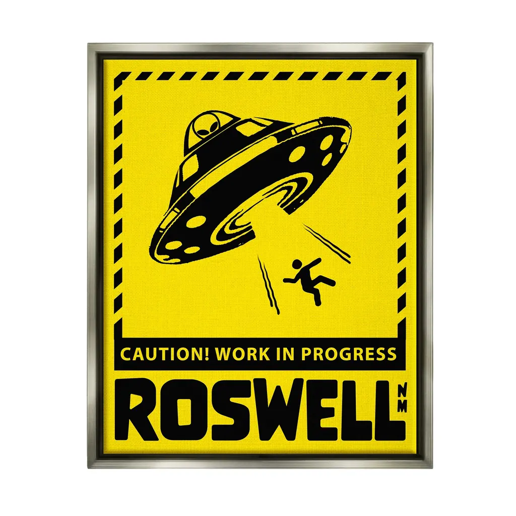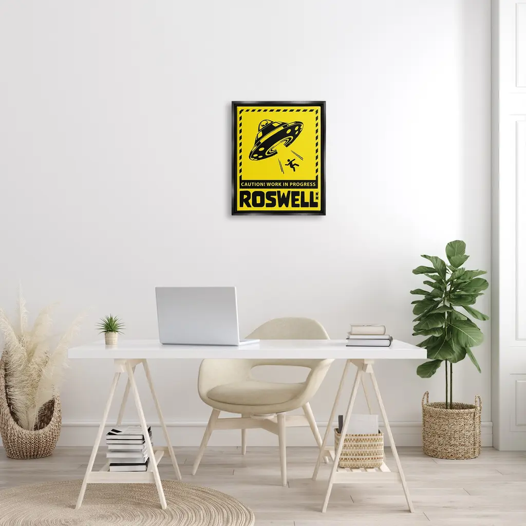 Elevate your home or office to the next level with Stupell Framed Floating Canvas Wall Art. Our premium hand-stretched canvas is mounted securely into a sturdy lightweight frame. The museum-style gap between the wrapped canvas and the box frame gives the illusion of floating artwork. Stupell Wall Art is made in the USA.Features: Dimensions: 17 x 1.7 x 21 Frame, 16 x 1.5 x 20 Canvas ArtFloating Frame Sizes Include Standard: 17 x 1.7 x 21 Oversized: 25 x 1.7 x 31Wall Art is Ready to Hang - No Installation or Hardware Needed. For Easy Set Up Lean or Layer Artwork on Shelf or Against Wall.Our elevated 1.7" Thick Floating Frame is the perfect complement to our canvas style Wall Art. We use only the highest quality inks in house with industry leading printing solutions. Canvas is hand stretched over a durable wood foundation and then mounted securly into a Modern Box Frame. Made in the USA.Artwork Relates To: Silhouette, UFO, Roswell New Mexico, Caution Work In ProgressDesign by Ziwei Li
