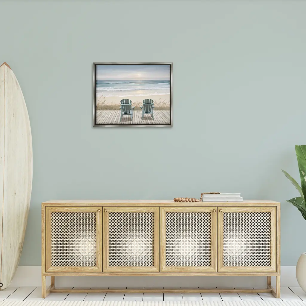 Elevate your home or office to the next level with Stupell Framed Floating Canvas Wall Art. Our premium hand-stretched canvas is mounted securely into a sturdy lightweight frame. The museum-style gap between the wrapped canvas and the box frame gives the illusion of floating artwork. Stupell Wall Art is made in the USA.Features: Dimensions: 21 x 1.7 x 17 Frame, 20 x 1.5 x 16 Canvas ArtFloating Frame Canvas Products are available in sizes 21"x17" and 31"x25". All Floating Frame Canvas Products have a 1.7" Depth.Wall Art is Ready to Hang with Hardware Free Hanging. No Installation required. For Easy Set Up Lean or Layer Artwork on Shelf or Against Wall. Artwork is Permently Fixed into the Frame.Our elevated 1.7" Thick Floating Frame is the perfect complement to our canvas style Wall Art. We use only the highest quality inks in house with industry leading printing solutions. Canvas is hand stretched over a durable wood foundation and then mounted securly into a Modern Box Frame. Made in the USA.Artwork Relates To: Sea, Water, Beach, Coast, Shoreline, Sky, Scenery, Horizon, Landscape, Summer, Beach ChairDesign by Amber Sterling
