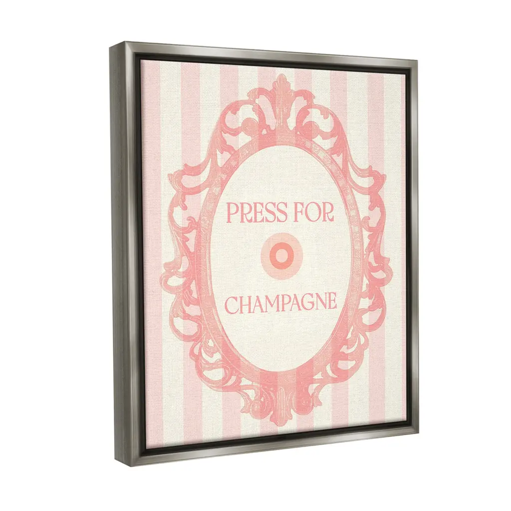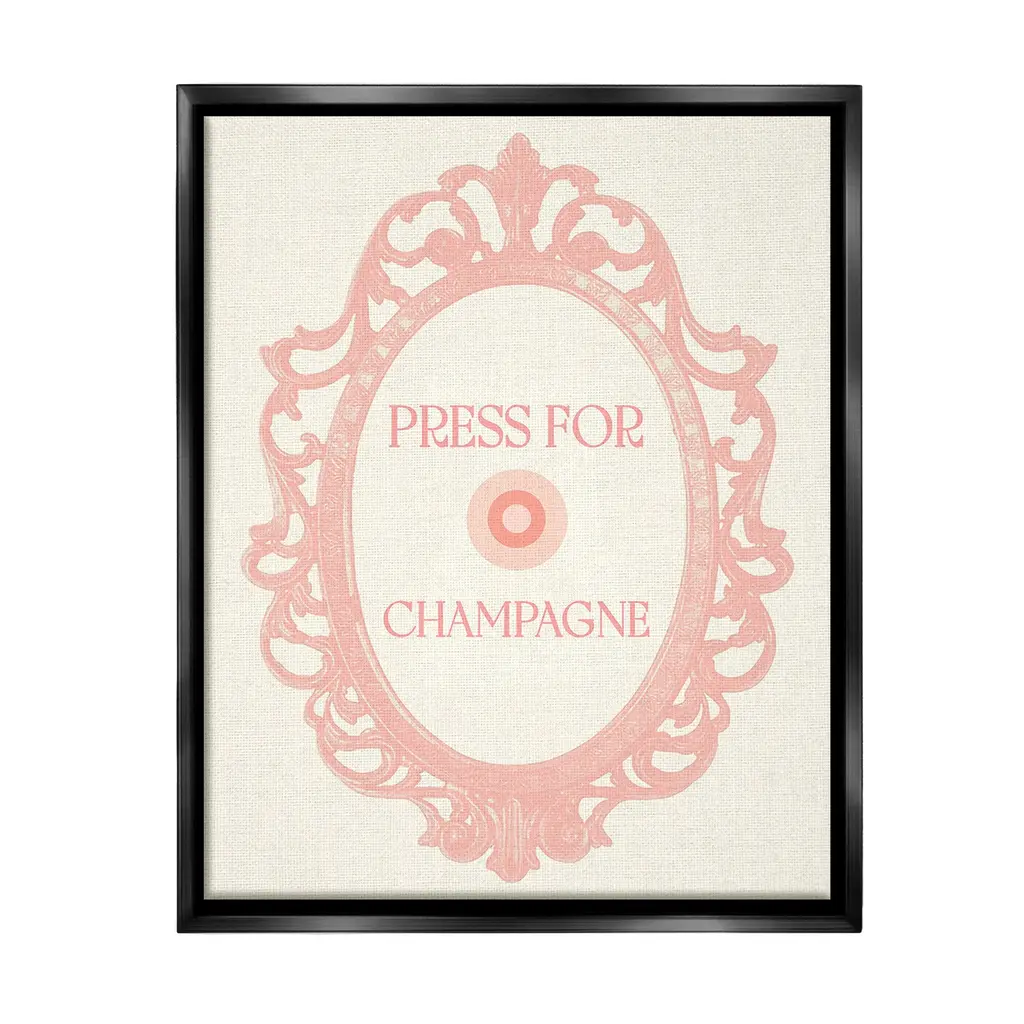 Elevate your home or office to the next level with Stupell Framed Floating Canvas Wall Art. Our premium hand-stretched canvas is mounted securely into a sturdy lightweight frame. The museum-style gap between the wrapped canvas and the box frame gives the illusion of floating artwork. Stupell Wall Art is made in the USA.Features: Dimensions: 17 x 1.7 x 21 Frame, 16 x 1.5 x 20 Canvas ArtFloating Frame Canvas Products are available in sizes 17"x21" and 25"x31". All Floating Frame Canvas Products have a 1.7" Depth.Wall Art is Ready to Hang with Hardware Free Hanging. No Installation required. For Easy Set Up Lean or Layer Artwork on Shelf or Against Wall. Artwork is Permently Fixed into the Frame.Our elevated 1.7" Thick Floating Frame is the perfect complement to our canvas style Wall Art. We use only the highest quality inks in house with industry leading printing solutions. Canvas is hand stretched over a durable wood foundation and then mounted securly into a Modern Box Frame. Made in the USA.Artwork Relates To: Glam, Fashion, Champagne, Liquor, Alcohol, Wine, Vintage, Pattern, Press For ChampagneDesign by Lil' Rue