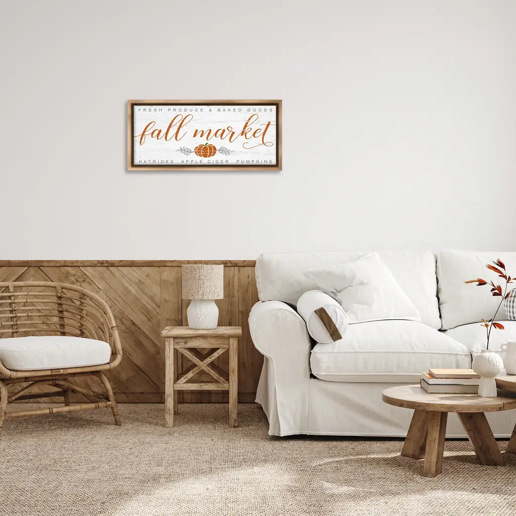 Elevate your home or office to the next level with Stupell Framed Floating Canvas Wall Art. Our premium hand-stretched canvas is mounted securely into a sturdy lightweight frame. The museum-style gap between the wrapped canvas and the box frame gives the illusion of floating artwork. Stupell Wall Art is made in the USA.Features: Dimensions: 25 x 1.7 x 11 Frame, 24 x 1.5 x 10 Canvas ArtFloating Frame Canvas Products are available in sizes 25"x11" and 31"x14". All Floating Frame Canvas Products have a 1.7" Depth.Wall Art is Ready to Hang with Hardware Free Hanging. No Installation required. For Easy Set Up Lean or Layer Artwork on Shelf or Against Wall. Artwork is Permently Fixed into the Frame.Our elevated 1.7" Thick Floating Frame is the perfect complement to our canvas style Wall Art. We use only the highest quality inks in house with industry leading printing solutions. Canvas is hand stretched over a durable wood foundation and then mounted securly into a Modern Box Frame. Made in the USA.Artwork Relates To: Seasonal, Fall, Autumn, Country, Pumpkin, Rustic, FarmhouseDesign by Jessica Mundo