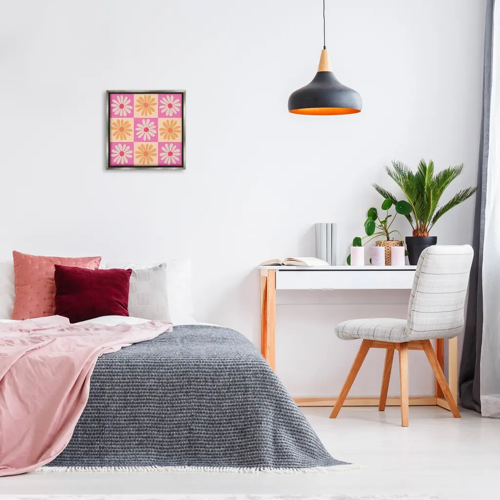 Elevate your home or office to the next level with Stupell Framed Floating Canvas Wall Art. Our premium hand-stretched canvas is mounted securely into a sturdy lightweight frame. The museum-style gap between the wrapped canvas and the box frame gives the illusion of floating artwork. Stupell Wall Art is made in the USA.Features: Dimensions: 18 x 1.7 x 18 Frame, 17 x 1.5 x 17 Canvas ArtFloating Frame Canvas Products are available in sizes 18"x18" and 25"x25". All Floating Frame Canvas Products have a 1.7" Depth.Wall Art is Ready to Hang with Hardware Free Hanging. No Installation required. For Easy Set Up Lean or Layer Artwork on Shelf or Against Wall. Artwork is Permently Fixed into the Frame.Our elevated 1.7" Thick Floating Frame is the perfect complement to our canvas style Wall Art. We use only the highest quality inks in house with industry leading printing solutions. Canvas is hand stretched over a durable wood foundation and then mounted securly into a Modern Box Frame. Made in the USA.Artwork Relates To: Daisy, Flower, Plant, Pattern, Floral, CheckeredDesign by Carrie Cantwell