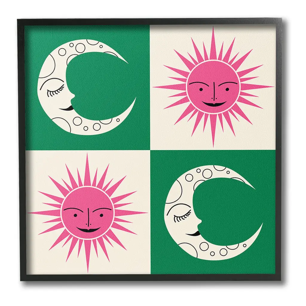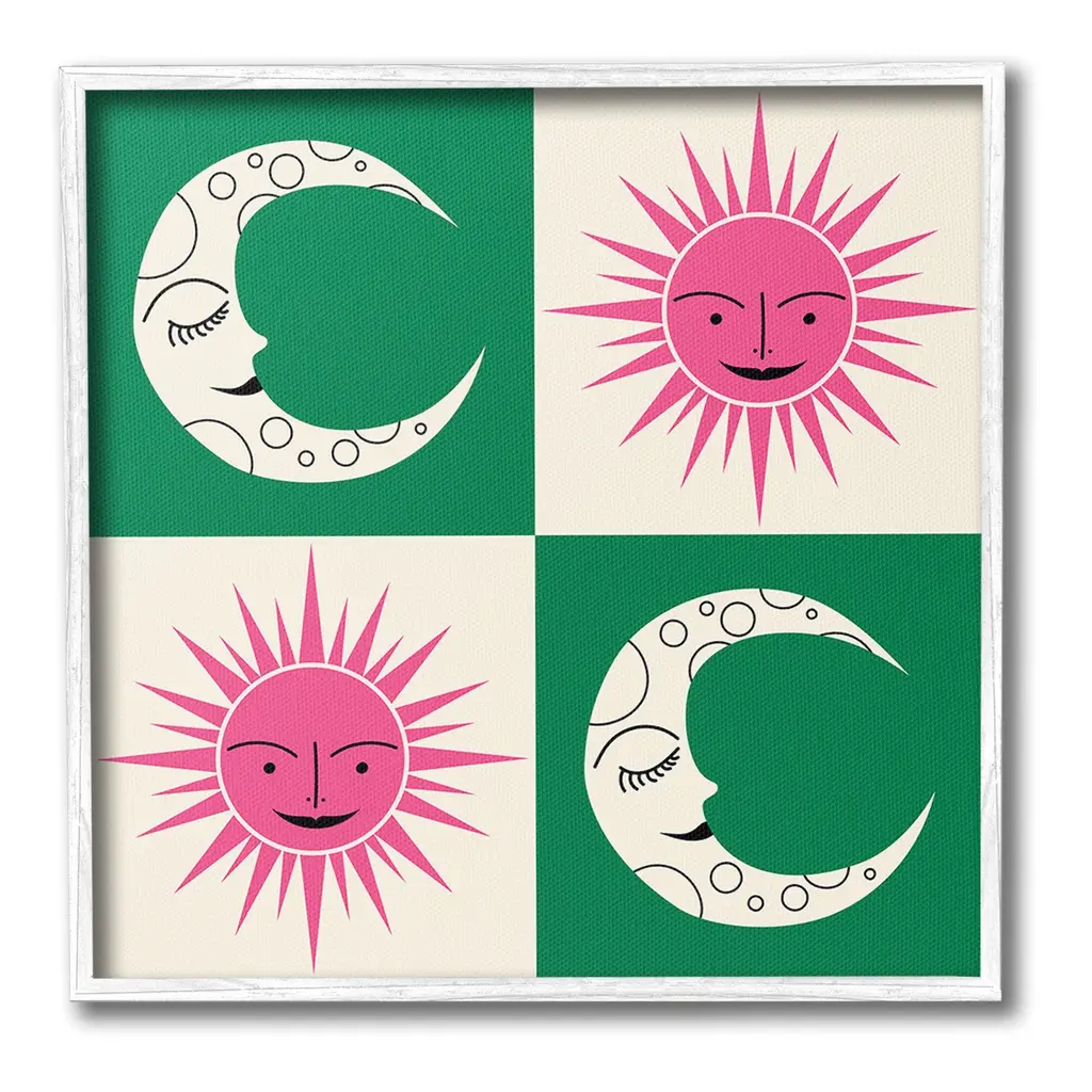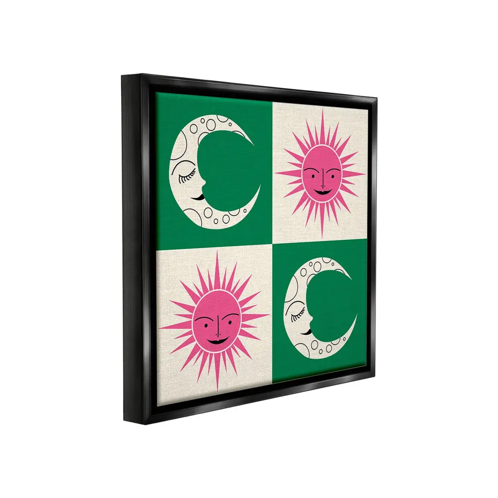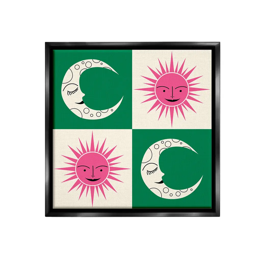 Elevate your home or office to the next level with Stupell Framed Floating Canvas Wall Art. Our premium hand-stretched canvas is mounted securely into a sturdy lightweight frame. The museum-style gap between the wrapped canvas and the box frame gives the illusion of floating artwork. Stupell Wall Art is made in the USA.Features: Dimensions: 18 x 1.7 x 18 Frame, 17 x 1.5 x 17 Canvas ArtFloating Frame Canvas Products are available in sizes 18"x18" and 25"x25". All Floating Frame Canvas Products have a 1.7" Depth.Wall Art is Ready to Hang with Hardware Free Hanging. No Installation required. For Easy Set Up Lean or Layer Artwork on Shelf or Against Wall. Artwork is Permently Fixed into the Frame.Our elevated 1.7" Thick Floating Frame is the perfect complement to our canvas style Wall Art. We use only the highest quality inks in house with industry leading printing solutions. Canvas is hand stretched over a durable wood foundation and then mounted securly into a Modern Box Frame. Made in the USA.Artwork Relates To: Astral, Celestial, Sun, Moon, Pattern, Checkered, Boho, ModernDesign by Carrie Cantwell