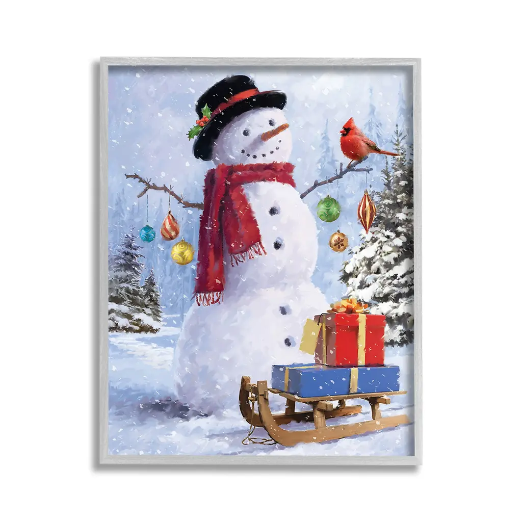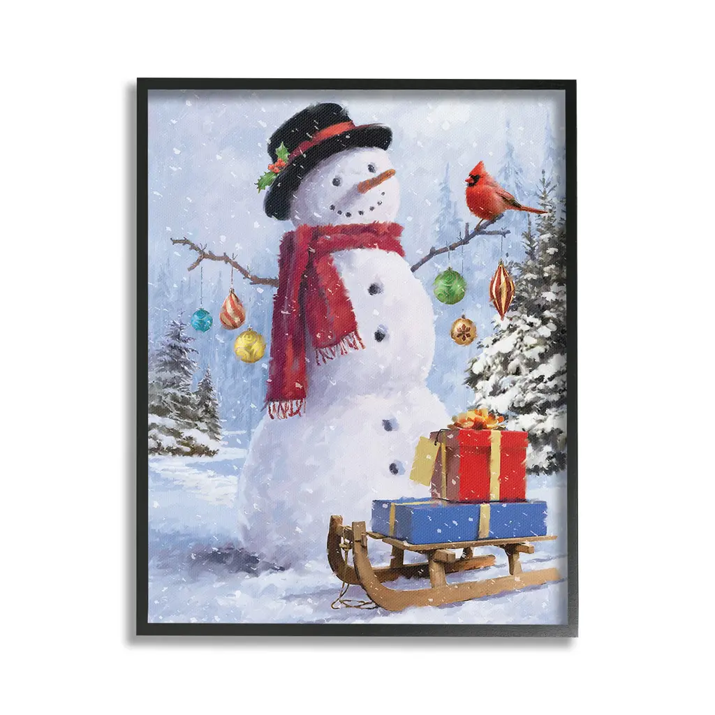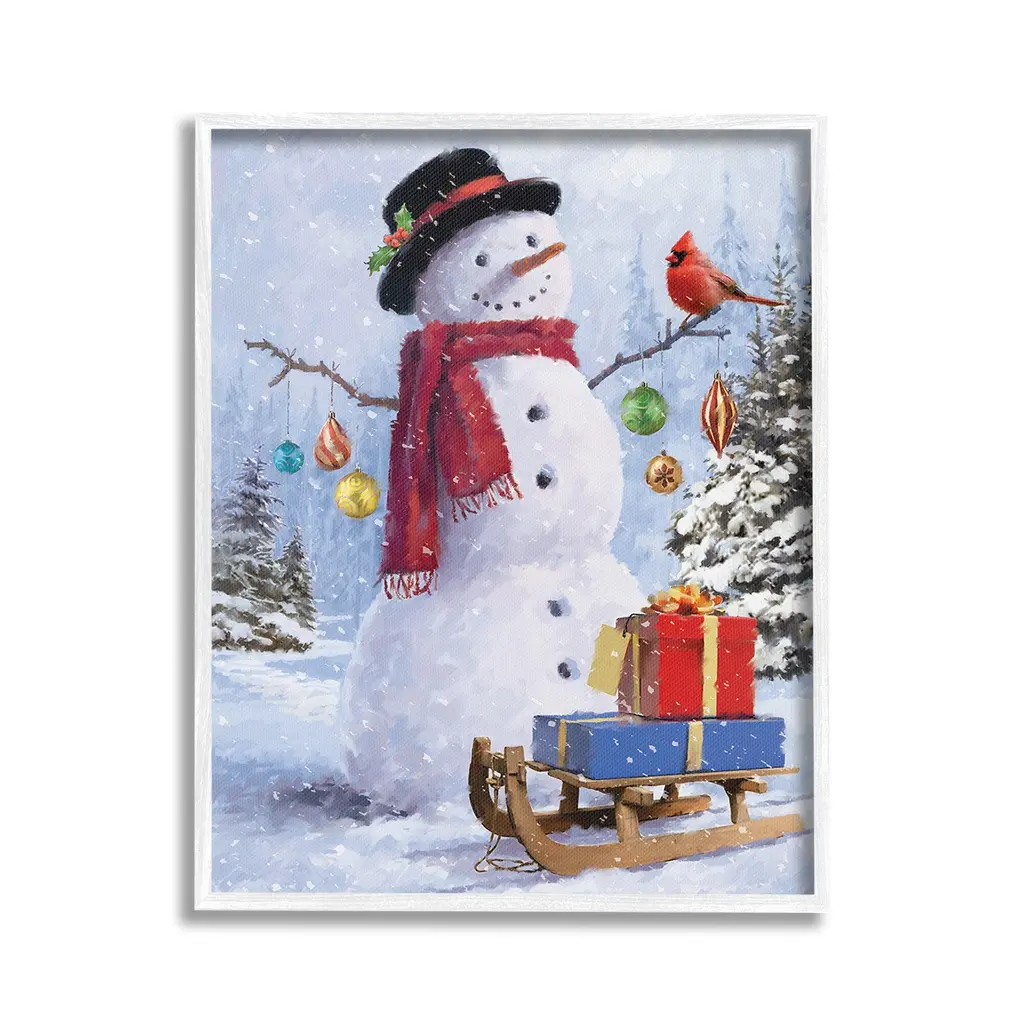 Stupell Cheerful Snowman Red Sleigh Sled Holly Botanicals Canvas Wall Art - 16 X 20