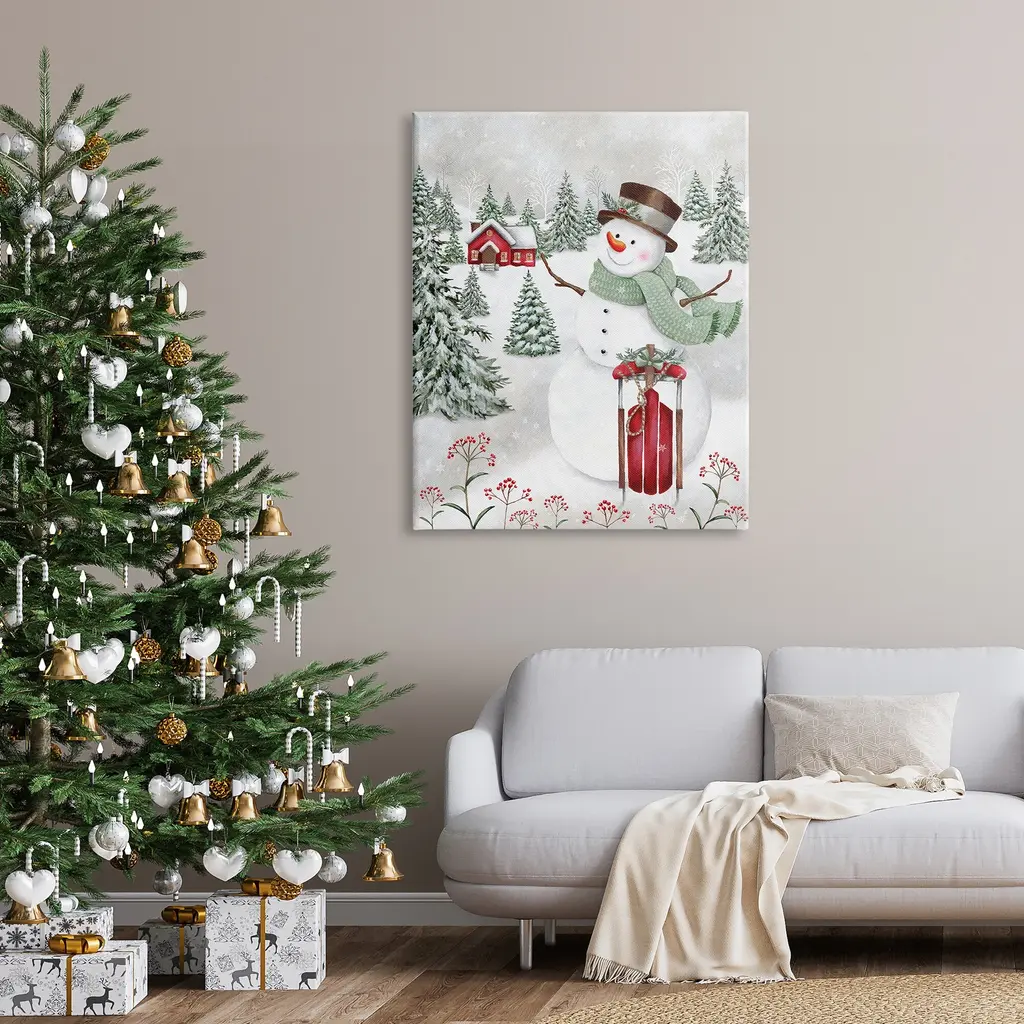 Stupell Cheerful Snowman Red Sleigh Sled Holly Botanicals Canvas Wall Art - 36 X 48