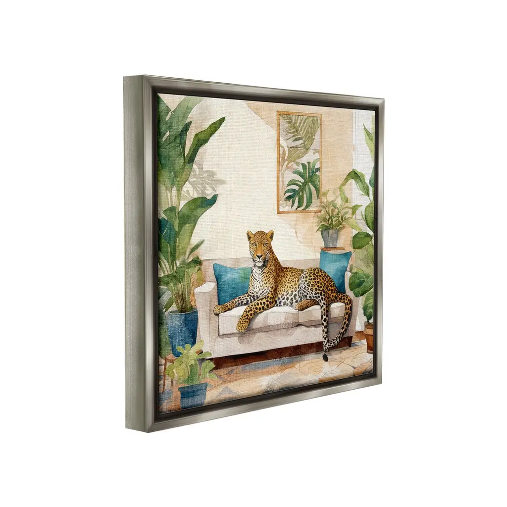 Elevate your home or office to the next level with Stupell Framed Floating Canvas Wall Art. Our premium hand-stretched canvas is mounted securely into a sturdy lightweight frame. The museum-style gap between the wrapped canvas and the box frame gives the illusion of floating artwork. Stupell Wall Art is made in the USA.Features: Dimensions: 18 x 1.7 x 18 Frame, 17 x 1.5 x 17 Canvas ArtFloating Frame Canvas Products are available in sizes 18"x18" and 25"x25". All Floating Frame Canvas Products have a 1.7" Depth.Wall Art is Ready to Hang with Hardware Free Hanging. No Installation required. For Easy Set Up Lean or Layer Artwork on Shelf or Against Wall. Artwork is Permently Fixed into the Frame.Our elevated 1.7" Thick Floating Frame is the perfect complement to our canvas style Wall Art. We use only the highest quality inks in house with industry leading printing solutions. Canvas is hand stretched over a durable wood foundation and then mounted securly into a Modern Box Frame. Made in the USA.Artwork Relates To: Animal, Mammal, Cheetah, Wildlife, Cushion, Leopard, Plant, Botanical, Monstera, TropicalDesign by Kim Allen