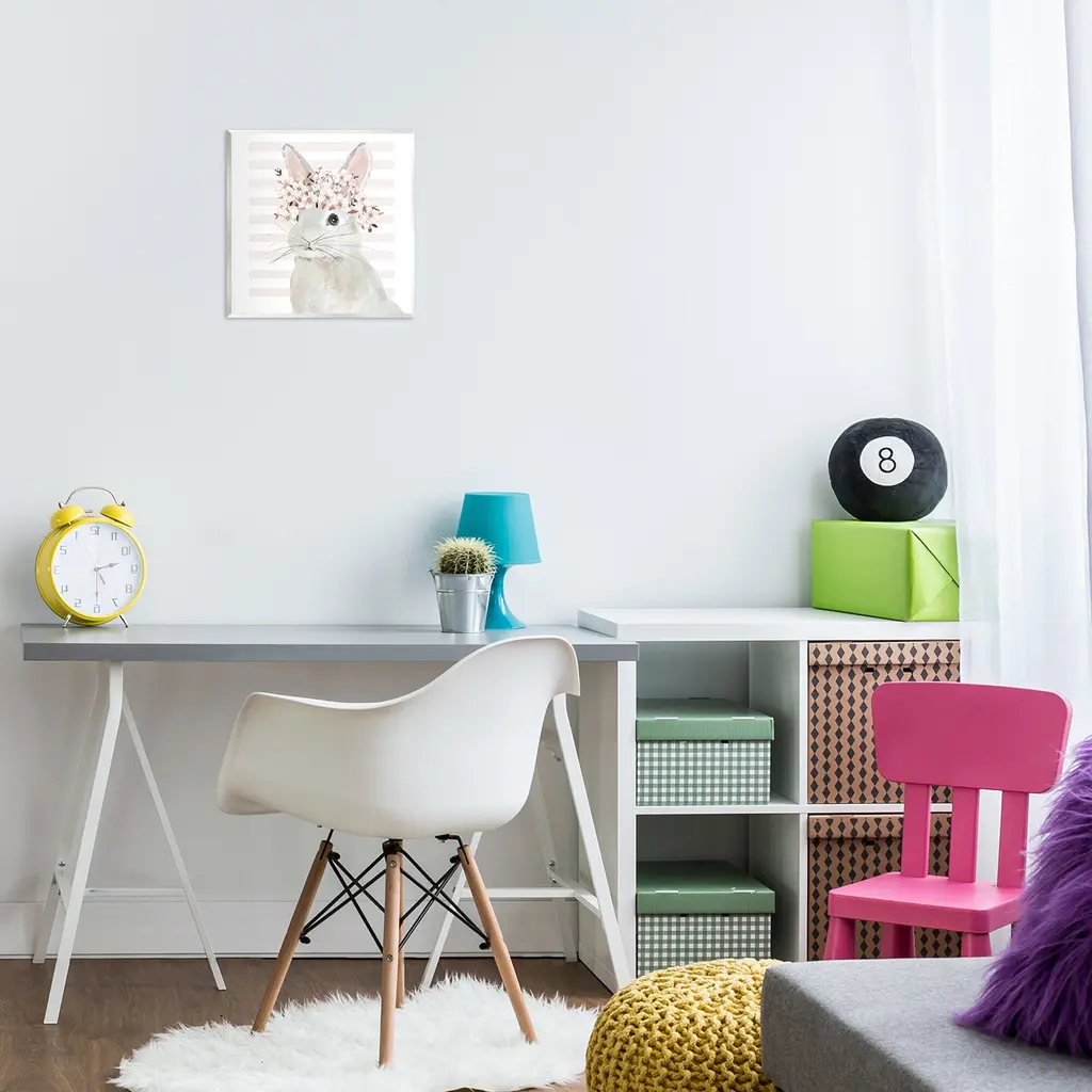 Our wall plaques start as high-quality lithograph prints mounted on durable 0.5-inch thick MDF wood. Each piece is hand finished and comes with a fresh layer of white foil on the sides to give it a crisp, clean look. Plaques arrive ready to hang without installation and come with removable plastic corners to keep them from damage in transit. Stupell Wall Art is made in the USA.Features: Dimensions: 12 x 0.5 x 12 InchesWall Art is Ready to Hang with Hardware Free Hanging. No installation required. For Easy Set Up Lean or Layer Artwork on Shelf or Against Wall.All of our wall plaques start off as high quality lithograph prints that are then mounted on durable 0.5 inch thick MDF wood. Each piece is hand finished and comes with a fresh layer of foil on the sides to give it a crisp clean look. Made In USA.Artwork Relates To: Animal, Rabbit, Bunny, Flower, Floral, Cherry BlossomDesign by Jessie Perry