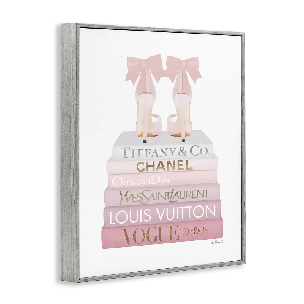Stupell Chic Pink Bow Shoes Glam Fashion Bookstack Framed Wall Art - 24 X 30 - Grey