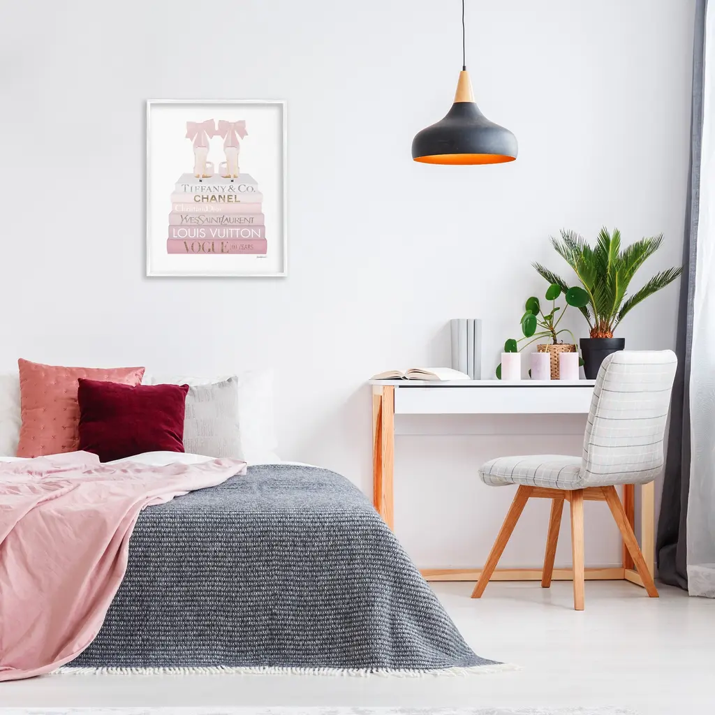 Stupell Chic Pink Bow Shoes Glam Fashion Bookstack Framed Wall Art - 24 X 30 - White