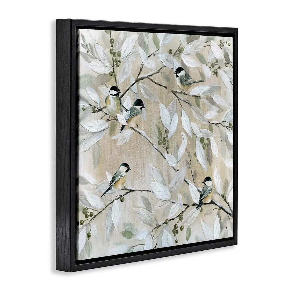 Elevate your home or office to the next level with Stupell Framed Floating Canvas Wall Art. Our premium hand-stretched canvas is mounted securely into a sturdy lightweight frame. The museum-style gap between the wrapped canvas and the box frame gives the illusion of floating artwork. Stupell Wall Art is made in the USA.Features: Dimensions: 18 x 1.7 x 18 Frame, 17 x 1.5 x 17 Canvas ArtFloating Frame Canvas Products are available in sizes 18"x18" and 25"x25". All Floating Frame Canvas Products have a 1.7" Depth.Wall Art is Ready to Hang with Hardware Free Hanging. No Installation required. For Easy Set Up Lean or Layer Artwork on Shelf or Against Wall. Artwork is Permently Fixed into the Frame.Our elevated 1.7" Thick Floating Frame is the perfect complement to our canvas style Wall Art. We use only the highest quality inks in house with industry leading printing solutions. Canvas is hand stretched over a durable wood foundation and then mounted securly into a Modern Box Frame. Made in the USA.Artwork Relates To: Birds, Trees, Branches, Foliage, ChickadeesDesign by Carol Robinson