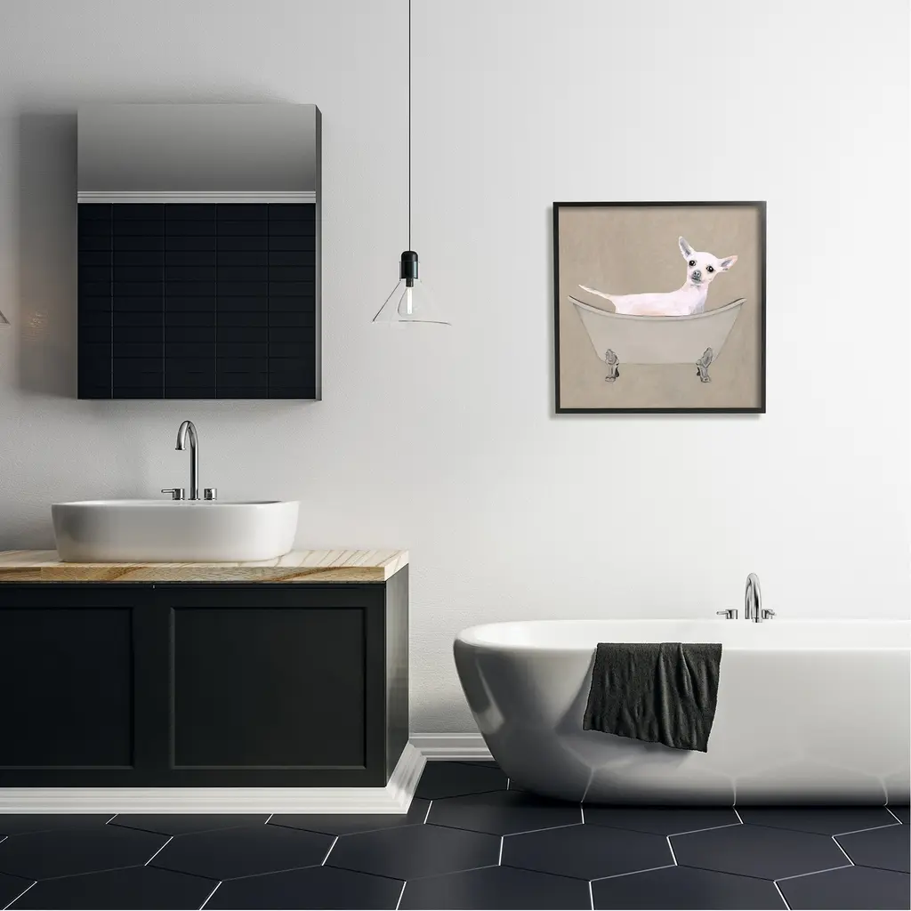 Add dimension to any room with our textured Framed Giclee Artwork. Our framed artwork is securely mounted into a 1.5-inch thick wood grain frame and ready to hang. Frames are available in three alluring styles: black, gray farmhouse and white. In addition, you should check out our oversized options if you want a statement piece. Stupell Wall Art is made in the USA.Features: Dimensions: 12 x 1.5 x 12 FramedFramed Giclee Sizes Include Standard: 12 x 1.5 x 12 Large: 17 x 1.5 x 17 Oversized: 24 x 1.5 x 24Wall Art is Ready to Hang - No Installation or Hardware Needed. For Easy Set Up Lean or Layer Artwork on Shelf or Against Wall.Our giclée prints are carefully mounted on a durable MDF backing, and then perfectly finished in a 1.5 inch thick woodgrain frame. Mounted frame colors include black, gray farmhouse and white. Made In USA.Artwork Relates To: Animal, Mammal, Wildlife, Bathroom, Dog, ChihuahuaDesign by Coco de Paris