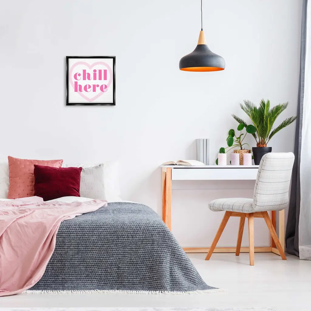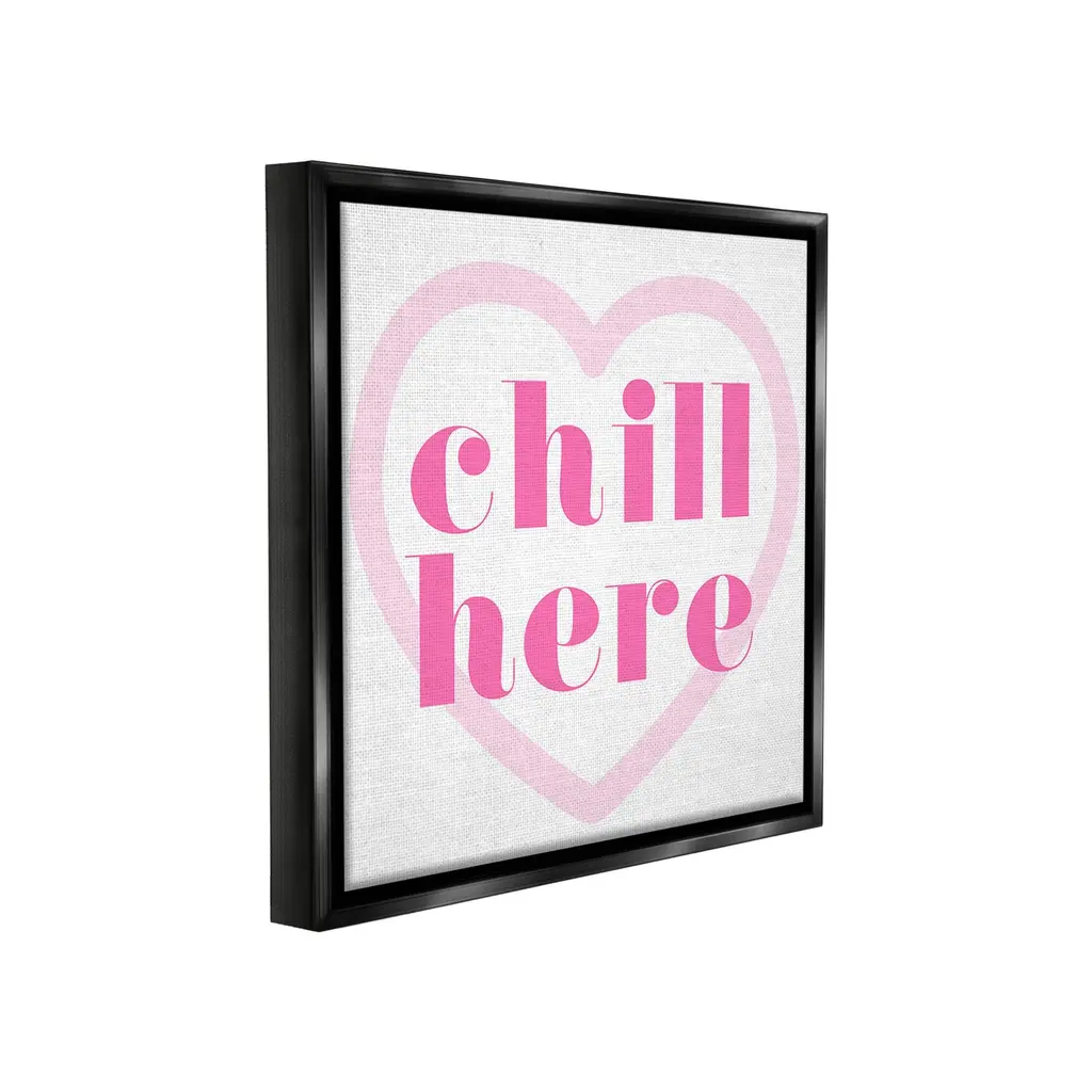 Elevate your home or office to the next level with Stupell Framed Floating Canvas Wall Art. Our premium hand-stretched canvas is mounted securely into a sturdy lightweight frame. The museum-style gap between the wrapped canvas and the box frame gives the illusion of floating artwork. Stupell Wall Art is made in the USA.Features: Dimensions: 18 x 1.7 x 18 Frame, 17 x 1.5 x 17 Canvas ArtFloating Frame Canvas Products are available in sizes 18"x18" and 25"x25". All Floating Frame Canvas Products have a 1.7" Depth.Wall Art is Ready to Hang with Hardware Free Hanging. No Installation required. For Easy Set Up Lean or Layer Artwork on Shelf or Against Wall. Artwork is Permently Fixed into the Frame.Our elevated 1.7" Thick Floating Frame is the perfect complement to our canvas style Wall Art. We use only the highest quality inks in house with industry leading printing solutions. Canvas is hand stretched over a durable wood foundation and then mounted securly into a Modern Box Frame. Made in the USA.Artwork Relates To: Phrase, Typography, Heart, Pastel, Pink, Chill HereDesign by Lil' Rue