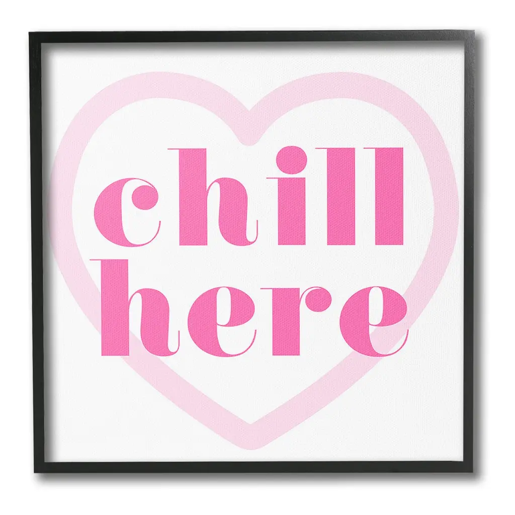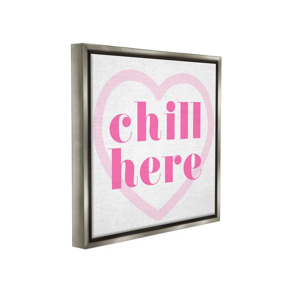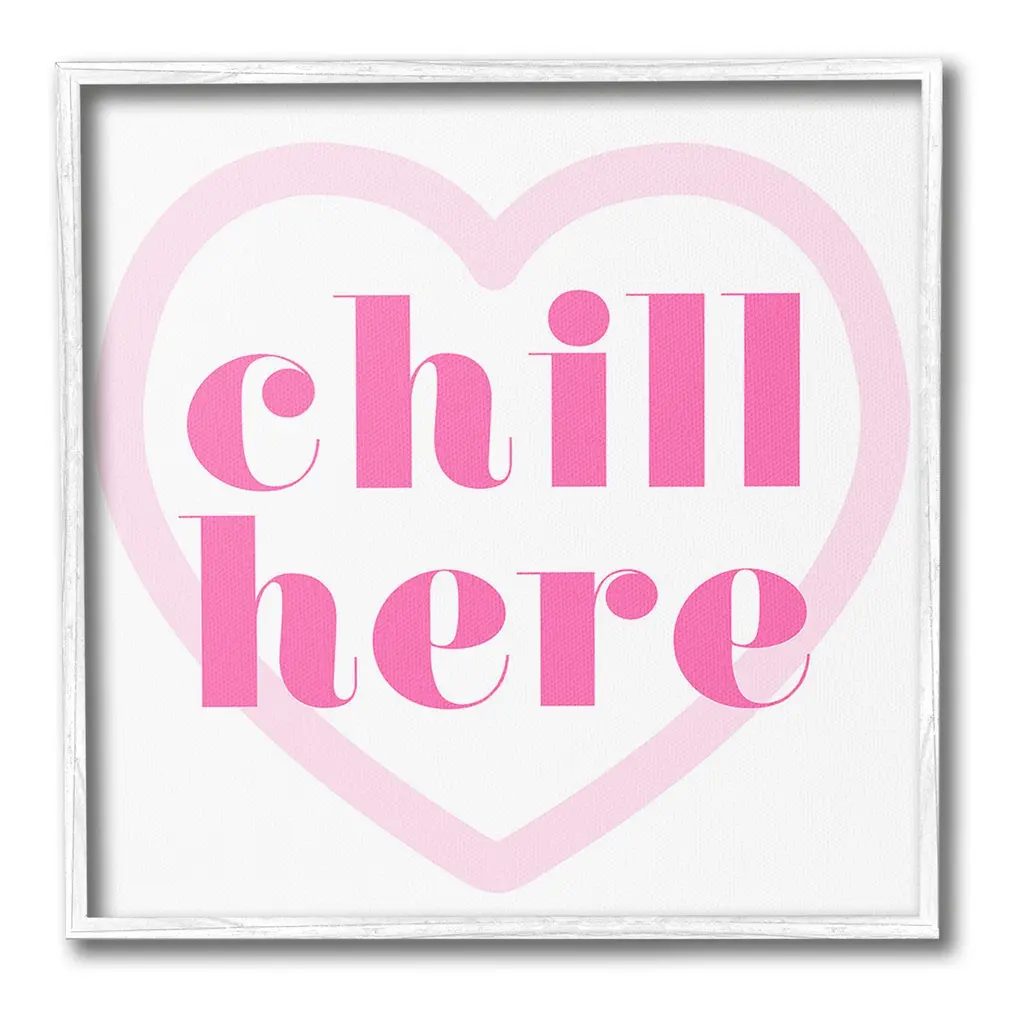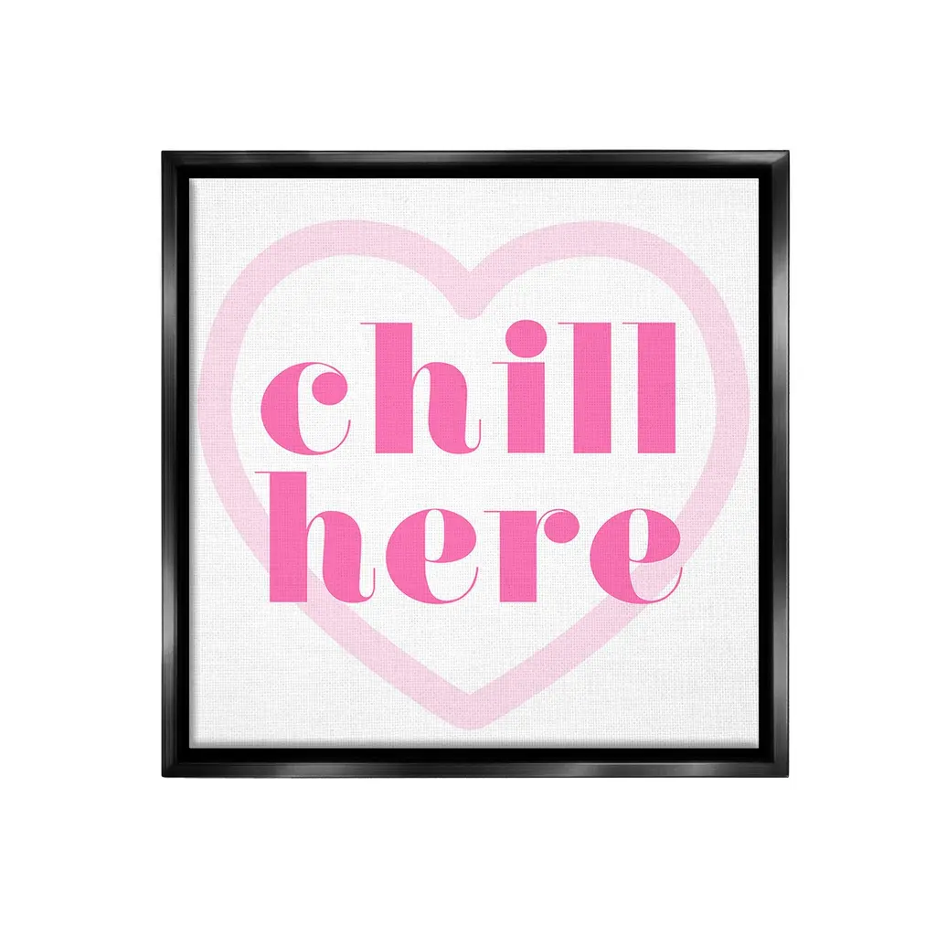 Elevate your home or office to the next level with Stupell Framed Floating Canvas Wall Art. Our premium hand-stretched canvas is mounted securely into a sturdy lightweight frame. The museum-style gap between the wrapped canvas and the box frame gives the illusion of floating artwork. Stupell Wall Art is made in the USA.Features: Dimensions: 18 x 1.7 x 18 Frame, 17 x 1.5 x 17 Canvas ArtFloating Frame Canvas Products are available in sizes 18"x18" and 25"x25". All Floating Frame Canvas Products have a 1.7" Depth.Wall Art is Ready to Hang with Hardware Free Hanging. No Installation required. For Easy Set Up Lean or Layer Artwork on Shelf or Against Wall. Artwork is Permently Fixed into the Frame.Our elevated 1.7" Thick Floating Frame is the perfect complement to our canvas style Wall Art. We use only the highest quality inks in house with industry leading printing solutions. Canvas is hand stretched over a durable wood foundation and then mounted securly into a Modern Box Frame. Made in the USA.Artwork Relates To: Phrase, Typography, Heart, Pastel, Pink, Chill HereDesign by Lil' Rue