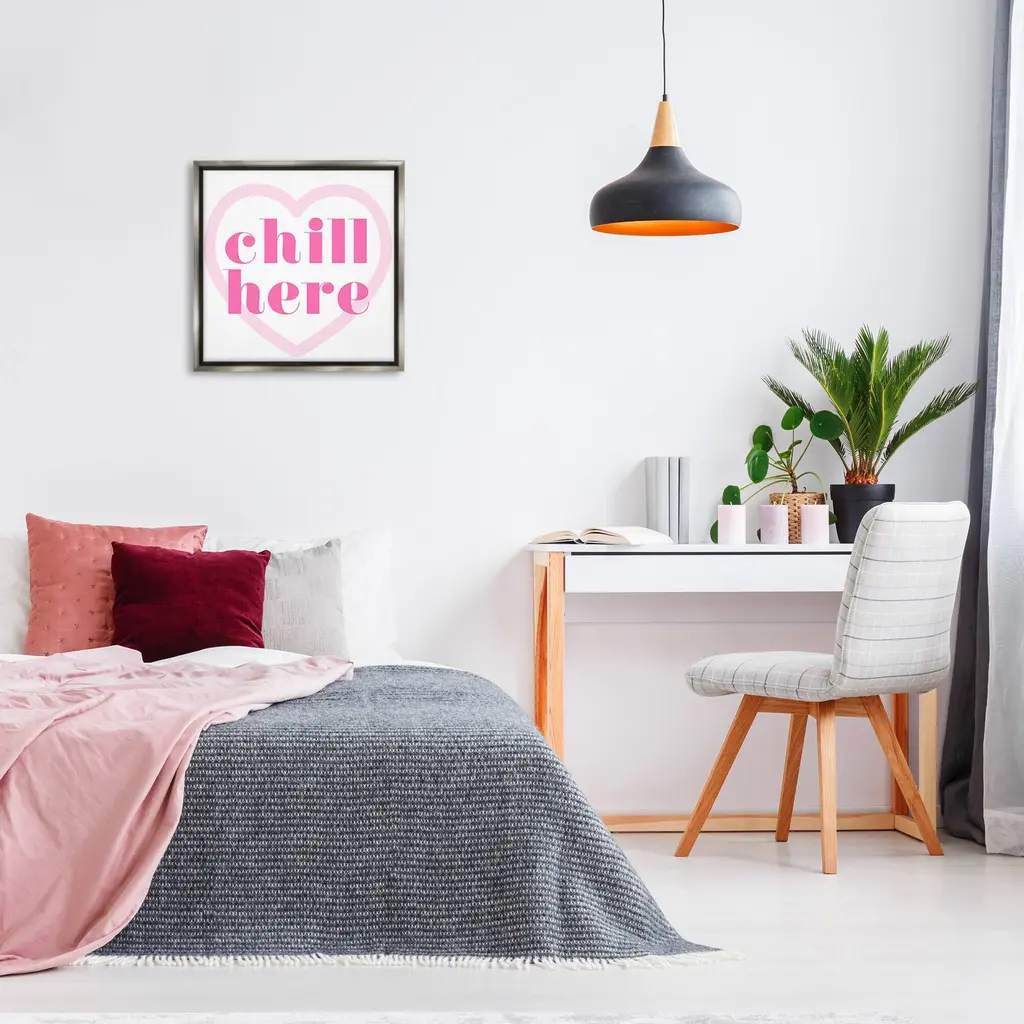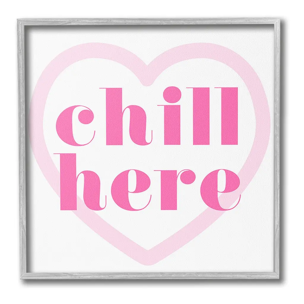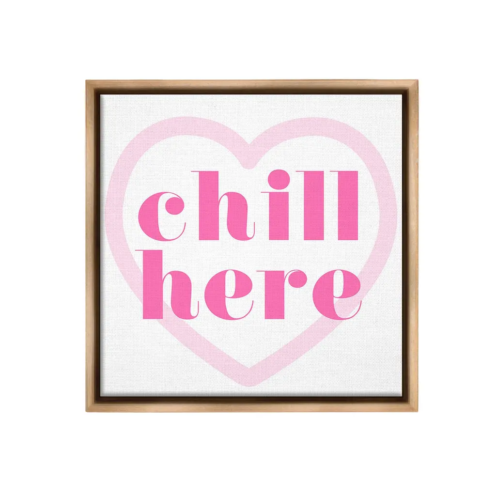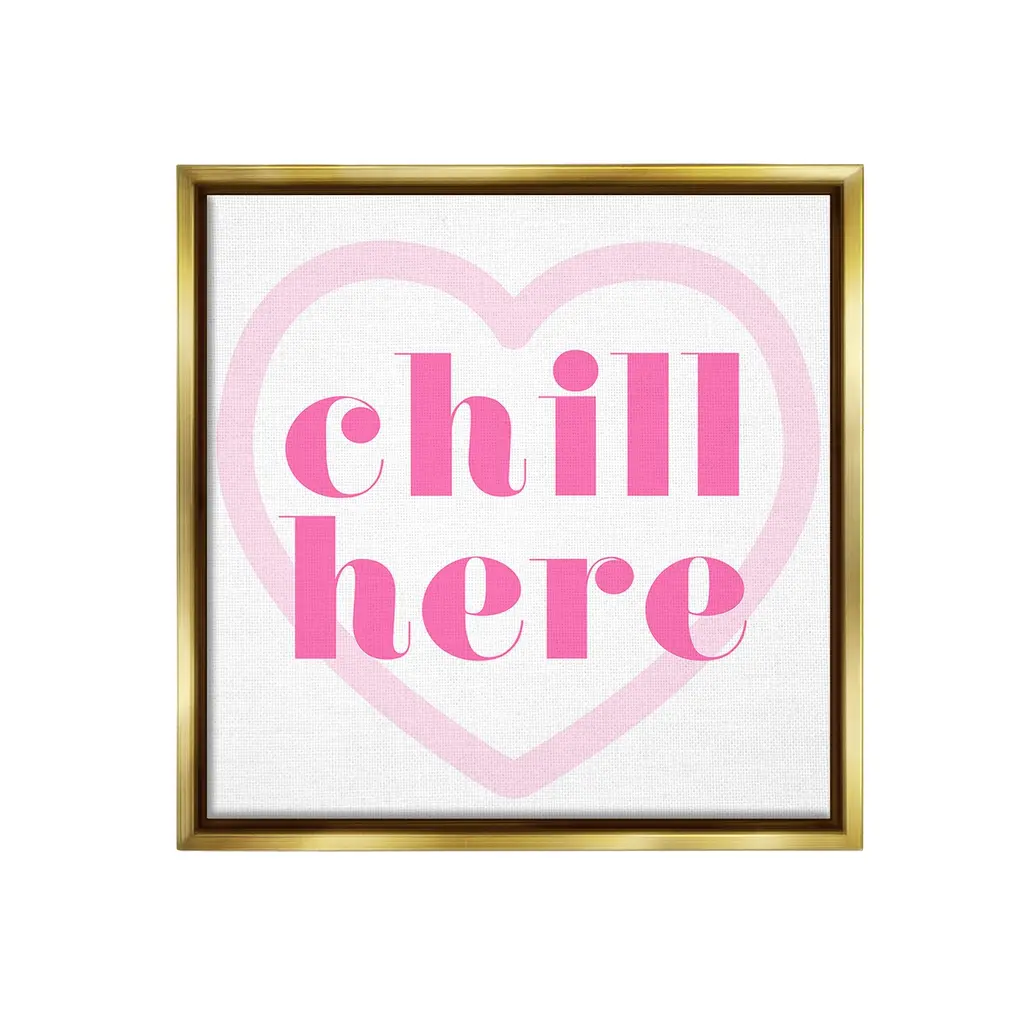 Elevate your home or office to the next level with Stupell Framed Floating Canvas Wall Art. Our premium hand-stretched canvas is mounted securely into a sturdy lightweight frame. The museum-style gap between the wrapped canvas and the box frame gives the illusion of floating artwork. Stupell Wall Art is made in the USA.Features: Dimensions: 18 x 1.7 x 18 Frame, 17 x 1.5 x 17 Canvas ArtFloating Frame Canvas Products are available in sizes 18"x18" and 25"x25". All Floating Frame Canvas Products have a 1.7" Depth.Wall Art is Ready to Hang with Hardware Free Hanging. No Installation required. For Easy Set Up Lean or Layer Artwork on Shelf or Against Wall. Artwork is Permently Fixed into the Frame.Our elevated 1.7" Thick Floating Frame is the perfect complement to our canvas style Wall Art. We use only the highest quality inks in house with industry leading printing solutions. Canvas is hand stretched over a durable wood foundation and then mounted securly into a Modern Box Frame. Made in the USA.Artwork Relates To: Phrase, Typography, Heart, Pastel, Pink, Chill HereDesign by Lil' Rue