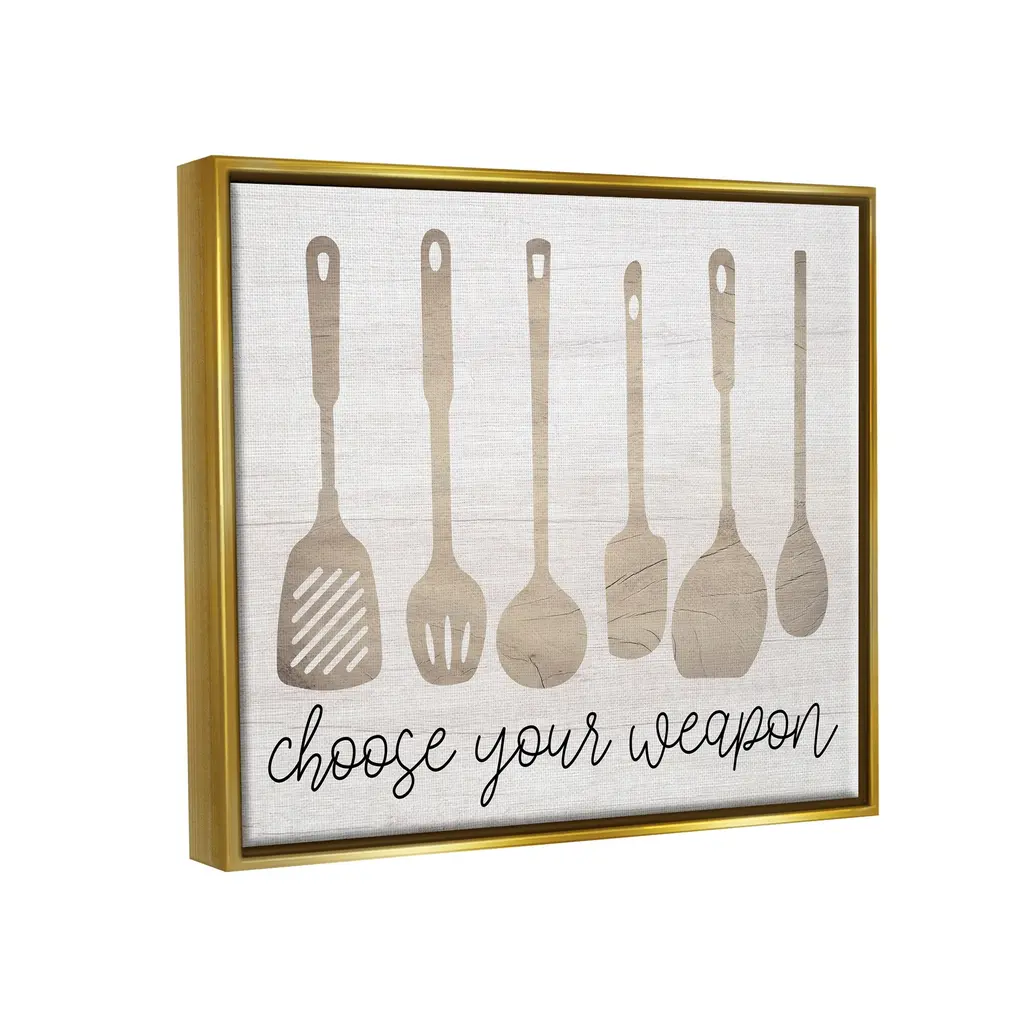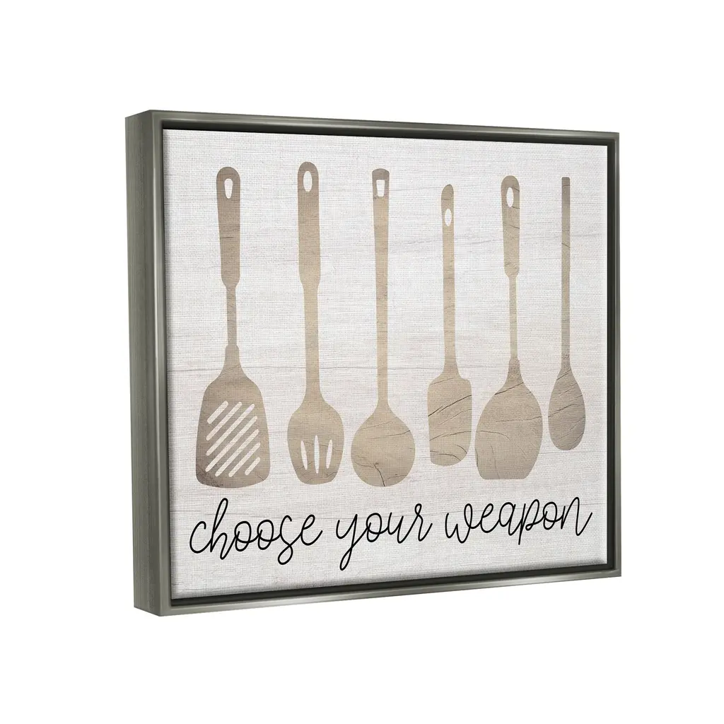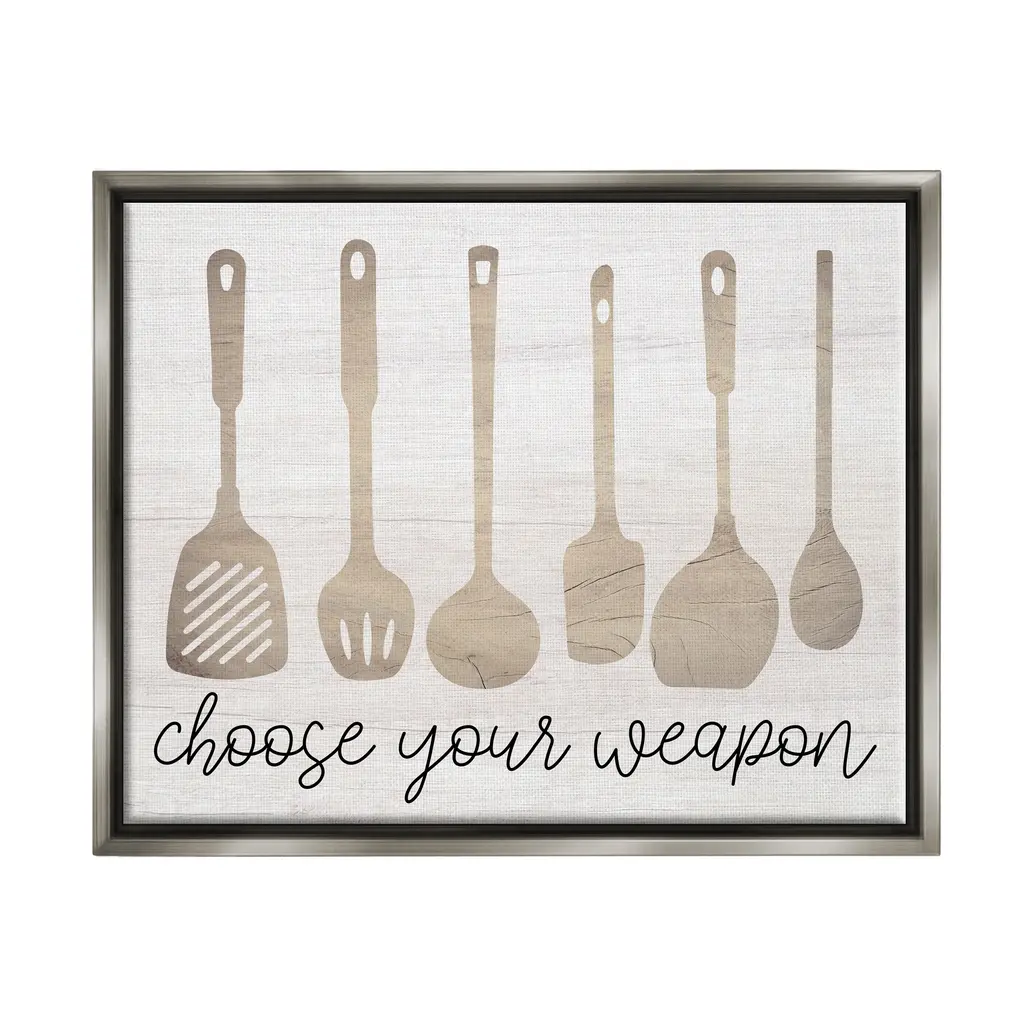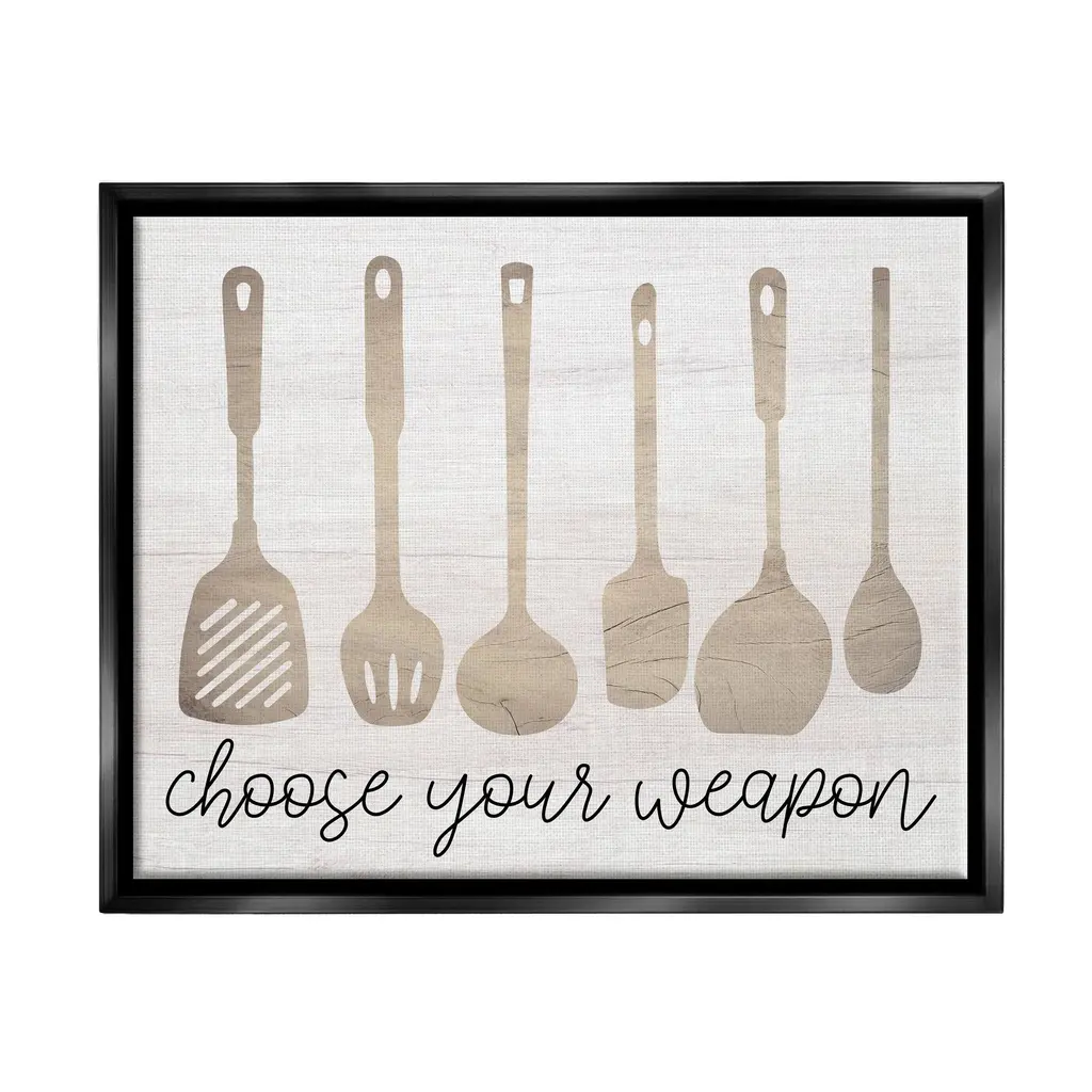 Elevate your home or office to the next level with Stupell Framed Floating Canvas Wall Art. Our premium hand-stretched canvas is mounted securely into a sturdy lightweight frame. The museum-style gap between the wrapped canvas and the box frame gives the illusion of floating artwork. Stupell Wall Art is made in the USA.Features: Dimensions: 21 x 1.7 x 17 Frame, 20 x 1.5 x 16 Canvas ArtFloating Frame Sizes Include Standard: 21 x 1.7 x 17 Oversized: 31 x 1.7 x 25Wall Art is Ready to Hang - No Installation or Hardware Needed. For Easy Set Up Lean or Layer Artwork on Shelf or Against Wall.Our elevated 1.7" Thick Floating Frame is the perfect complement to our canvas style Wall Art. We use only the highest quality inks in house with industry leading printing solutions. Canvas is hand stretched over a durable wood foundation and then mounted securly into a Modern Box Frame. Made in the USA.Artwork Relates To: Kitchen Utensil, Spatula, Cutlery, Kitchen, Rustic, Farmhouse, Choose Your WeaponDesign by Lil' Rue
