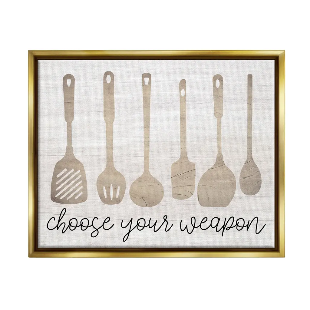Elevate your home or office to the next level with Stupell Framed Floating Canvas Wall Art. Our premium hand-stretched canvas is mounted securely into a sturdy lightweight frame. The museum-style gap between the wrapped canvas and the box frame gives the illusion of floating artwork. Stupell Wall Art is made in the USA.Features: Dimensions: 21 x 1.7 x 17 Frame, 20 x 1.5 x 16 Canvas ArtFloating Frame Sizes Include Standard: 21 x 1.7 x 17 Oversized: 31 x 1.7 x 25Wall Art is Ready to Hang - No Installation or Hardware Needed. For Easy Set Up Lean or Layer Artwork on Shelf or Against Wall.Our elevated 1.7" Thick Floating Frame is the perfect complement to our canvas style Wall Art. We use only the highest quality inks in house with industry leading printing solutions. Canvas is hand stretched over a durable wood foundation and then mounted securly into a Modern Box Frame. Made in the USA.Artwork Relates To: Kitchen Utensil, Spatula, Cutlery, Kitchen, Rustic, Farmhouse, Choose Your WeaponDesign by Lil' Rue