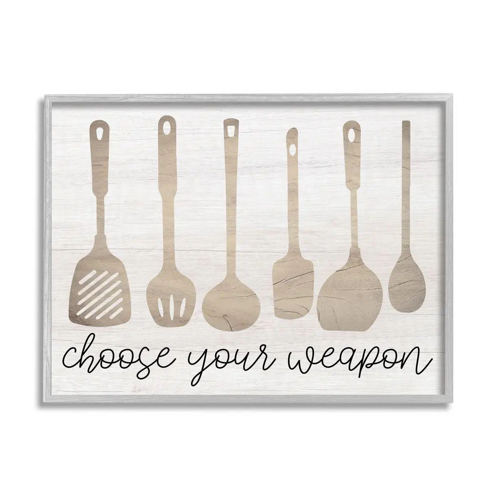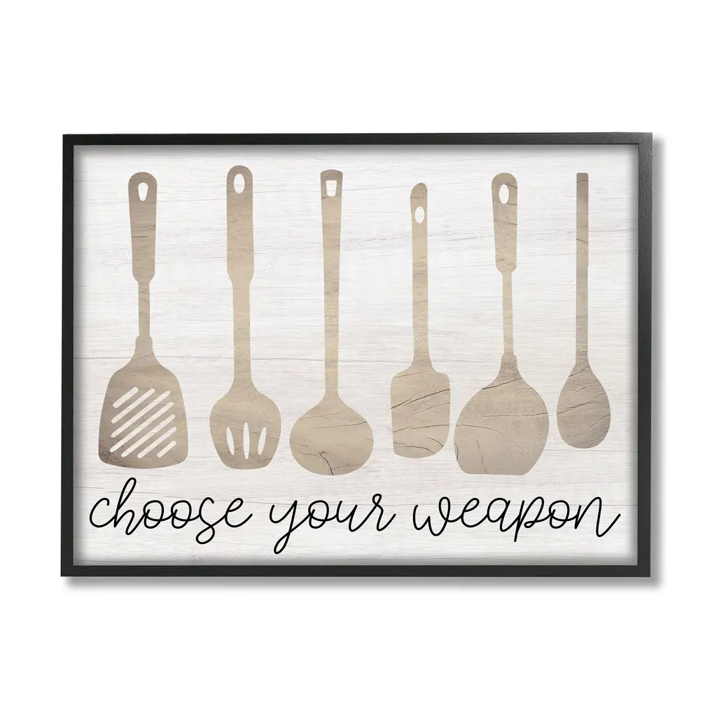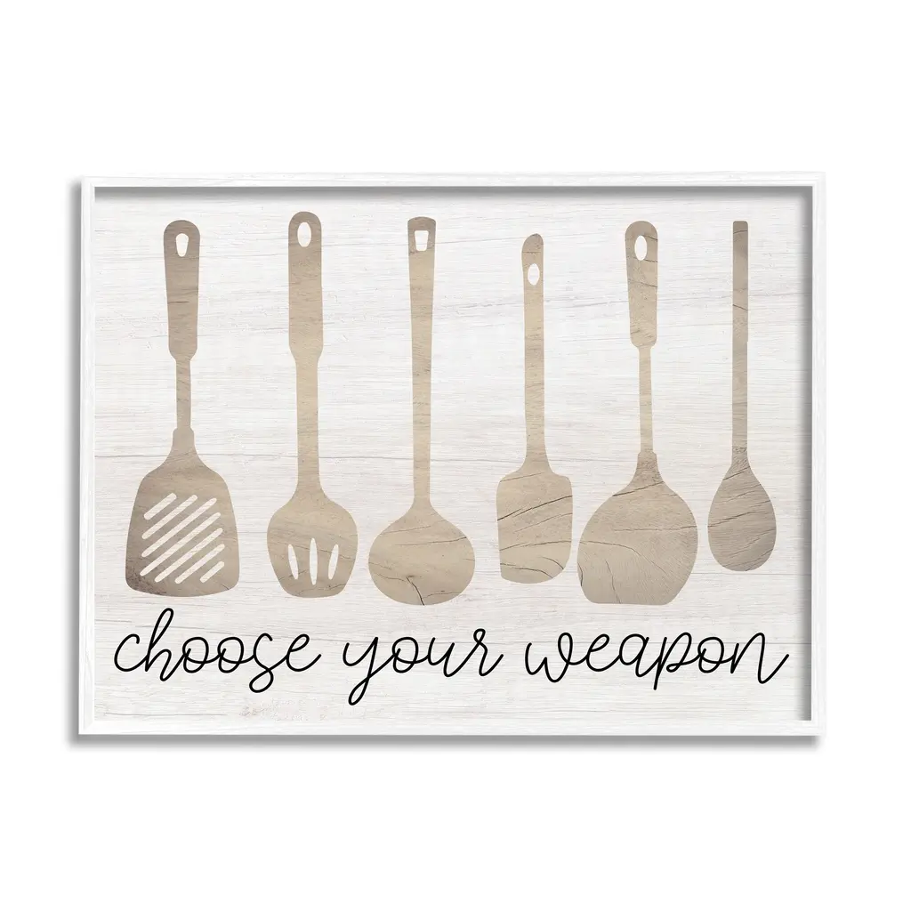 Add dimension to any room with our textured Framed Giclee Artwork. Our framed artwork is securely mounted into a 1.5-inch thick wood grain frame and ready to hang. Frames are available in three alluring styles: black, gray farmhouse and white. In addition, you should check out our oversized options if you want a statement piece. Stupell Wall Art is made in the USA.Features: Dimensions: 14 x 1.5 x 11 FramedFramed Giclee Sizes Include Standard: 14 x 1.5 x 11 Large: 20 x 1.5 x 16 Oversized: 30 x 1.5 x 24Wall Art is Ready to Hang - No Installation or Hardware Needed. For Easy Set Up Lean or Layer Artwork on Shelf or Against Wall.Our giclée prints are carefully mounted on a durable MDF backing, and then perfectly finished in a 1.5 inch thick woodgrain frame. Mounted frame colors include black, gray farmhouse and white. Made In USA.Artwork Relates To: Kitchen Utensil, Spatula, Cutlery, Kitchen, Rustic, Farmhouse, Choose Your WeaponDesign by Lil' Rue