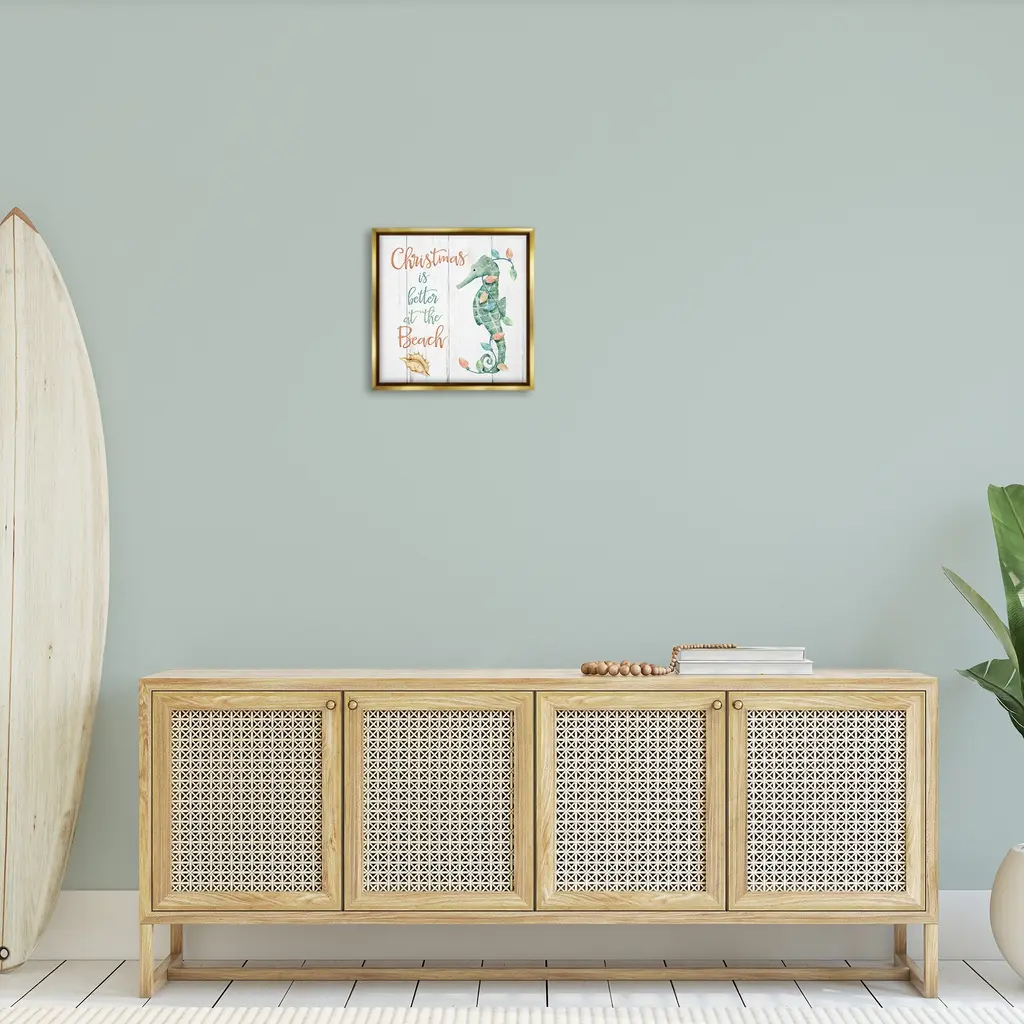Elevate your home or office to the next level with Stupell Framed Floating Canvas Wall Art. Our premium hand-stretched canvas is mounted securely into a sturdy lightweight frame. The museum-style gap between the wrapped canvas and the box frame gives the illusion of floating artwork. Stupell Wall Art is made in the USA.Features: Dimensions: 18 x 1.7 x 18 Frame, 17 x 1.5 x 17 Canvas ArtFloating Frame Canvas Products are available in sizes 18"x18" and 25"x25". All Floating Frame Canvas Products have a 1.7" Depth.Wall Art is Ready to Hang with Hardware Free Hanging. No Installation required. For Easy Set Up Lean or Layer Artwork on Shelf or Against Wall. Artwork is Permently Fixed into the Frame.Our elevated 1.7" Thick Floating Frame is the perfect complement to our canvas style Wall Art. We use only the highest quality inks in house with industry leading printing solutions. Canvas is hand stretched over a durable wood foundation and then mounted securly into a Modern Box Frame. Made in the USA.Artwork Relates To: Animal, Mammal, Sea Life, Seahorse, Nautical, Holiday, Christmas, Rustic, Christmas is better at the Beach, SeashellDesign by Deane Beesley