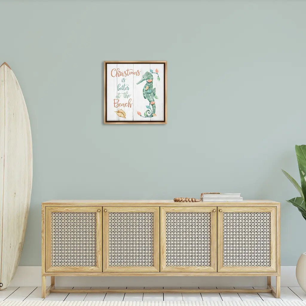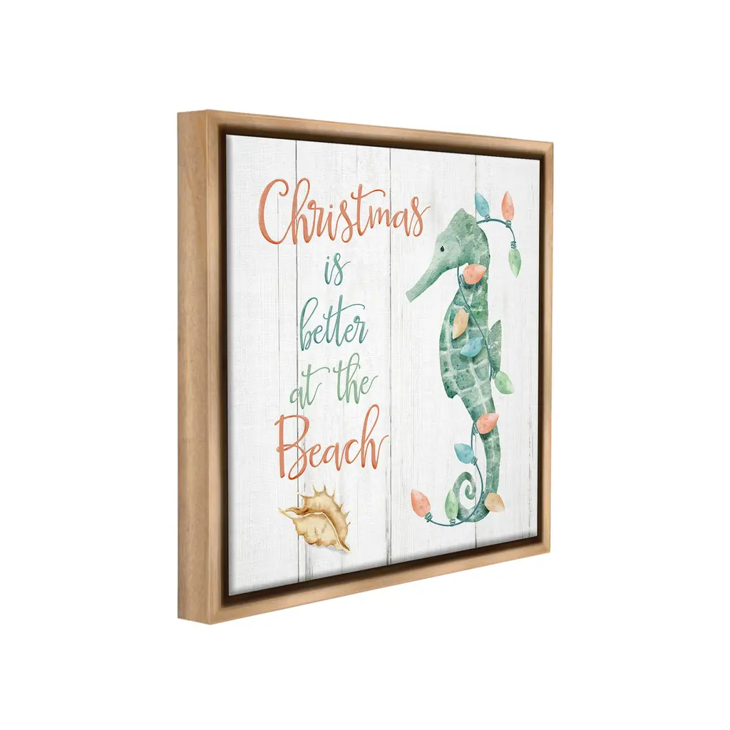Elevate your home or office to the next level with Stupell Framed Floating Canvas Wall Art. Our premium hand-stretched canvas is mounted securely into a sturdy lightweight frame. The museum-style gap between the wrapped canvas and the box frame gives the illusion of floating artwork. Stupell Wall Art is made in the USA.Features: Dimensions: 18 x 1.7 x 18 Frame, 17 x 1.5 x 17 Canvas ArtFloating Frame Canvas Products are available in sizes 18"x18" and 25"x25". All Floating Frame Canvas Products have a 1.7" Depth.Wall Art is Ready to Hang with Hardware Free Hanging. No Installation required. For Easy Set Up Lean or Layer Artwork on Shelf or Against Wall. Artwork is Permently Fixed into the Frame.Our elevated 1.7" Thick Floating Frame is the perfect complement to our canvas style Wall Art. We use only the highest quality inks in house with industry leading printing solutions. Canvas is hand stretched over a durable wood foundation and then mounted securly into a Modern Box Frame. Made in the USA.Artwork Relates To: Animal, Mammal, Sea Life, Seahorse, Nautical, Holiday, Christmas, Rustic, Christmas is better at the Beach, SeashellDesign by Deane Beesley