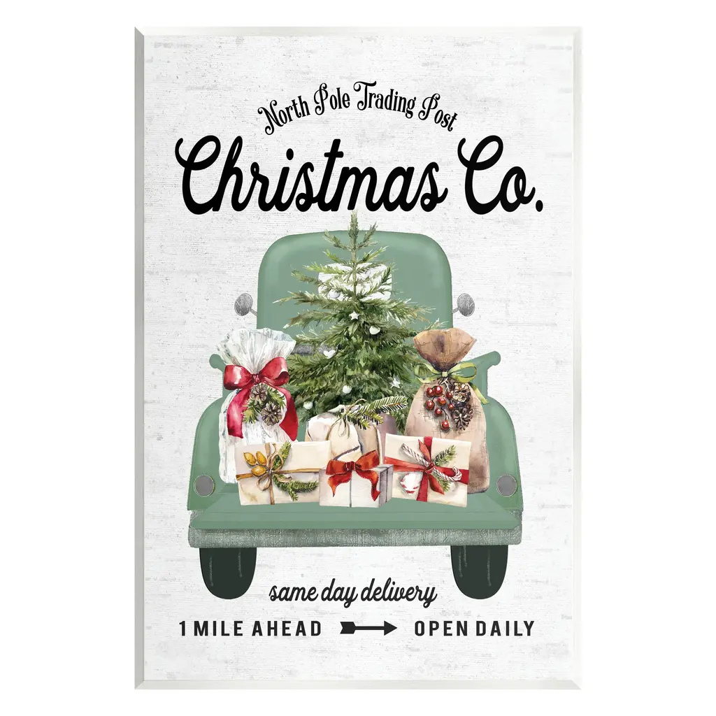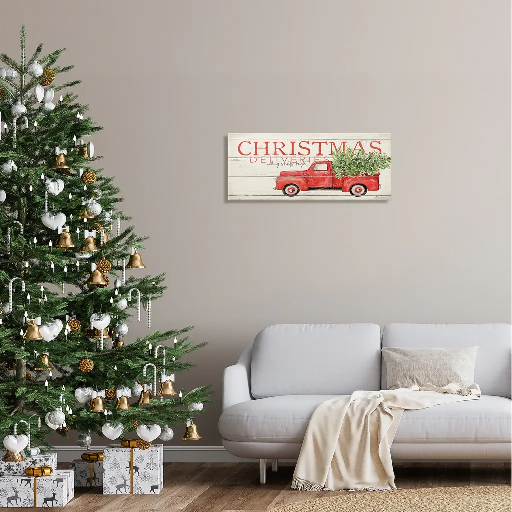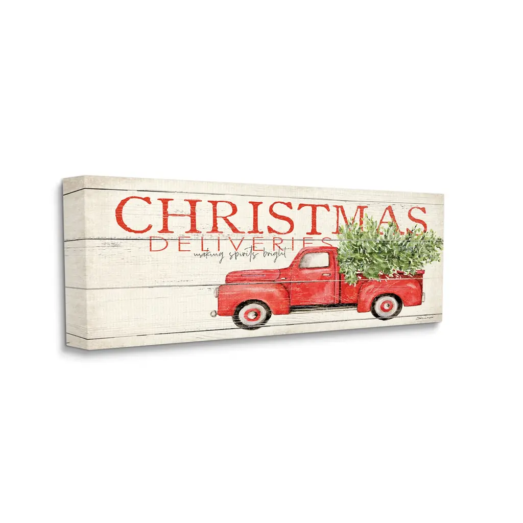 We create our stretched canvas to the highest standards. Using only the highest quality inks and canvas on Mimaki printers, we hand-cut and stretch each piece over a 1.5-inch thick wooden frame for hanging. As a result, the art comes ready to hang on the sturdy ledge with no installation required. Stupell Wall Art is made in the USA.Features: Dimensions: 24 x 1.5 x 10 InchesStretched Canvas Sizes Include Standard: 24 x 1.5 x 10 Large: 30 x 1.5 x 13 X-Large: 40 x 1.5 x 17 Oversized: 48 x 1.5 x 20Wall Art is Ready to Hang - No Installation or Hardware Needed. For Easy Set Up Lean or Layer Artwork on Shelf or Against Wall.Our stretched canvas is created with the highest standards. We use only the highest quality inks and canvas on our in house Mimaki printers, and then hand cut and stretch each piece over a 1.5 inch thick wooden frame for hanging. Made In USA.Artwork Relates To: Holiday, Christmas, Rustic, Truck, Christmas Tree, Christmas DeliveriesDesign by Stephanie Workman Marrott