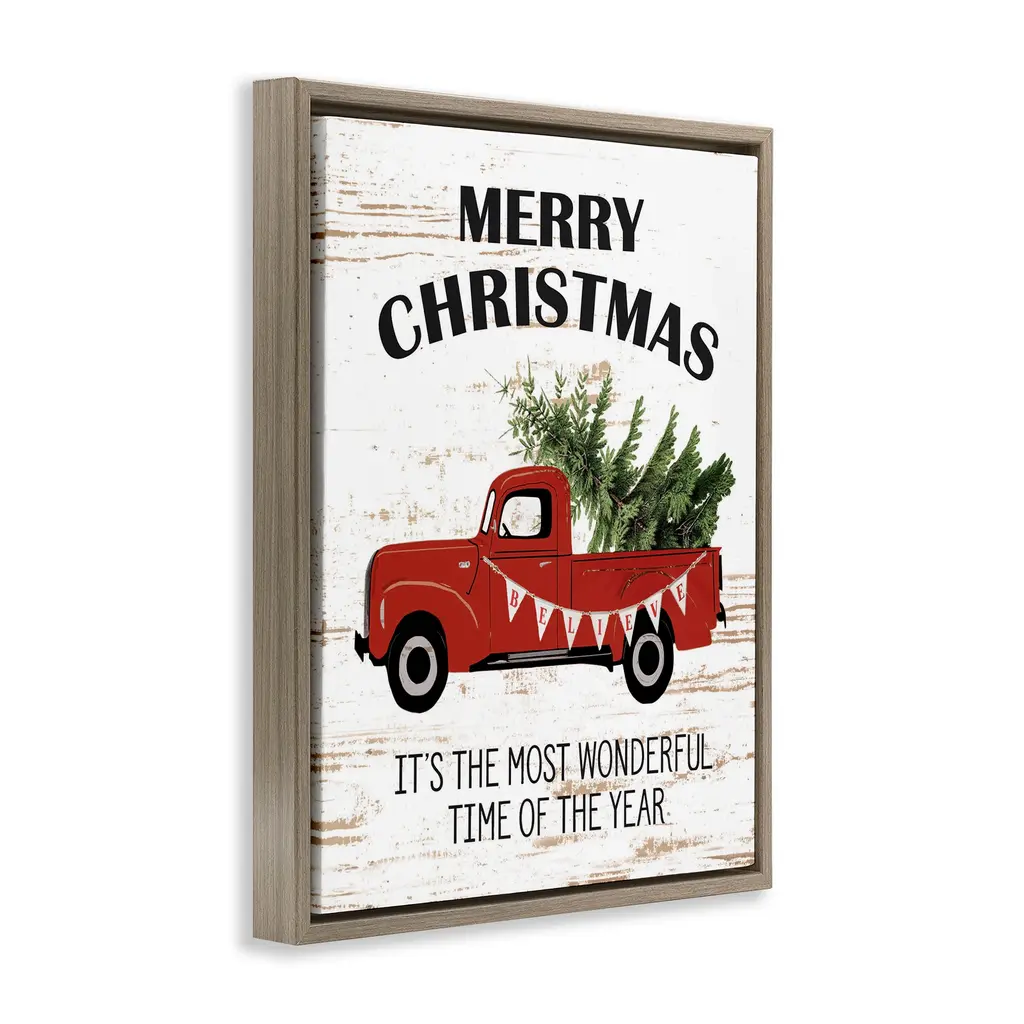 Elevate your home or office to the next level with Stupell Framed Floating Canvas Wall Art. Our premium hand-stretched canvas is mounted securely into a sturdy lightweight frame. The museum-style gap between the wrapped canvas and the box frame gives the illusion of floating artwork. Stupell Wall Art is made in the USA.Features: Dimensions: 17 x 1.7 x 21 Frame, 16 x 1.5 x 20 Canvas ArtFloating Frame Canvas Products are available in sizes 17"x21" and 25"x31". All Floating Frame Canvas Products have a 1.7" Depth.Wall Art is Ready to Hang with Hardware Free Hanging. No Installation required. For Easy Set Up Lean or Layer Artwork on Shelf or Against Wall. Artwork is Permently Fixed into the Frame.Our elevated 1.7" Thick Floating Frame is the perfect complement to our canvas style Wall Art. We use only the highest quality inks in house with industry leading printing solutions. Canvas is hand stretched over a durable wood foundation and then mounted securly into a Modern Box Frame. Made in the USA.Artwork Relates To: Holiday, Christmas, Winter, Rustic, Farmhouse, Pickup TruckDesign by Lettered and Lined