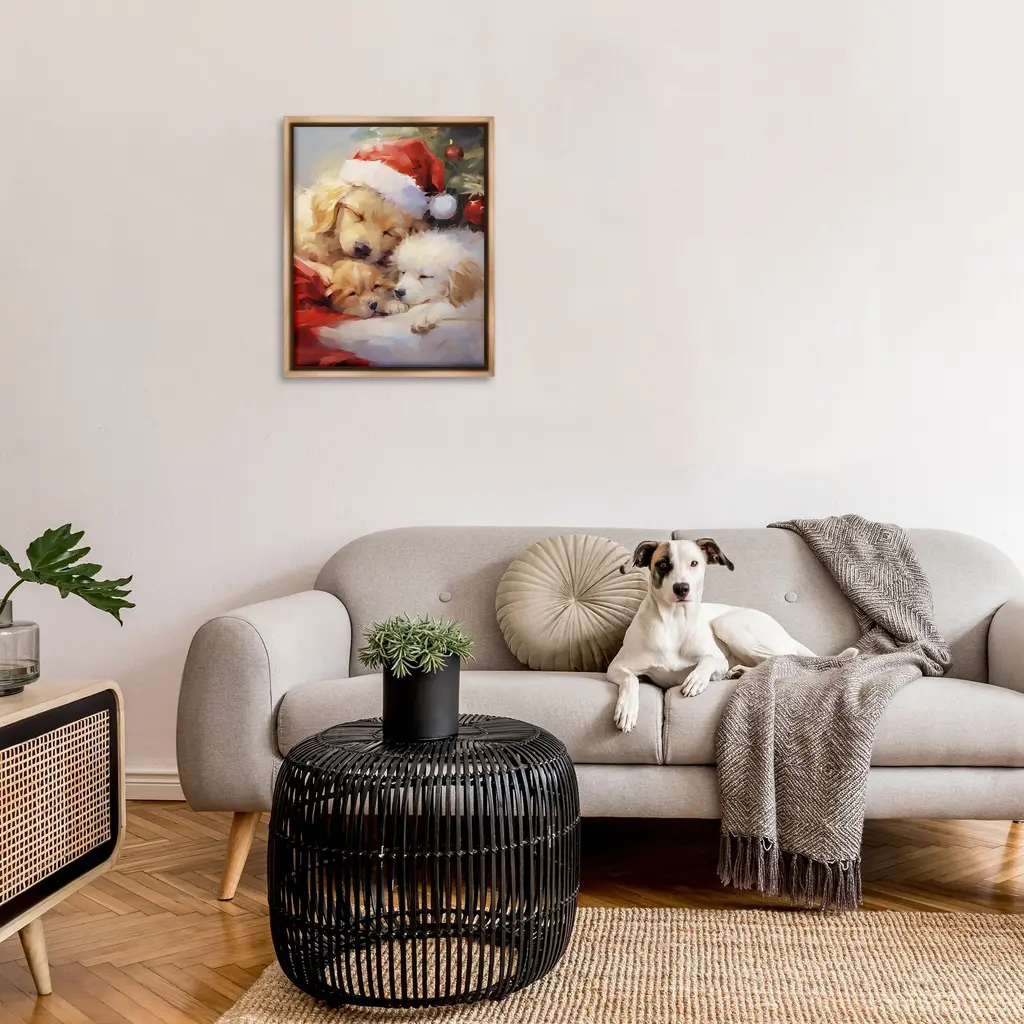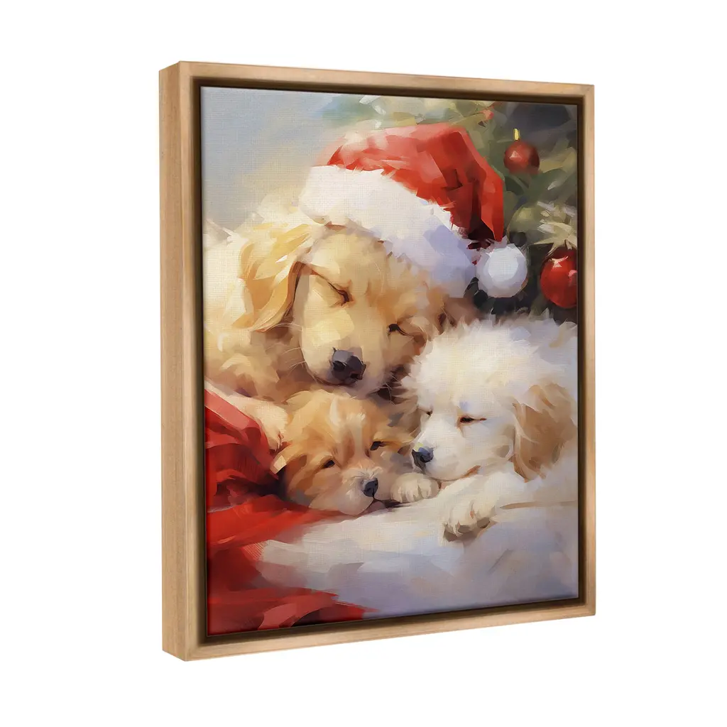 Elevate your home or office to the next level with Stupell Framed Floating Canvas Wall Art. Our premium hand-stretched canvas is mounted securely into a sturdy lightweight frame. The museum-style gap between the wrapped canvas and the box frame gives the illusion of floating artwork. Stupell Wall Art is made in the USA.Features: Dimensions: 17 x 1.7 x 21 Frame, 16 x 1.5 x 20 Canvas ArtFloating Frame Canvas Products are available in sizes 17"x21" and 25"x31". All Floating Frame Canvas Products have a 1.7" Depth.Wall Art is Ready to Hang with Hardware Free Hanging. No Installation required. For Easy Set Up Lean or Layer Artwork on Shelf or Against Wall. Artwork is Permently Fixed into the Frame.Our elevated 1.7" Thick Floating Frame is the perfect complement to our canvas style Wall Art. We use only the highest quality inks in house with industry leading printing solutions. Canvas is hand stretched over a durable wood foundation and then mounted securly into a Modern Box Frame. Made in the USA.Artwork Relates To: Animal, Canine, Dog, Mammal, Pet, Puppy, Golden Retriever, Santa Hat, Tree, Christmas, Holiday, OrnamentDesign by Enrico McGarrigle