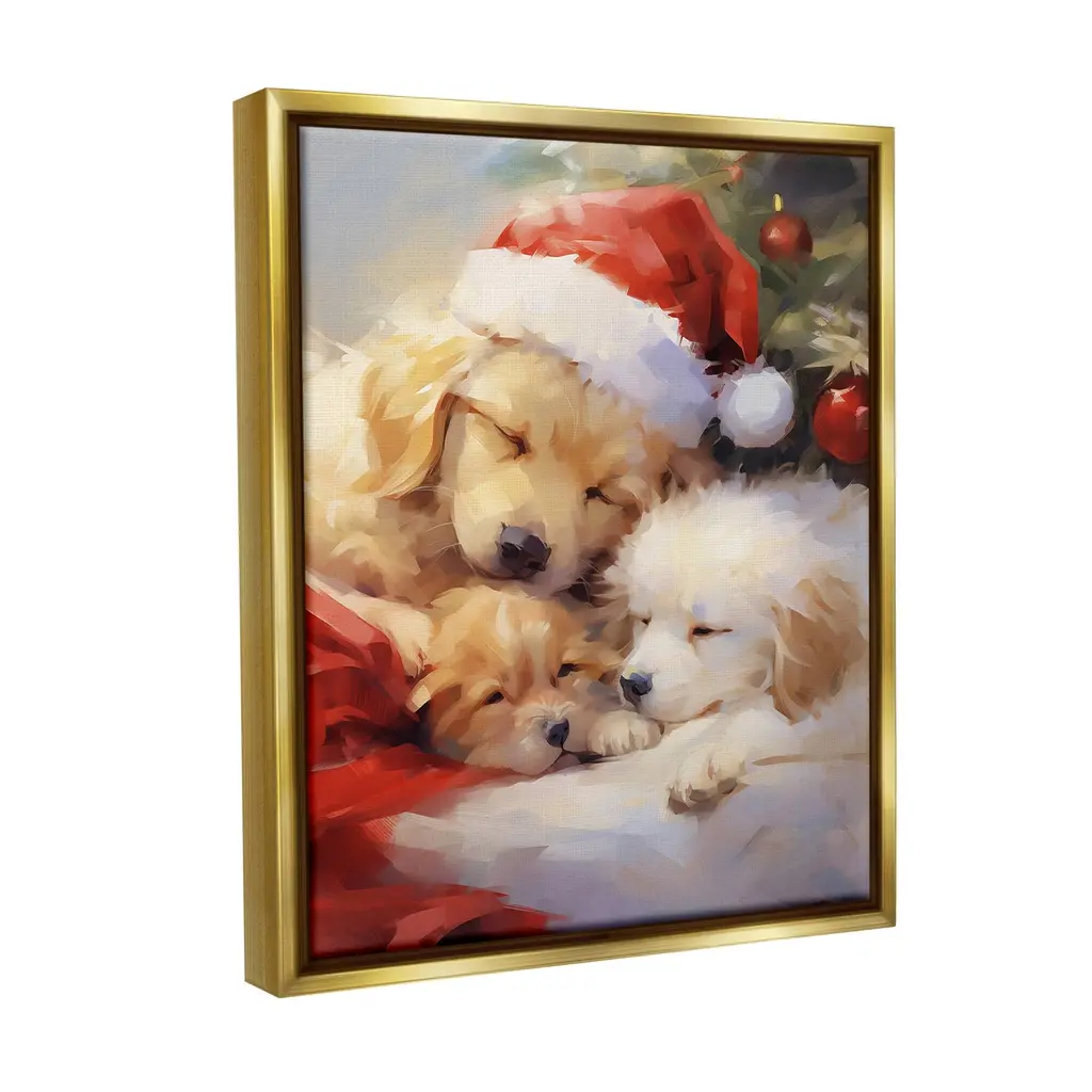 Elevate your home or office to the next level with Stupell Framed Floating Canvas Wall Art. Our premium hand-stretched canvas is mounted securely into a sturdy lightweight frame. The museum-style gap between the wrapped canvas and the box frame gives the illusion of floating artwork. Stupell Wall Art is made in the USA.Features: Dimensions: 17 x 1.7 x 21 Frame, 16 x 1.5 x 20 Canvas ArtFloating Frame Canvas Products are available in sizes 17"x21" and 25"x31". All Floating Frame Canvas Products have a 1.7" Depth.Wall Art is Ready to Hang with Hardware Free Hanging. No Installation required. For Easy Set Up Lean or Layer Artwork on Shelf or Against Wall. Artwork is Permently Fixed into the Frame.Our elevated 1.7" Thick Floating Frame is the perfect complement to our canvas style Wall Art. We use only the highest quality inks in house with industry leading printing solutions. Canvas is hand stretched over a durable wood foundation and then mounted securly into a Modern Box Frame. Made in the USA.Artwork Relates To: Animal, Canine, Dog, Mammal, Pet, Puppy, Golden Retriever, Santa Hat, Tree, Christmas, Holiday, OrnamentDesign by Enrico McGarrigle