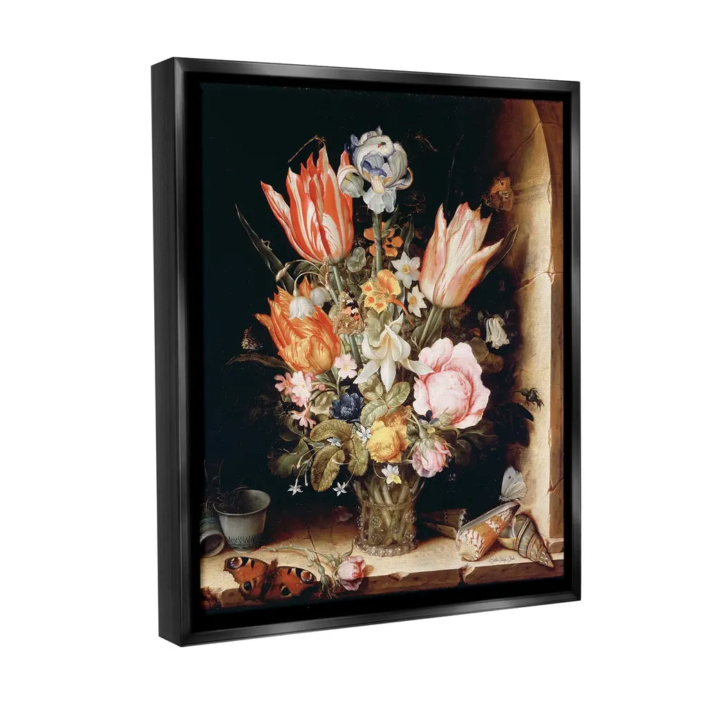 Elevate your home or office to the next level with Stupell Framed Floating Canvas Wall Art. Our premium hand-stretched canvas is mounted securely into a sturdy lightweight frame. The museum-style gap between the wrapped canvas and the box frame gives the illusion of floating artwork. Stupell Wall Art is made in the USA.Features: Dimensions: 17 x 1.7 x 21 Frame, 16 x 1.5 x 20 Canvas ArtFloating Frame Canvas Products are available in sizes 17"x21" and 25"x31". All Floating Frame Canvas Products have a 1.7" Depth.Wall Art is Ready to Hang with Hardware Free Hanging. No Installation required. For Easy Set Up Lean or Layer Artwork on Shelf or Against Wall. Artwork is Permently Fixed into the Frame.Our elevated 1.7" Thick Floating Frame is the perfect complement to our canvas style Wall Art. We use only the highest quality inks in house with industry leading printing solutions. Canvas is hand stretched over a durable wood foundation and then mounted securly into a Modern Box Frame. Made in the USA.Artwork Relates To: Flower, Bouquet, Plant, Floral, Jar, Dahlia, Petal, Vintage, Traditional, Seashell, Butterfly, Still Life, Classic, TulipDesign by Stellar Design Studio