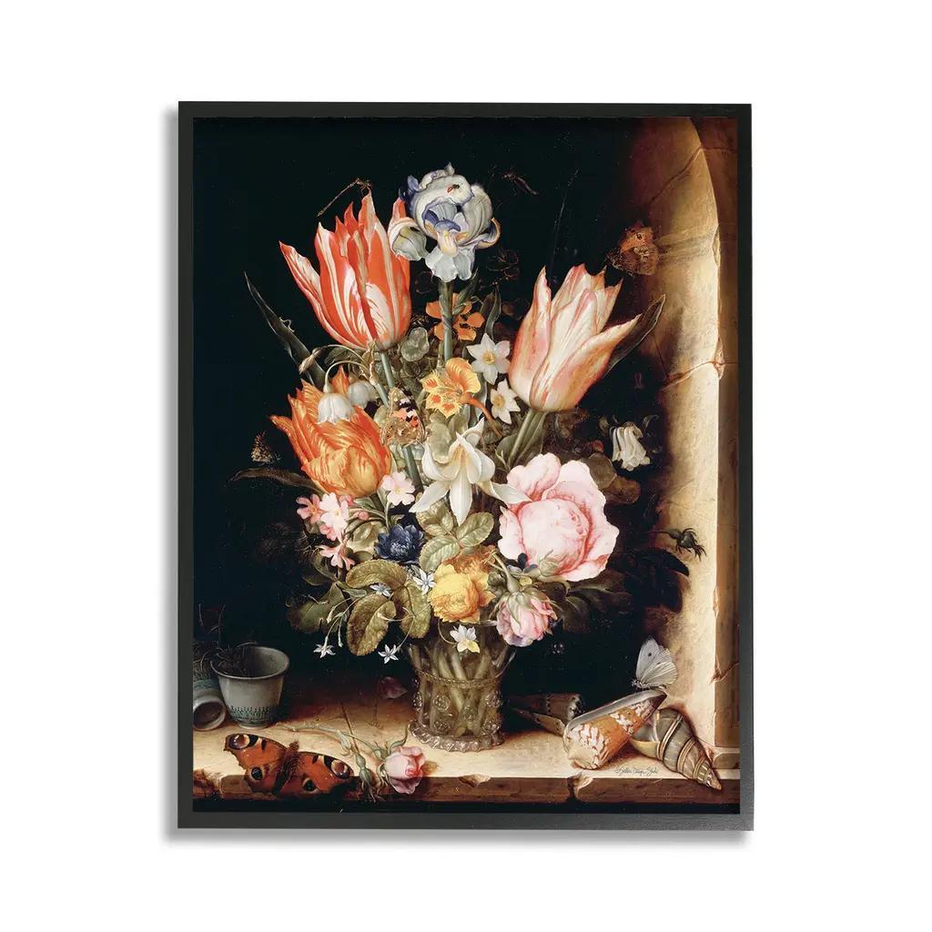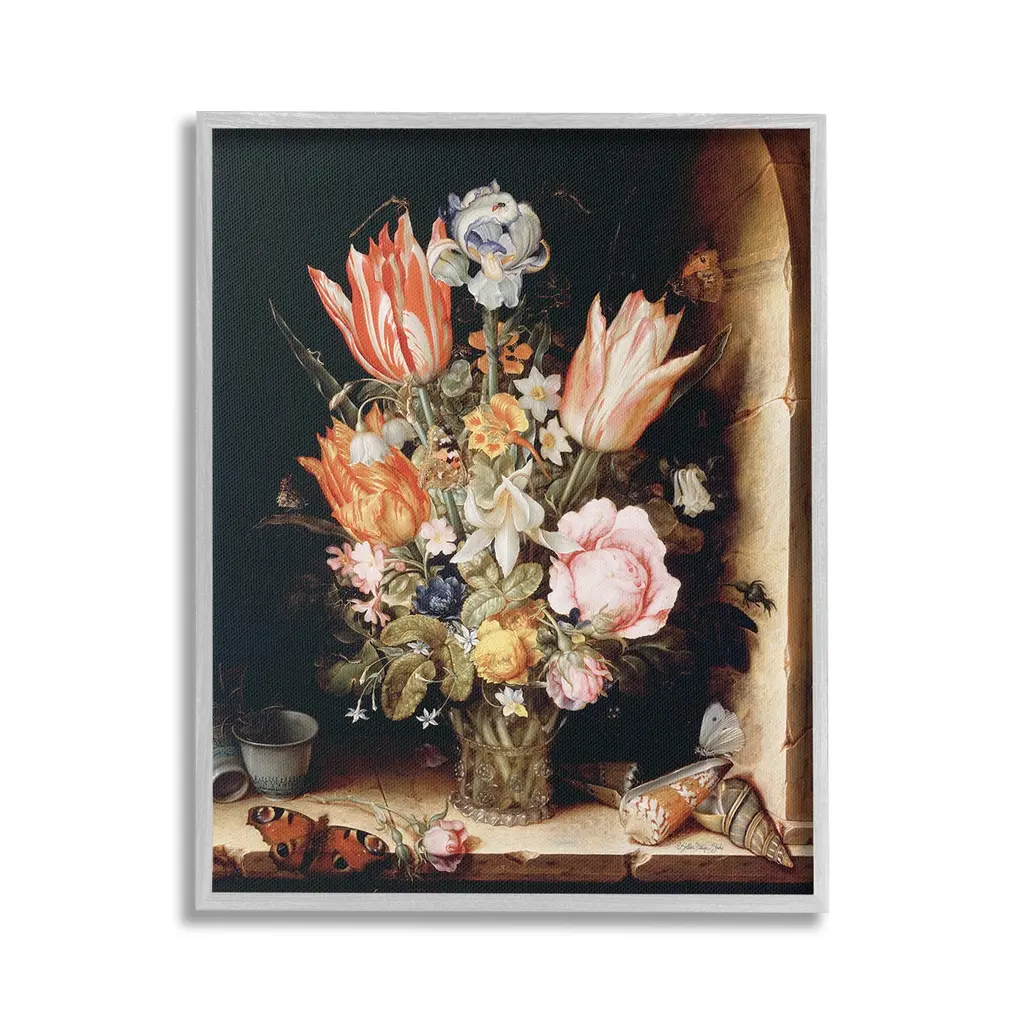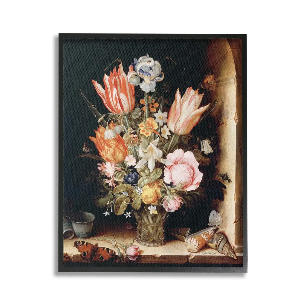 Elevate your home or office to the next level with Stupell Framed Floating Canvas Wall Art. Our premium hand-stretched canvas is mounted securely into a sturdy lightweight frame. The museum-style gap between the wrapped canvas and the box frame gives the illusion of floating artwork. Stupell Wall Art is made in the USA.Features: Dimensions: 17 x 1.7 x 21 Frame, 16 x 1.5 x 20 Canvas ArtFloating Frame Canvas Products are available in sizes 17"x21" and 25"x31". All Floating Frame Canvas Products have a 1.7" Depth.Wall Art is Ready to Hang with Hardware Free Hanging. No Installation required. For Easy Set Up Lean or Layer Artwork on Shelf or Against Wall. Artwork is Permently Fixed into the Frame.Our elevated 1.7" Thick Floating Frame is the perfect complement to our canvas style Wall Art. We use only the highest quality inks in house with industry leading printing solutions. Canvas is hand stretched over a durable wood foundation and then mounted securly into a Modern Box Frame. Made in the USA.Artwork Relates To: Flower, Bouquet, Plant, Floral, Jar, Dahlia, Petal, Vintage, Traditional, Seashell, Butterfly, Still Life, Classic, TulipDesign by Stellar Design Studio