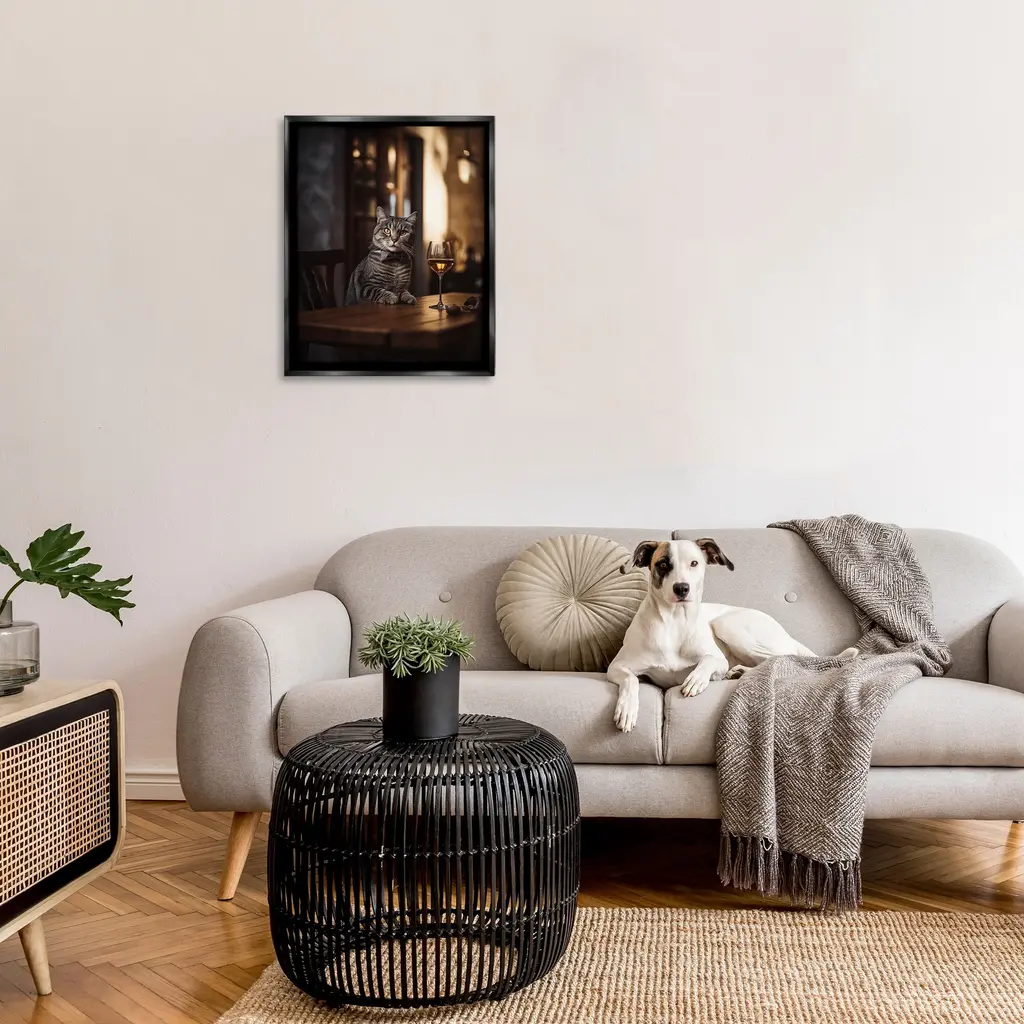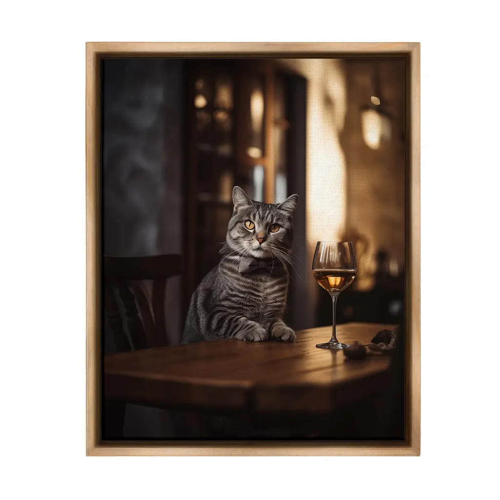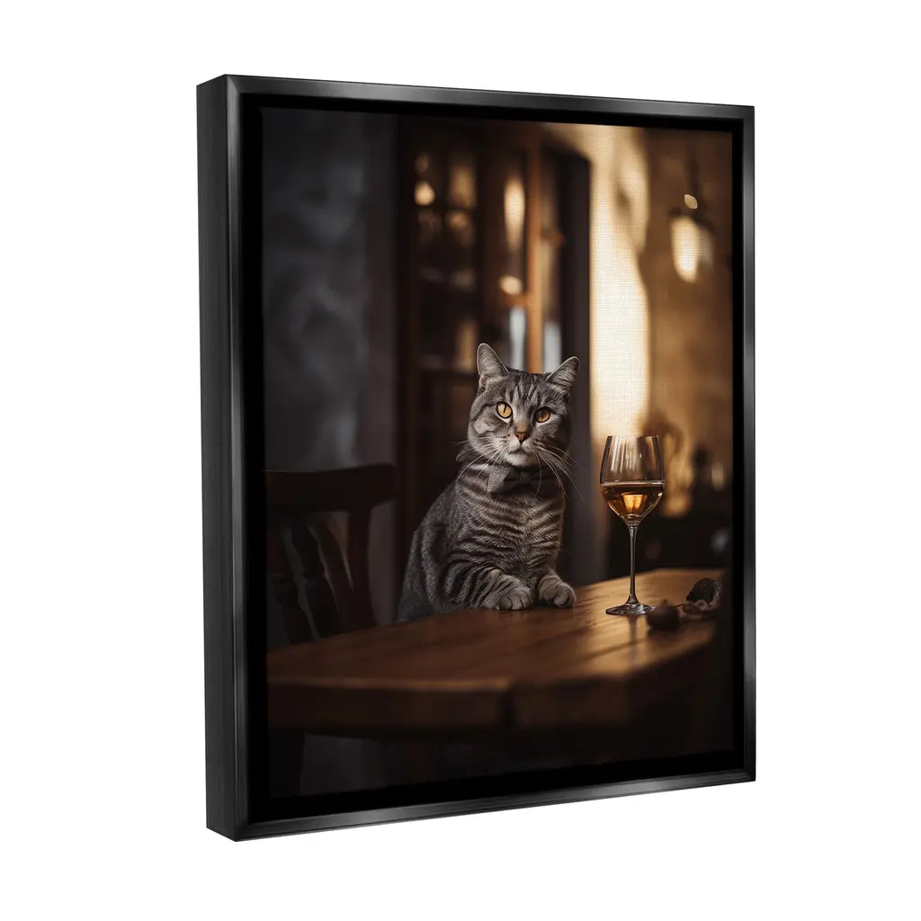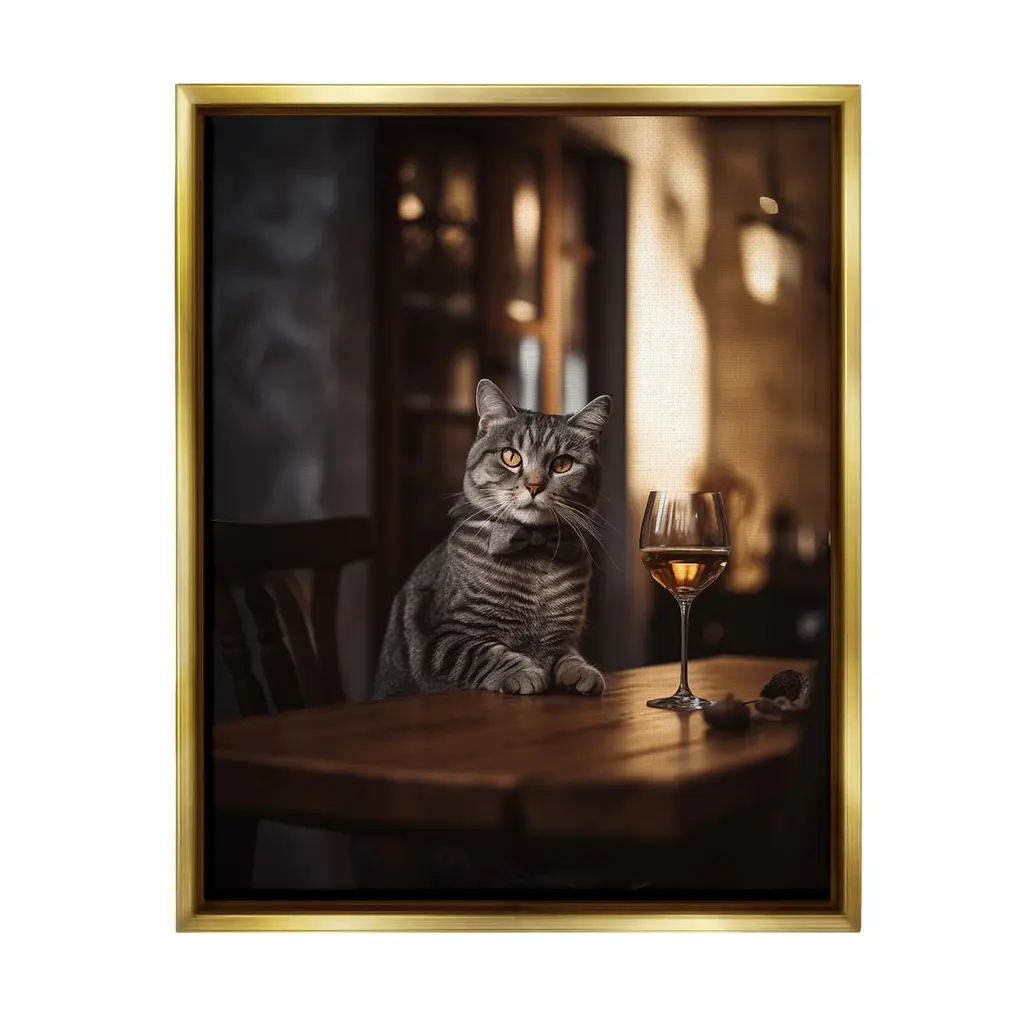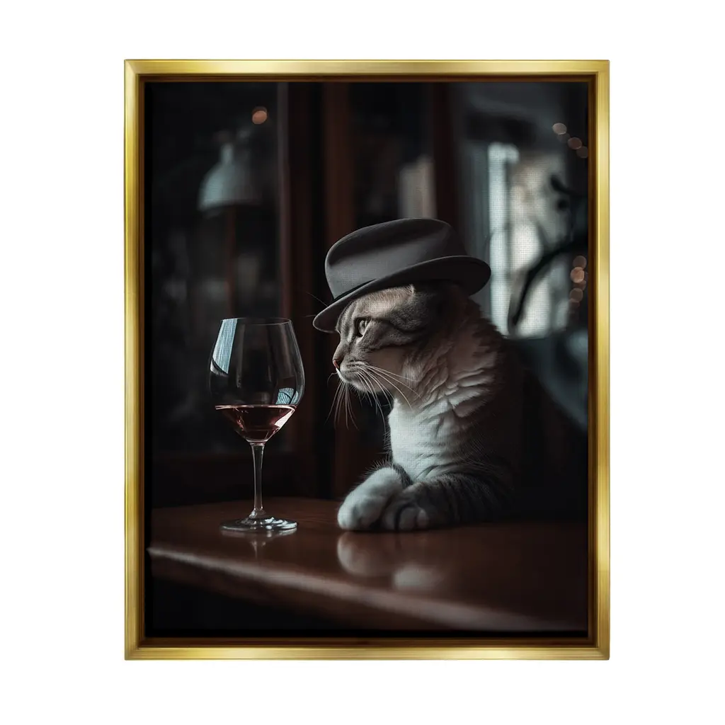Elevate your home or office to the next level with Stupell Framed Floating Canvas Wall Art. Our premium hand-stretched canvas is mounted securely into a sturdy lightweight frame. The museum-style gap between the wrapped canvas and the box frame gives the illusion of floating artwork. Stupell Wall Art is made in the USA.Features: Dimensions: 17 x 1.7 x 21 Frame, 16 x 1.5 x 20 Canvas ArtFloating Frame Canvas Products are available in sizes 17"x21" and 25"x31". All Floating Frame Canvas Products have a 1.7" Depth.Wall Art is Ready to Hang with Hardware Free Hanging. No Installation required. For Easy Set Up Lean or Layer Artwork on Shelf or Against Wall. Artwork is Permently Fixed into the Frame.Our elevated 1.7" Thick Floating Frame is the perfect complement to our canvas style Wall Art. We use only the highest quality inks in house with industry leading printing solutions. Canvas is hand stretched over a durable wood foundation and then mounted securly into a Modern Box Frame. Made in the USA.Artwork Relates To: Glass, Alcohol, Beverage, Liquor, Wine, Animal, Cat, Mammal, Pet, Bar, HatDesign by Ziwei Li